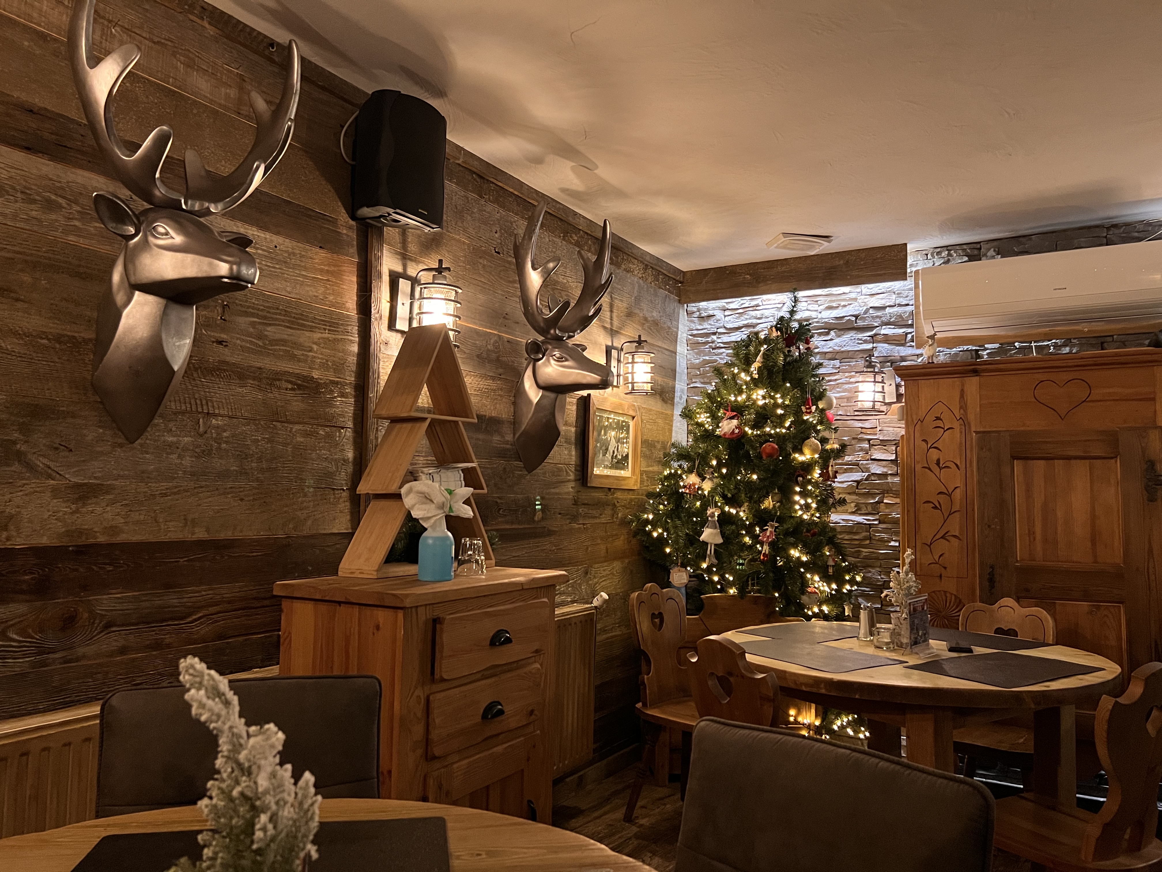 Ambiance châlet de montagne. Plats savoyards généreux. En extérieur de minis chalets avec une très jolie déco de Noël pour le plaisir des yeux des enfants.
