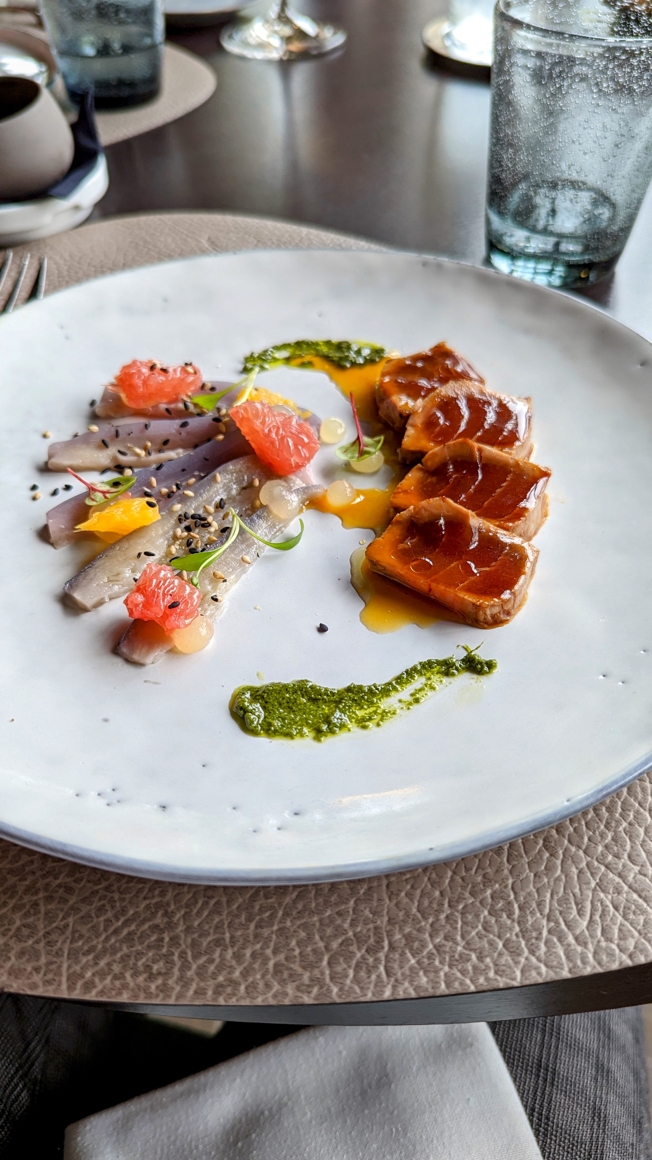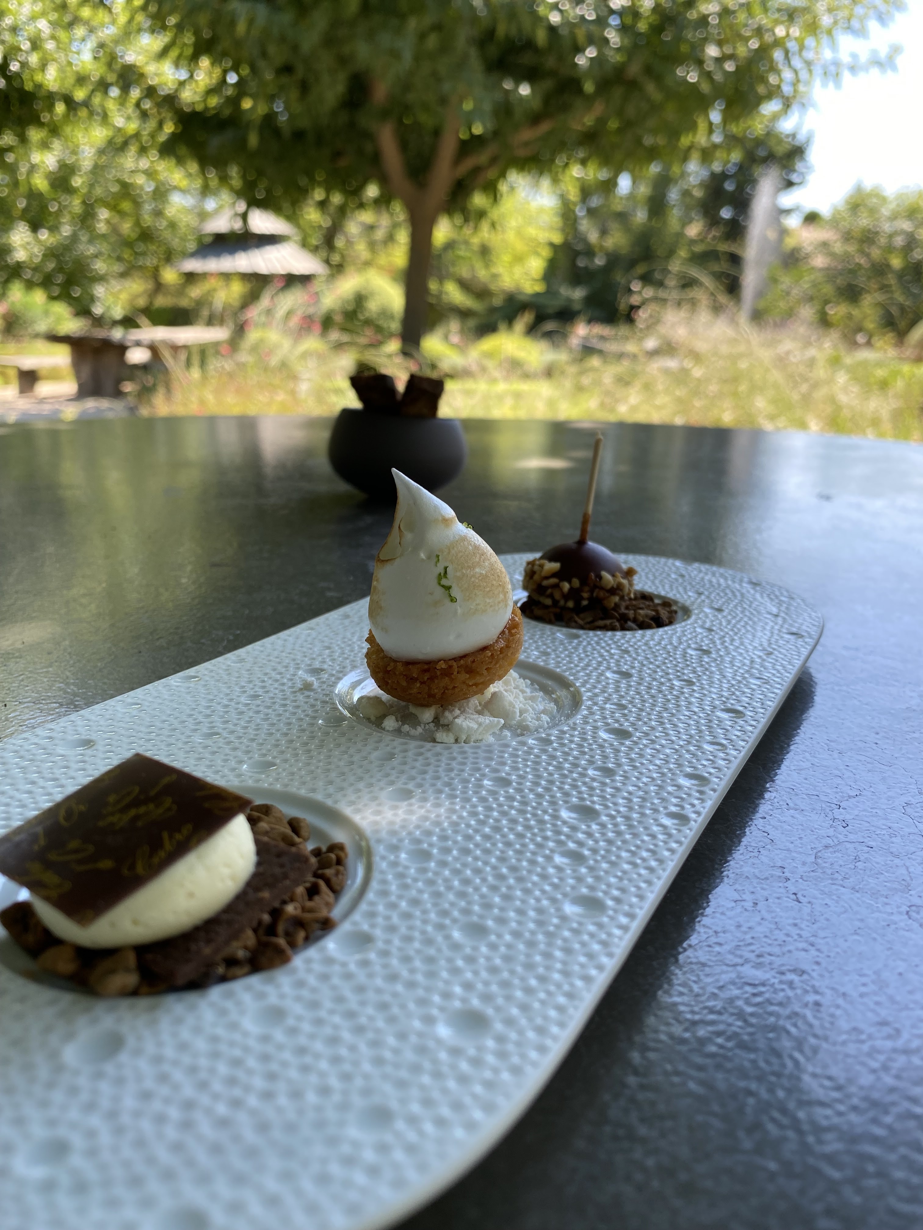 Un très bon moment. L’endroit est sublime avec sa terrasse bien ombragée et une vue sur le magnifique jardin. Les plats sont globalement raffinés, avec des mélanges de saveurs inattendus et bien choisis. Néanmoins, Certains plats étaient moins satisfaisants : trop fades pour l’entrée de langoustines et un peu de nerfs pour le morceaux de thon tataki. Nos coups de cœur sont pour l’accompagnement du thon (poivron farci à la polenta/chorizo et sa sauce) et le sublime dessert aux mûres !