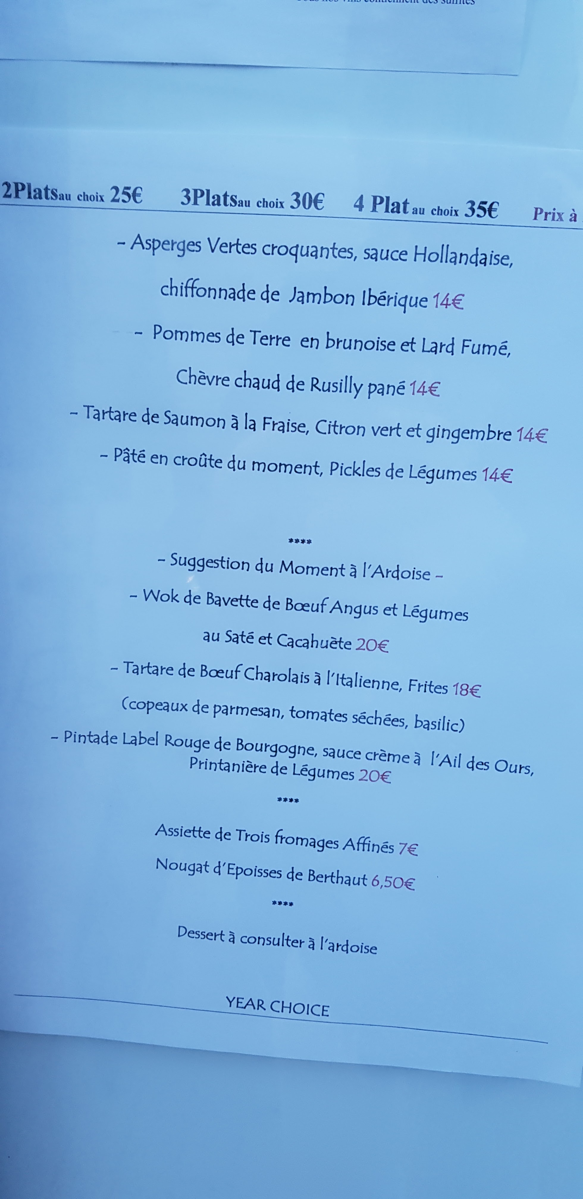 Le repas était excellent et le plat (morceau de boeuf, sauce foie gras, pomme de terre grenaille) était une tuerie ! Je recommande ! Si au passage vous pouvez me transmettre la référence de votre vin rouge Maranges, car il nous a beaucoup plu 😊