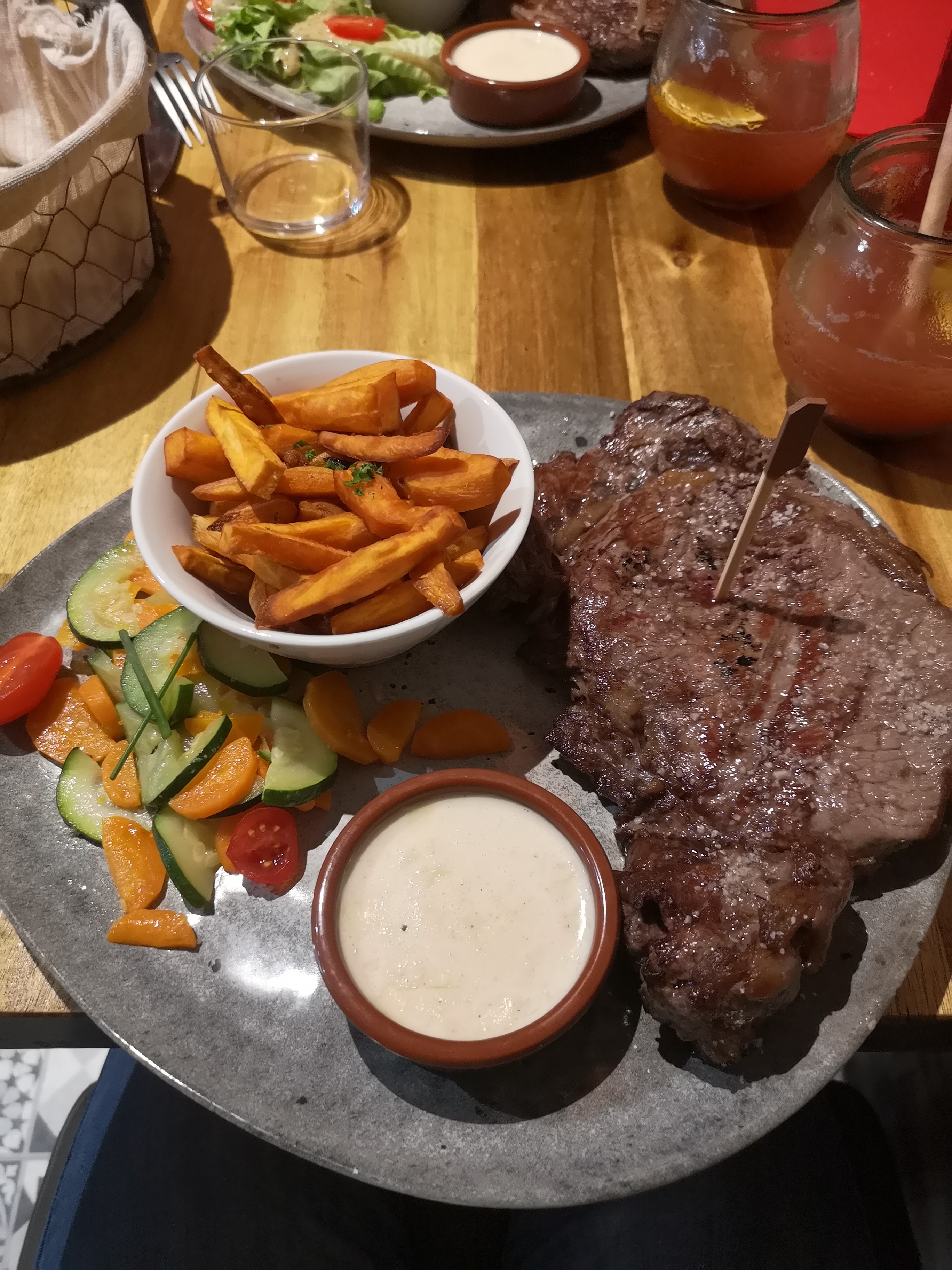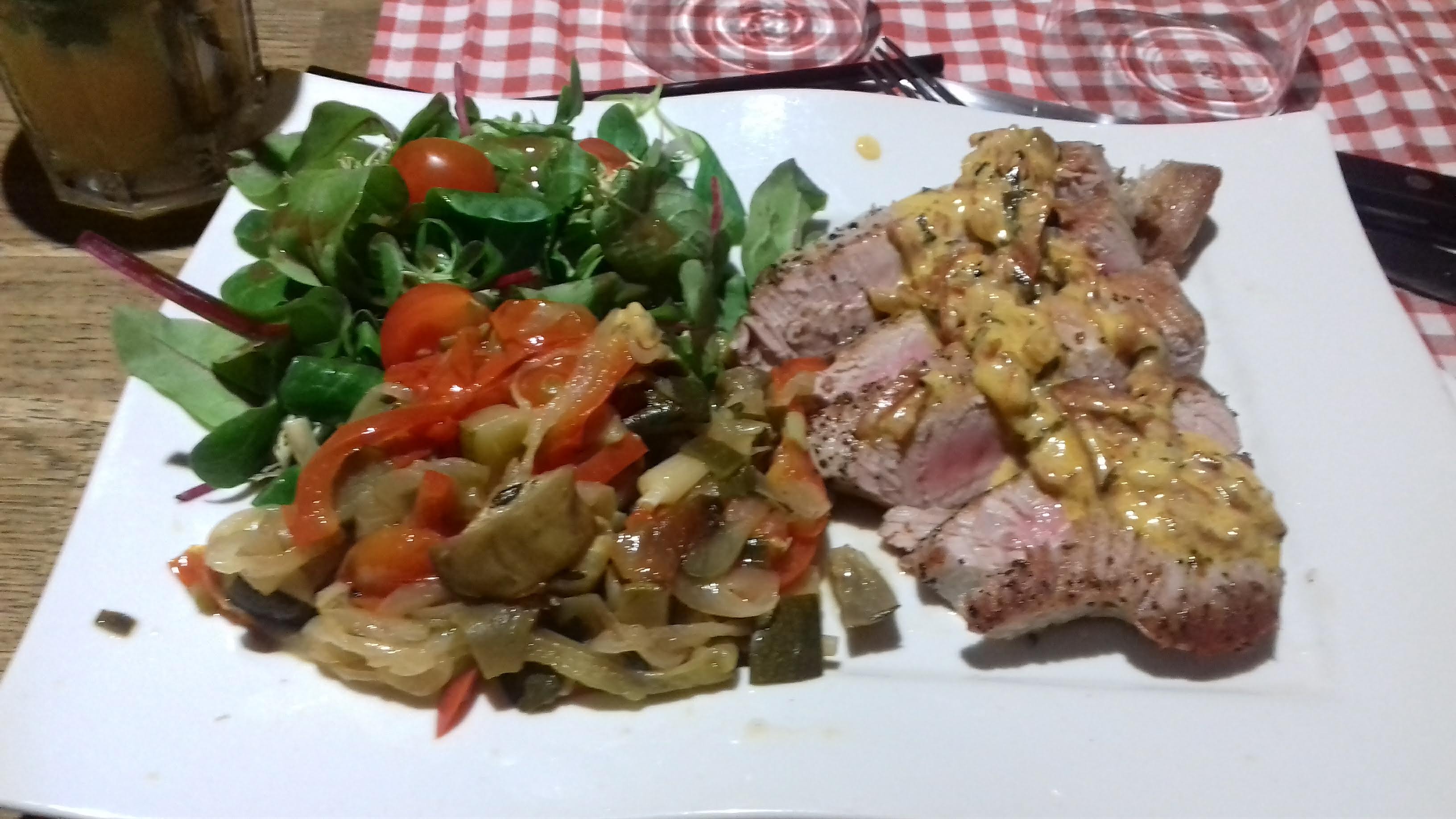 C ' est un lieu conviviale. Légumes cuits au grille ( frais !) Et j ' ai aimé manger mon steak très très bleu comme je l ' avais commander .