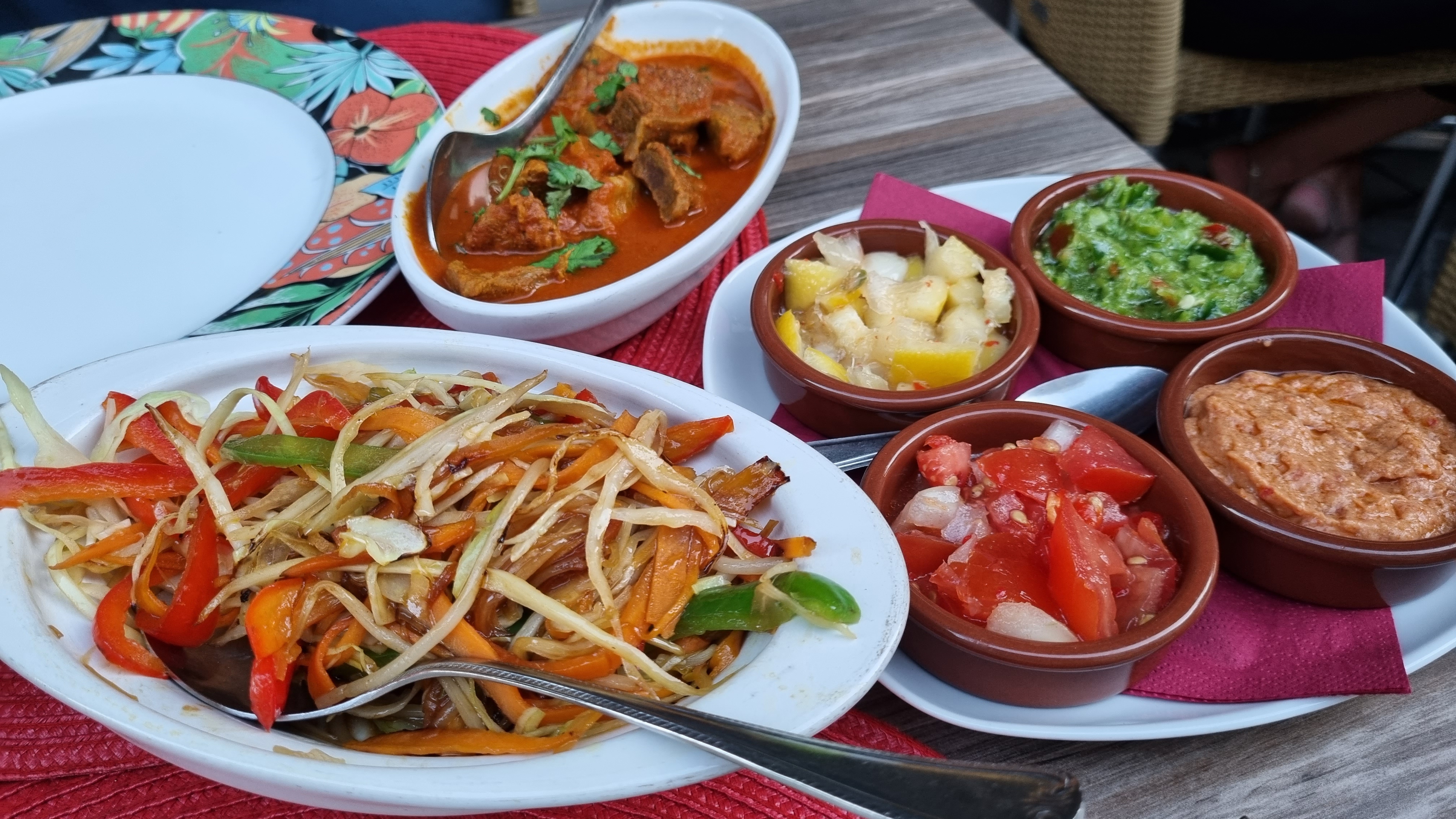 Super endroit pour goûter à des plats typiques de l'île de la Réunion. Le cabri poisson était excellent posé sur une portion de riz. Mis à part dans des petites coupes, des rougails tomates, piments verts, cacahuète et citron étaient à disposition. Un véritable délice exotique 🥥