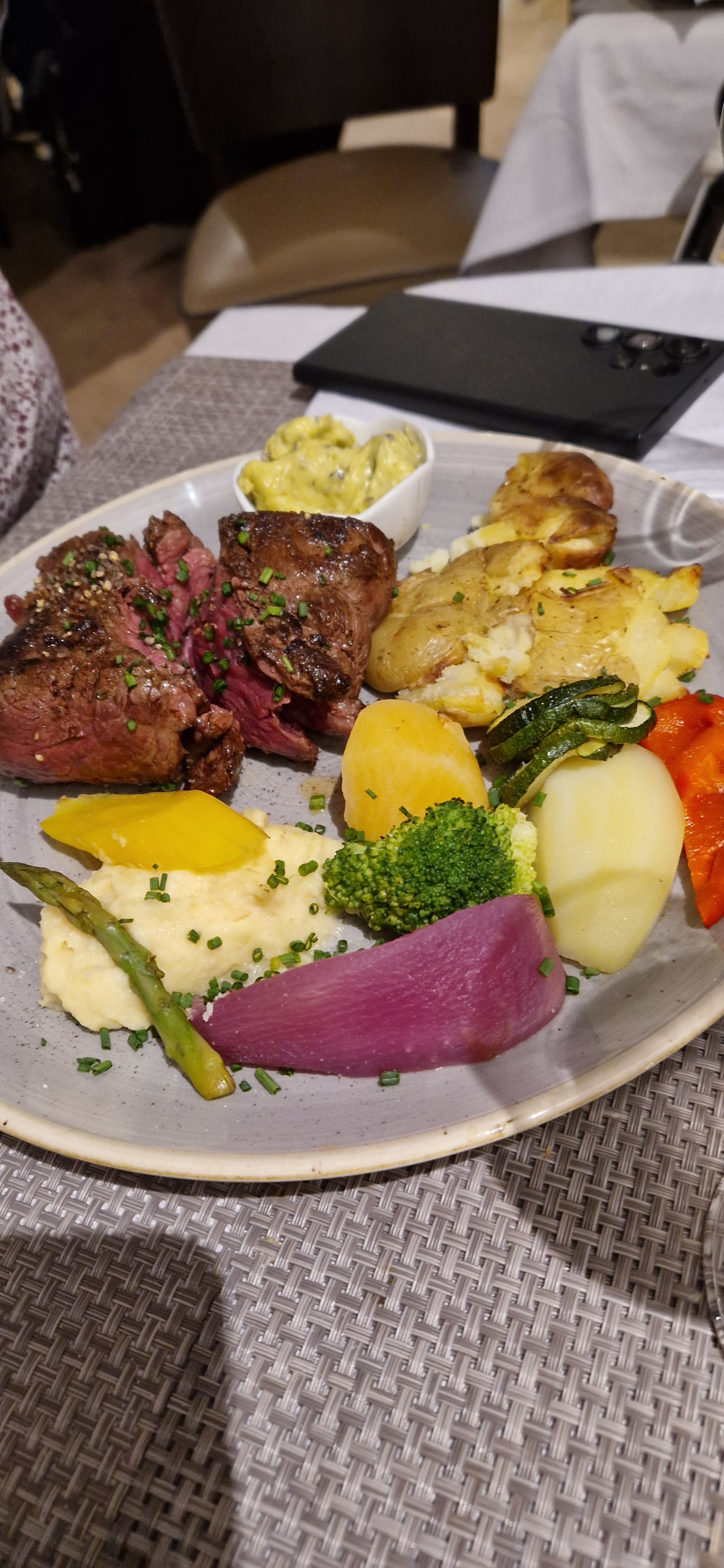 Restaurant convivial, service rapide, grand choix à la carte mais rien pour les vegans, plats copieux, desserts manque d'originalité.