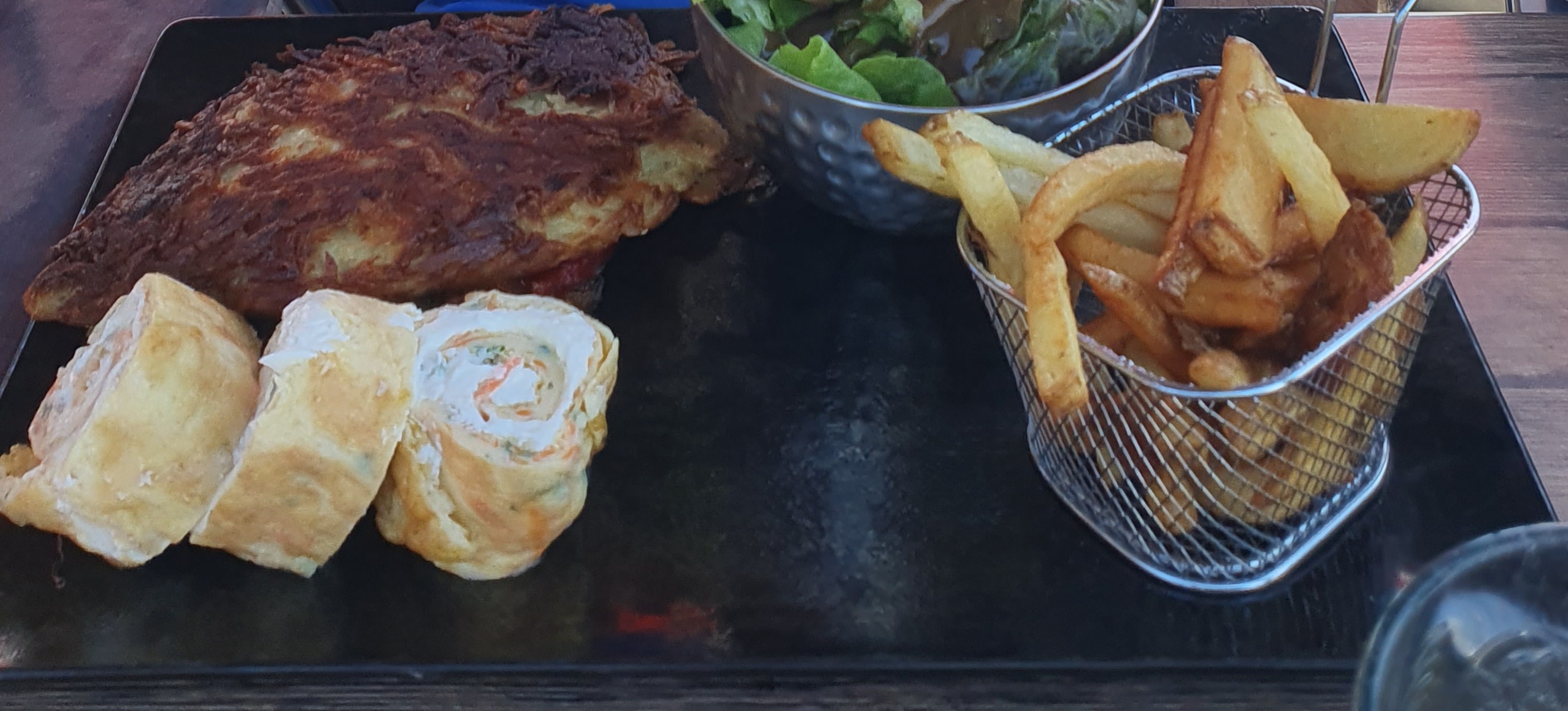 Belles assiettes très copieuses. Bonne playlist ! Juste un détail pour les grands, bien baisser la tête en sortie de WC, à 1,90 m je me suis bien pris le montant supérieur sur le sommet du crâne 🙃