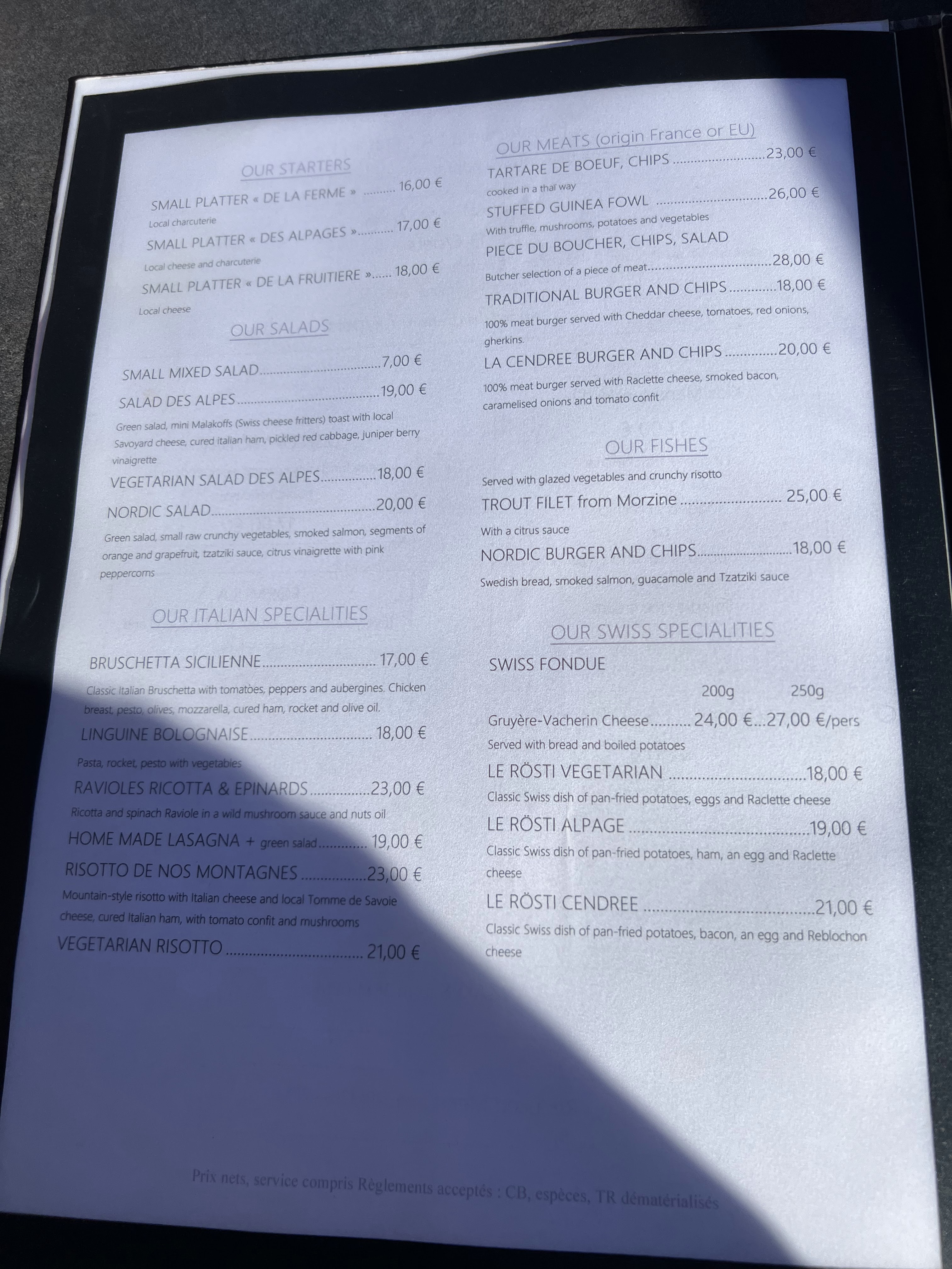 Tout est parfait ! Autant la qualité de l’accueil que celle des très bons plats proposés à la carte ! En plus, l’équipe prodigue tous les conseils et donne ses adresses secrètes pour passer un excellent séjour à Morzine! Nous y venons tous les jours et sommes toujours aussi bien accueillis.