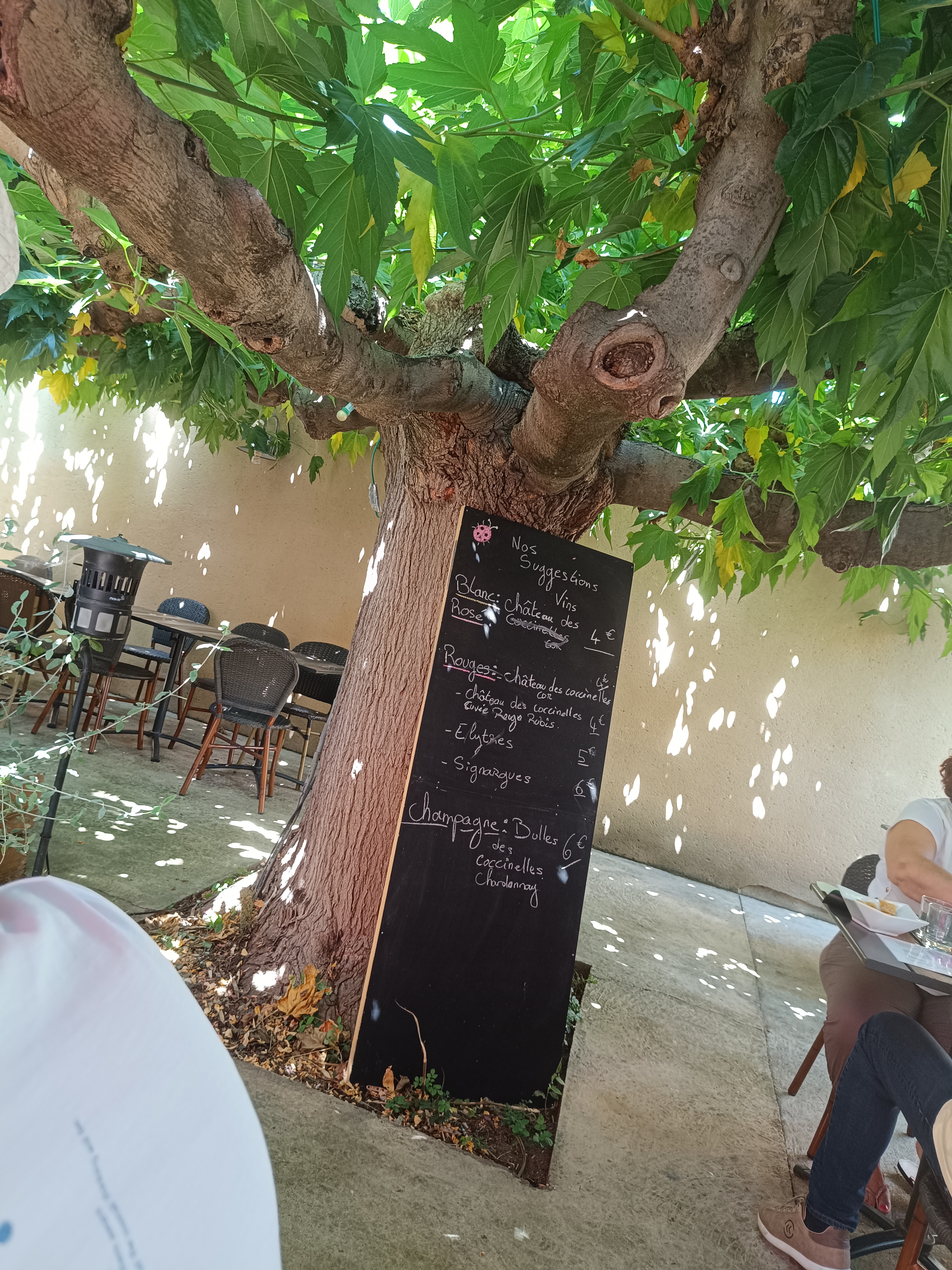 Arrière, cour, ombragée très agréable. Accepte les chiens avec en prime une gamelle d’eau