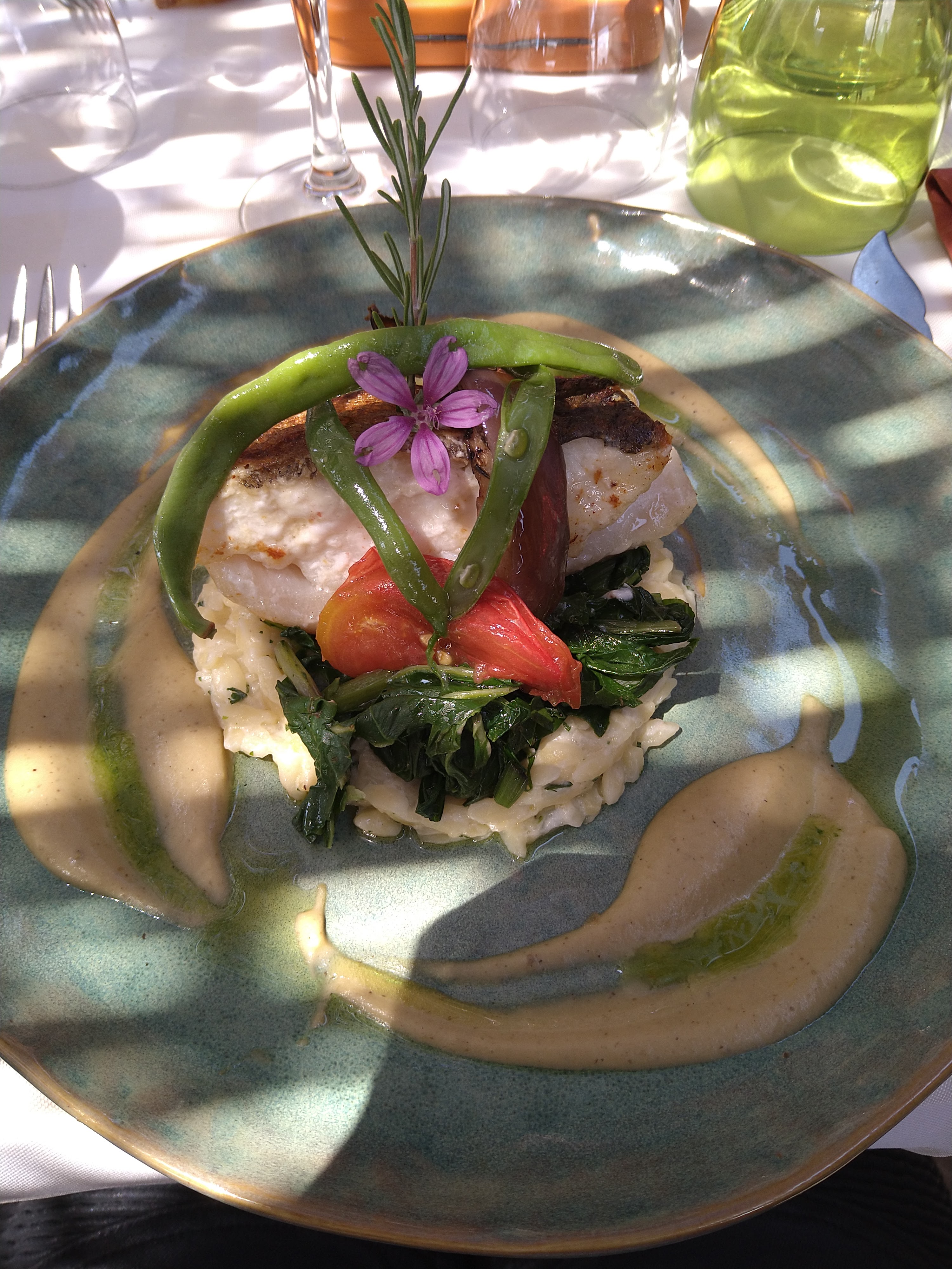 Excellente cuisine: des légumes frais cuits à la perfection, un carré d'agneau généreux et à point, un gaspacho impeccable et frais à souhait en entrée, et une pêche Melba faite avec une pêche fraîche pochée; une excellente terrine, une rascasse parfaitement cuisinée, un yaourt maison aux fruits frais, un côtes du Rhône léger et une bouteille d'eau gazeuse, le tout pour 100€ tout rond pour deux. Certes le service n'est pas digne d'une table étoilée, mais la cuisine l'est, et c'est ce qui compte. Assis sur une terrasse ombragée, dans un cadre magnifique, nous avons commencé nos vacances en beauté. Merci!