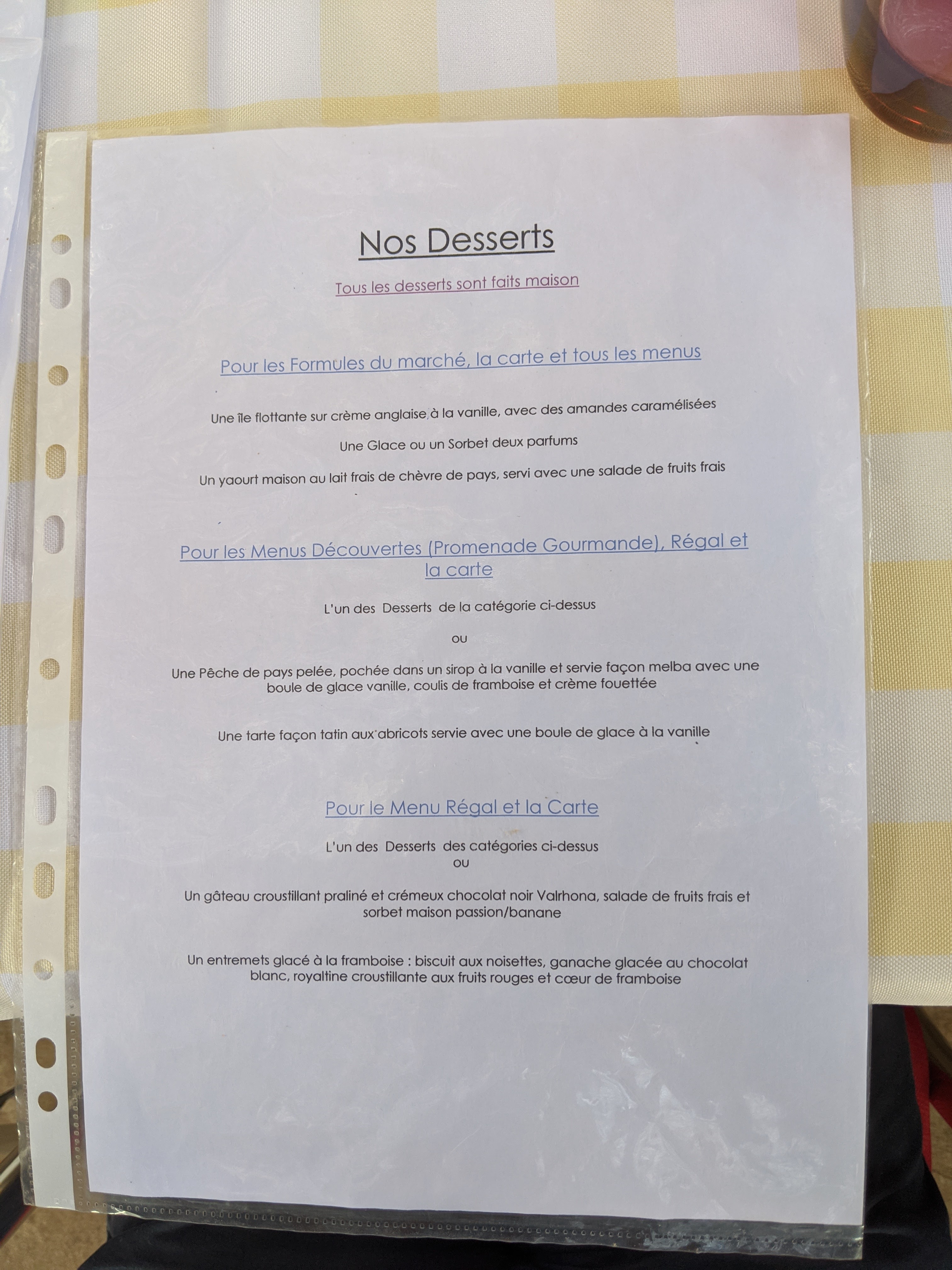 Menu du jour, en semaine, bien équilibré et excellent. Le service est rapide et efficace. Les autres menus donnent envie de revenir dans cette belle petite auberge où l'on est super bien reçu.