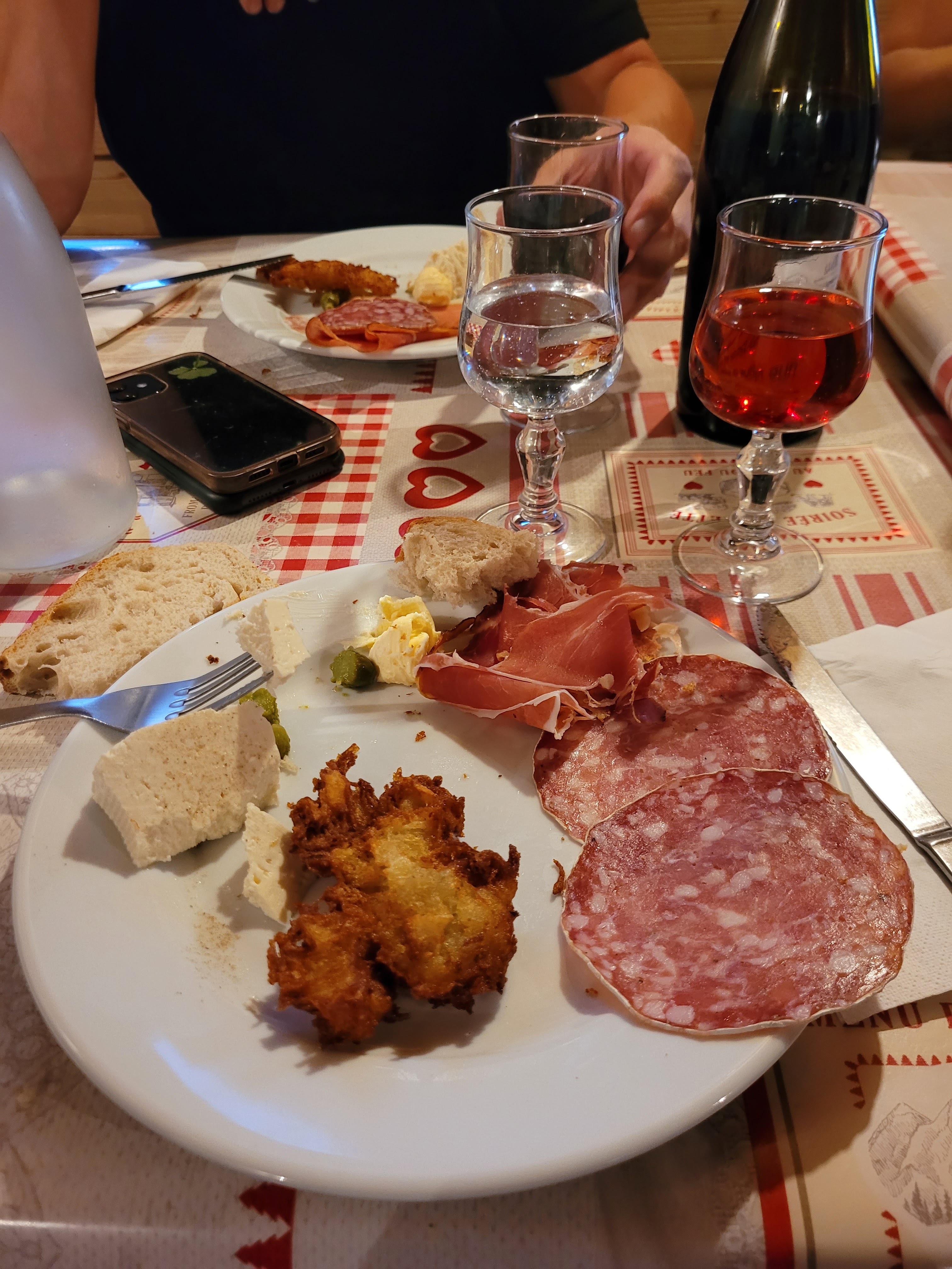 Repas beignets de patates charcuterie salade verte . Terrasse du bas un peu ventée mais sympa... vue magnifique !
