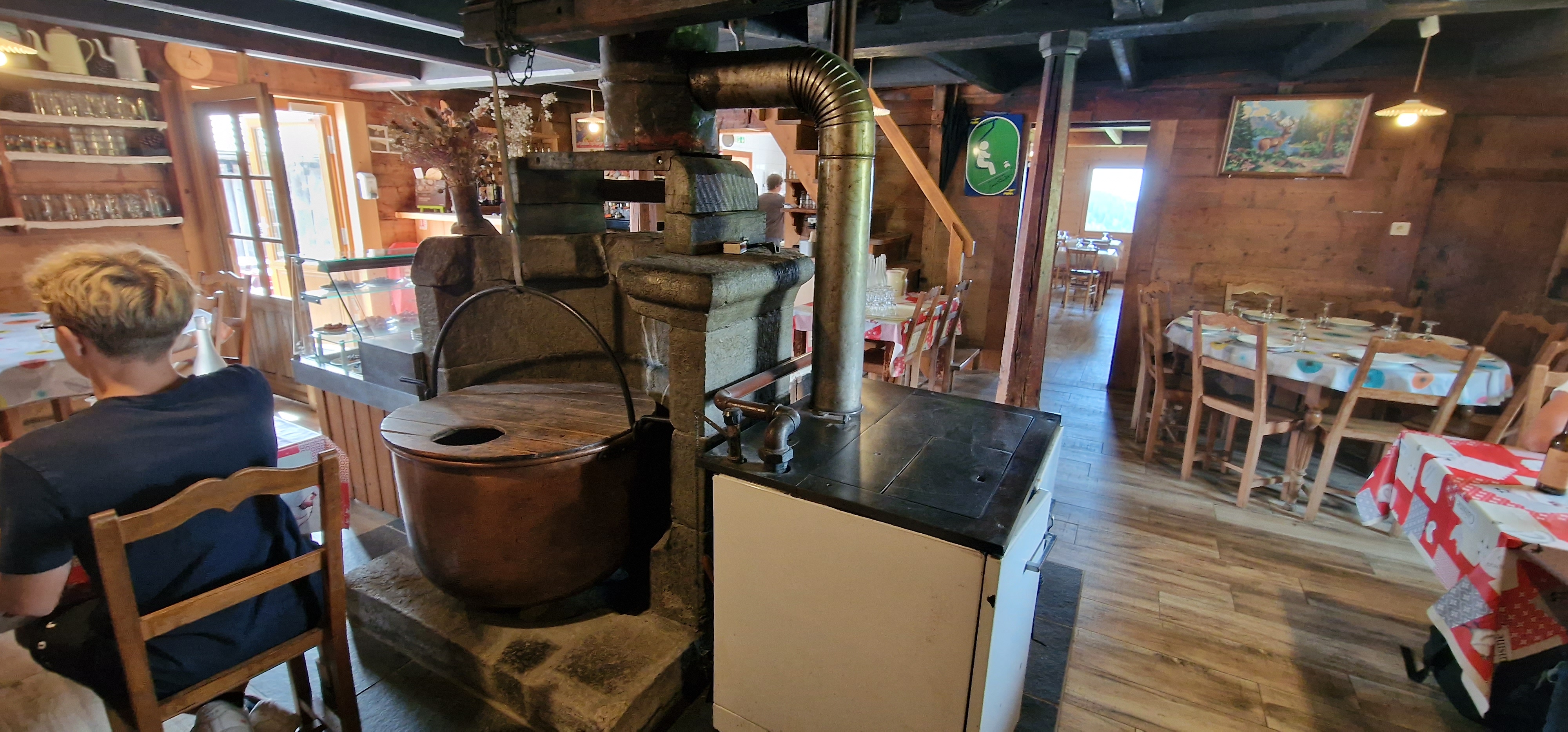 Comme chez pépé et mémé. Toile cirée et vaisselle sans fioritures. Carte très simple mais qui va très bien avec le lieu. Et un cadre réussi avec une cheminée encore équipé de son chaudron à reblochons et ses quelques jambons qui sèchent.