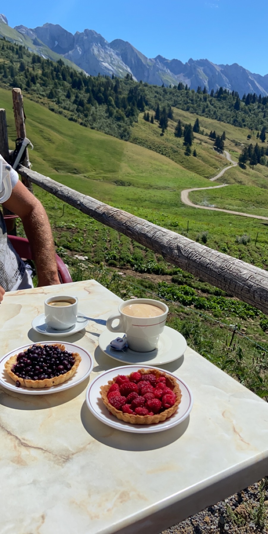 Dans un cadre très charmant, au plus proche de la montagne, un déjeuner très simple mais de qualité ! Les fameux beignets de pomme de terre, charcuterie et fromage local … tartes, l’une aux framboises, une autre myrtilles et une dernière aux abricots. Vue superbe pour ce déjeuner en terrasse. Personnel aux petits soins et très dynamiques 👍