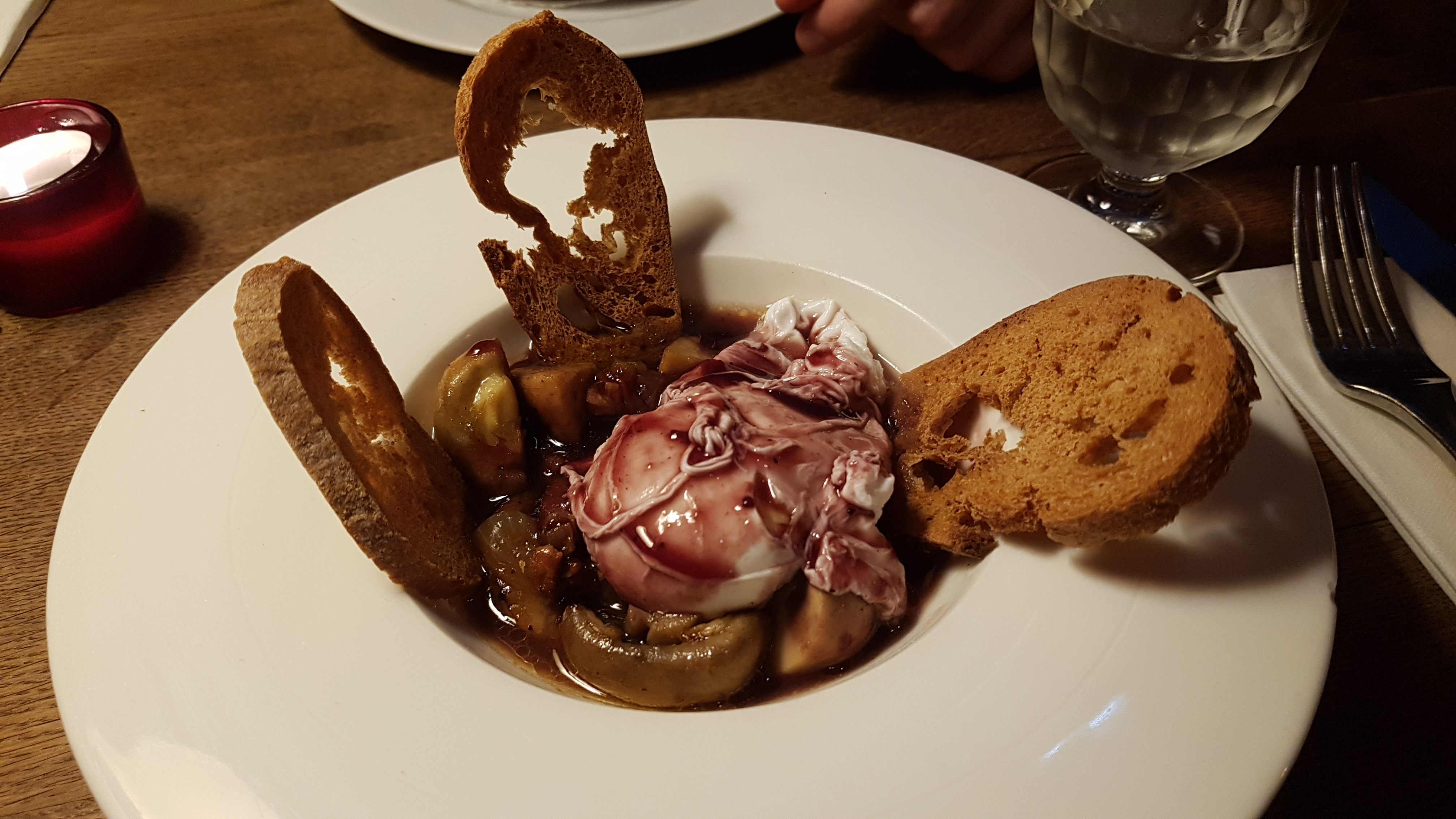 Très bonne expérience. La salle est vraiment magnifique, l'accueil et le service parfaits, et le repas délicieux, nourrissant voire riche mais parfaitement dosé, à recommander sans hésiter. D'une rue très passante et touristique, en franchissant la porte, vous arrivez dans un mélange d'esthétique médiéval et de charme d'un très bon petit restaurant de campagne... Et vous en ressortirez heureux ! Nota : p'tite déception avec la bière locale, version IPA. Assez quelconque. Je conseille de tester autre chose.