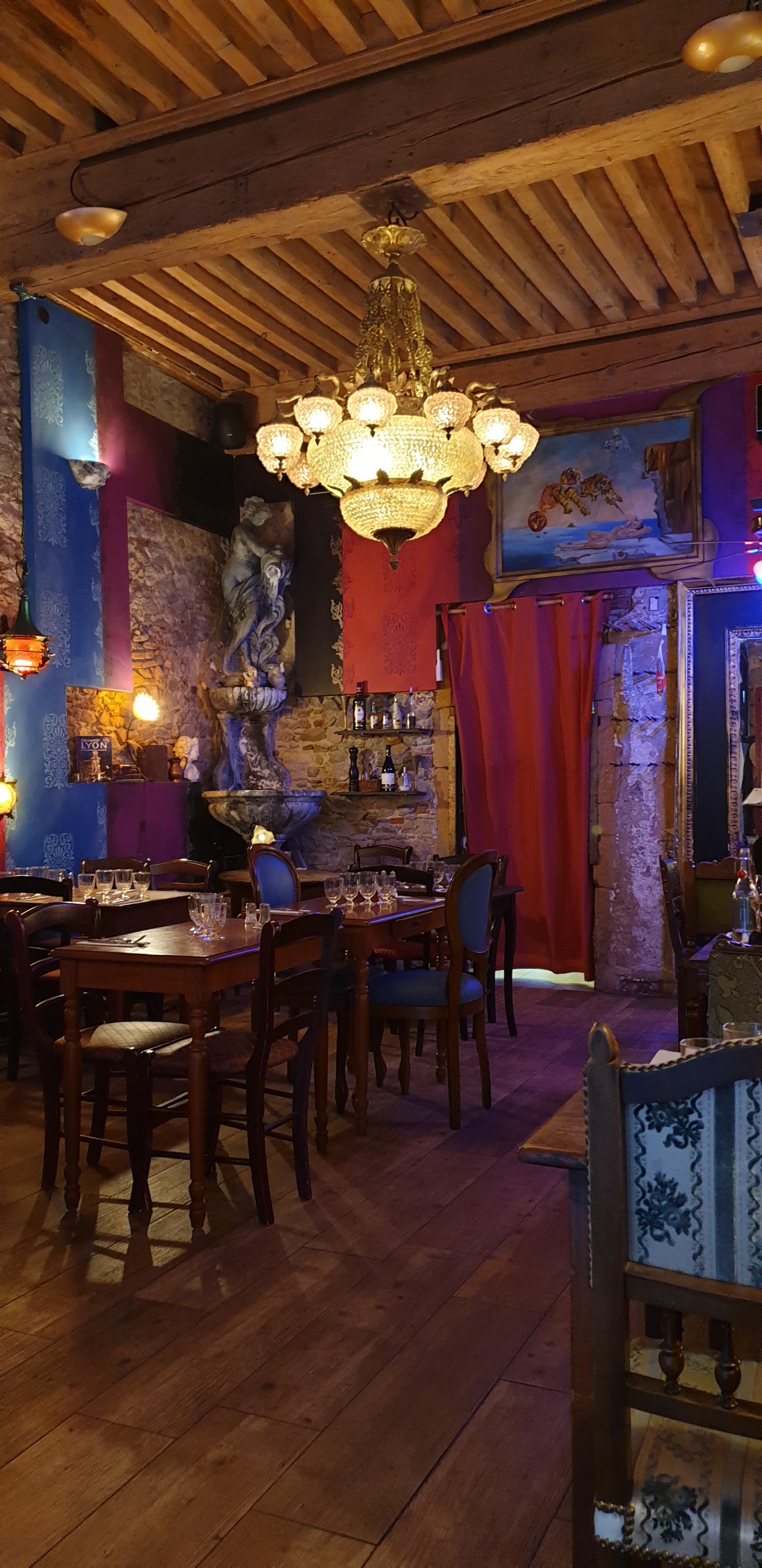 restaurant atypique , style baroque dans une ambiance chaleureuse, personnel agréable et cuisine très bonne, les quenelles par exemple, le rapport qualité prix est très correct, bonne soirée dans se magique et magnifique vieux Lyon…