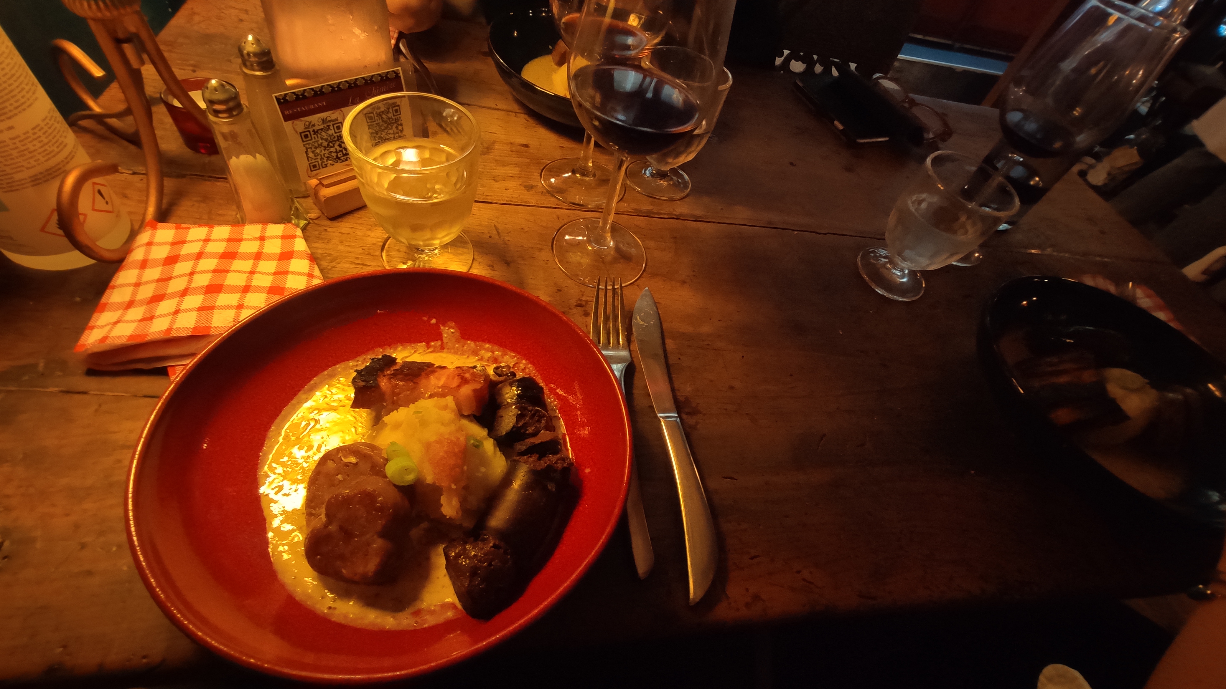 Ambiance loufoque ! Des clients chieurs qui font un esclandre, limite bagarre et qui vont jusqu'à appeler la police pour 1 ticket vacances refusé... Ils ont dû payer bien sûr ! Eeeet oui, dépense le ailleurs ton ticket ! Il n'est pas perdu ! Arpagon que tu es... Sinon, ambiance feutrée, intime et calme, la petite serveuse qui était là en extra pour la première fois, très sympathique, des plats regionaux généreux, tarifs plus que corrects bref, on y reviendra🙂