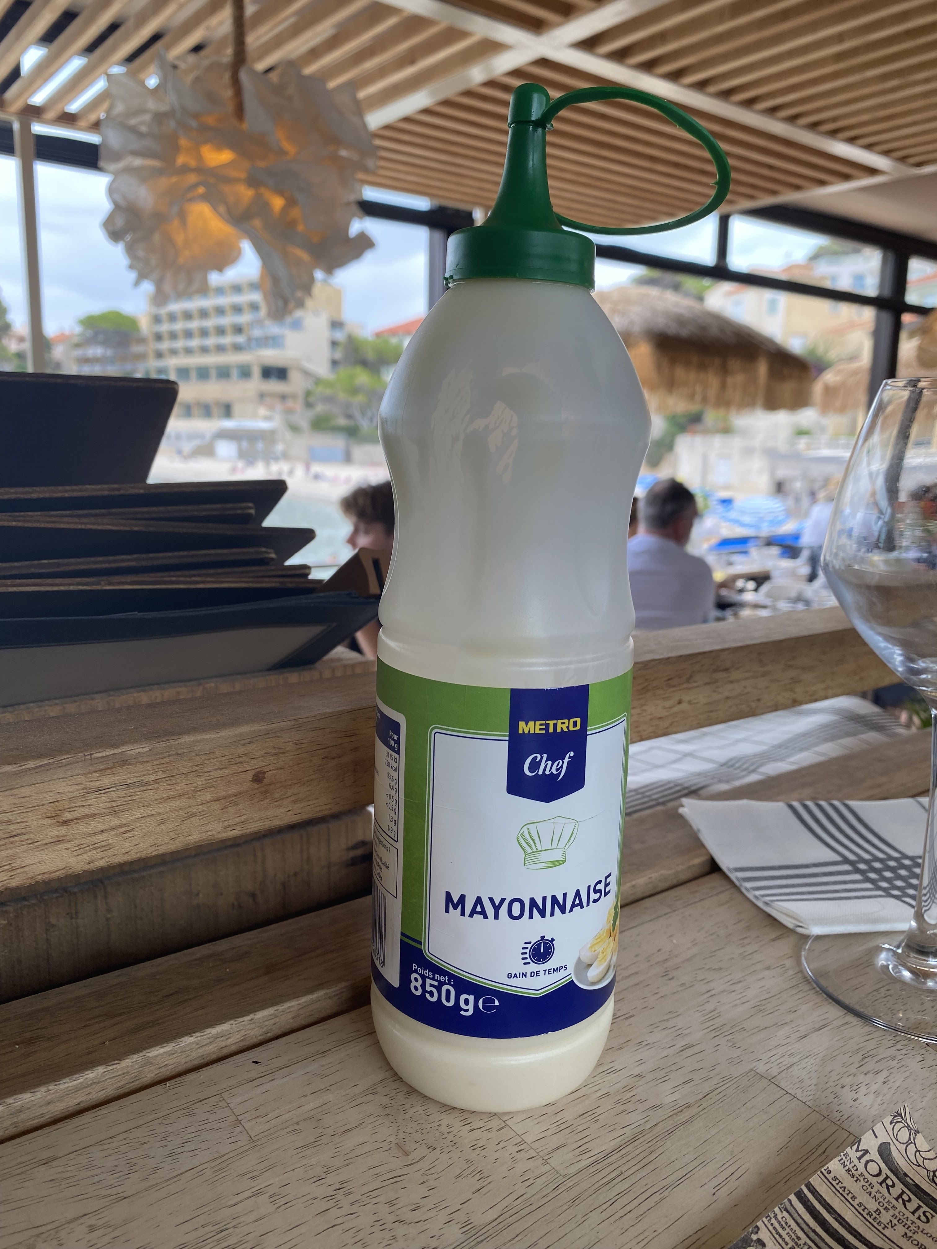 Si vous aimez la vue mer sur cette belle anse de Renecros allez y, vous aurez une heure et demie pour l’apprécier le temps d’avoir votre plat. On est en septembre, le service est censé être rodé en fin de saison.. mais malheureusement ce n’était pas le cas. 5 à 6 serveurs différents s’occupant des mêmes tables ! Les assiettes tant attendues sont bien dressées mais le rapport qualité prix est quand même à désirer, compte tenu de la faible quantité. Pas de proposition de plat enfant, obligé demander à un serveur à qui il faudrait également apprendre à bien mettre son masque, sous le nez il ne sert à rien ! Le clou fut tout de même la mayonnaise demandée pour mon fils pour son steak frites, je vous laisse apprécier la photo, flacon Métro de 850g apporté par le serveur. Cela contraste vraiment avec le dressage pompeux que l’on trouve dans les assiettes. En résumé : à éviter