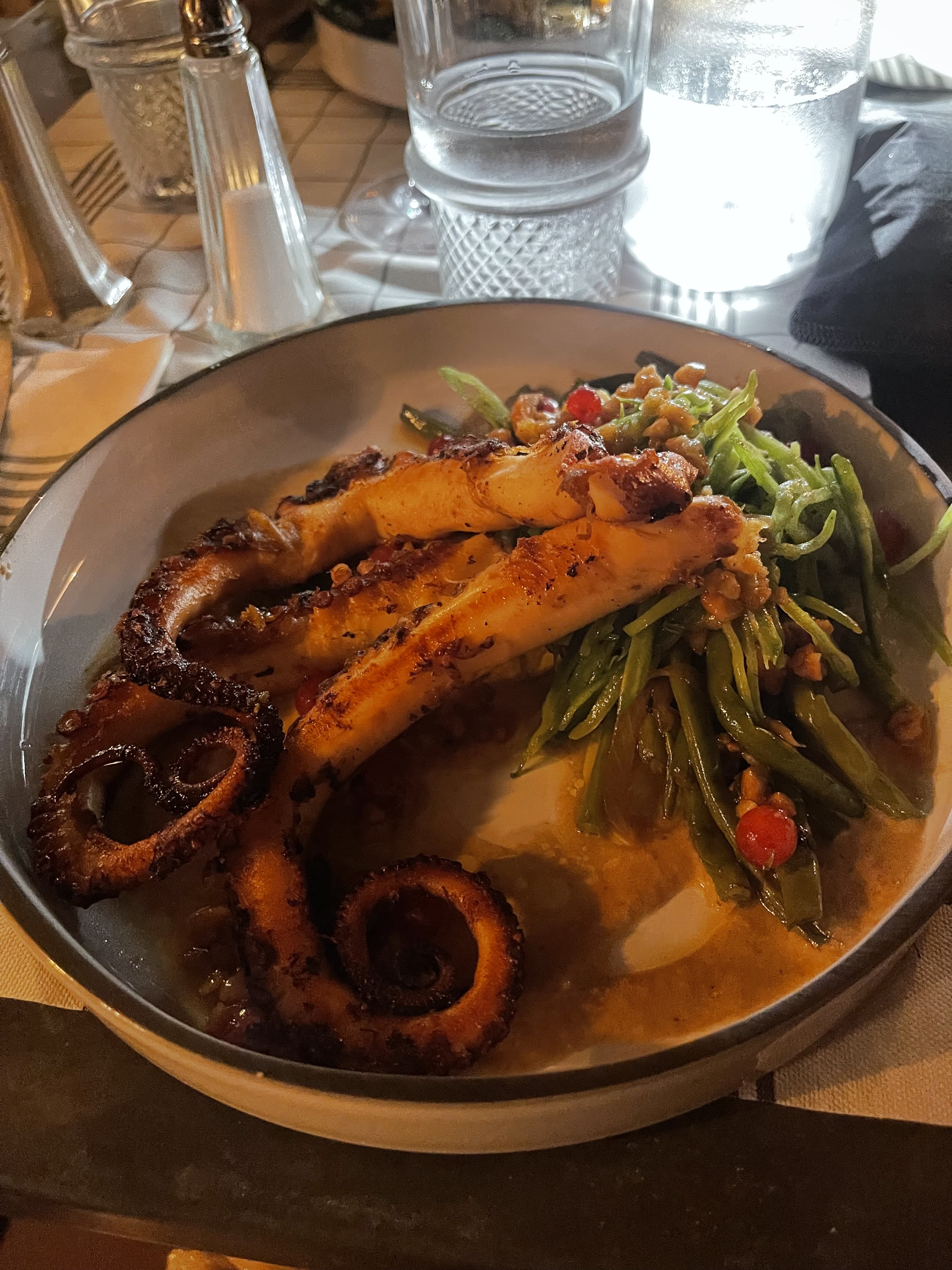 Tentacules bien cuisinées. Flan coco bon sans plus. Beau cadre, ambiance sympa. Rosé en premier prix sympa. Belle deco, patron qui a de la pêche ! Dommage c’est un peu trop cher! Car déjà plat et dessert :38€ et y a encore des suppléments pour frites maison 9€ ou la pieuvre 3€..c’est dommage.