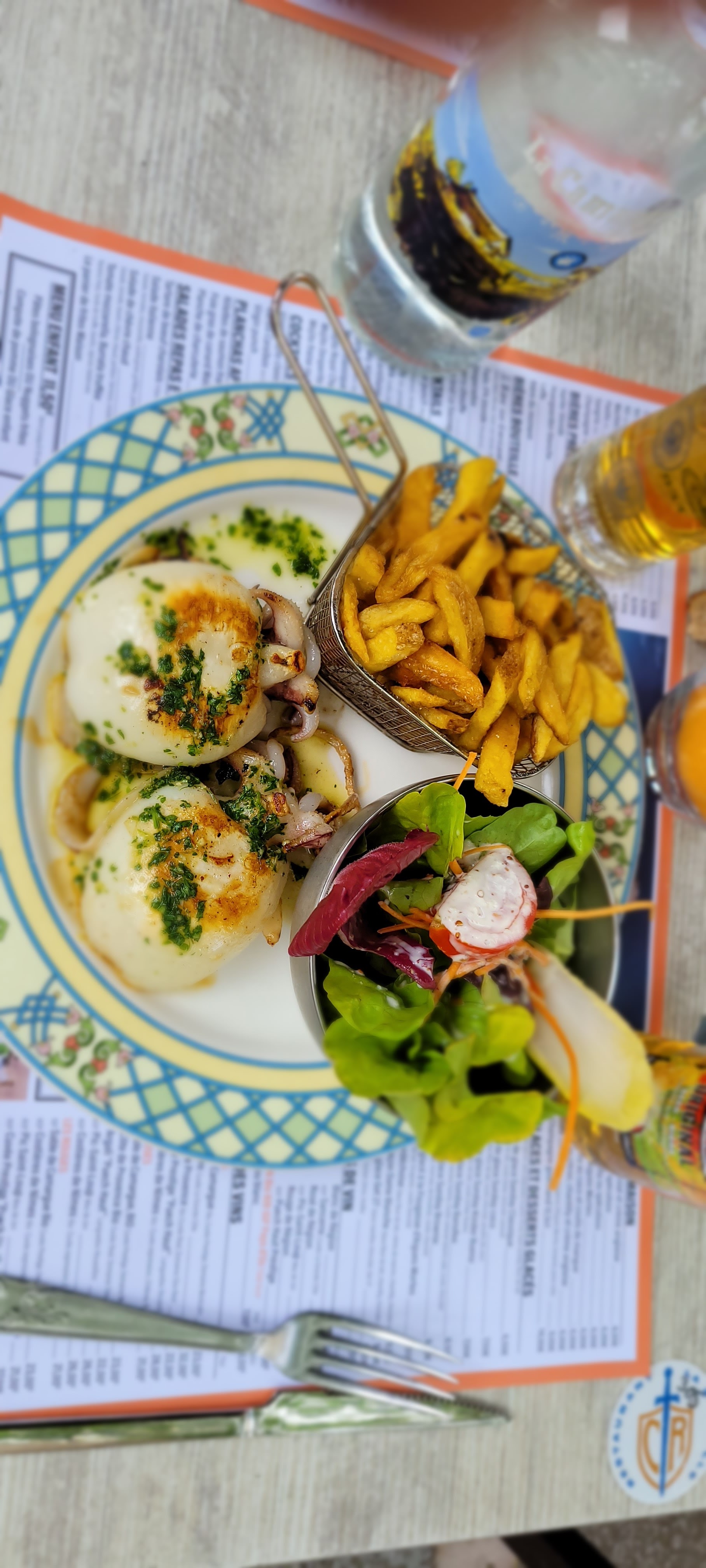 Restaurant bien placé. Par contre service moyen on attend toujours le sel et le poivre. Les plats arrivent avant l'apéro ! Brochette de noix de st jacques à 23,50 € merci de préciser que c'est surgelé car franchement pas copieux sauf si vous aimez l'ail . Bref une fois pas deux