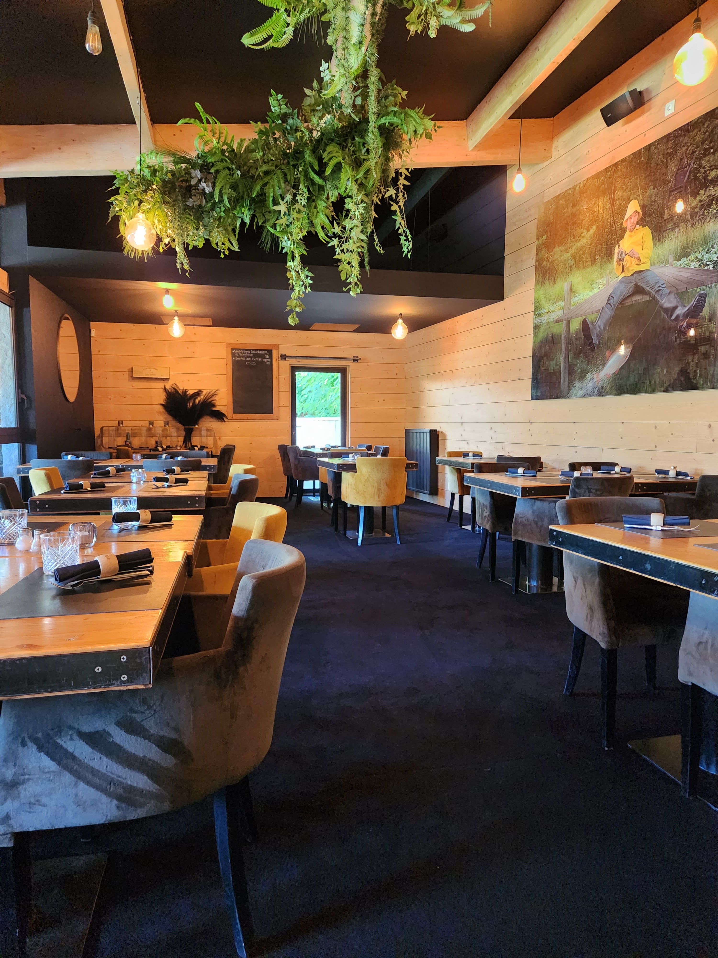 une jolie déco chaleureuse avec vue sur le plan d'eau et cheminée. Une terrasse ombragée et accueillante. Une carte alléchante, et des suggestions chaque semaine. Jamais déçue dans ce restaurant, l'assiette est toujours à mon goût, et en qualité et en quantité .. et servi avec le sourire