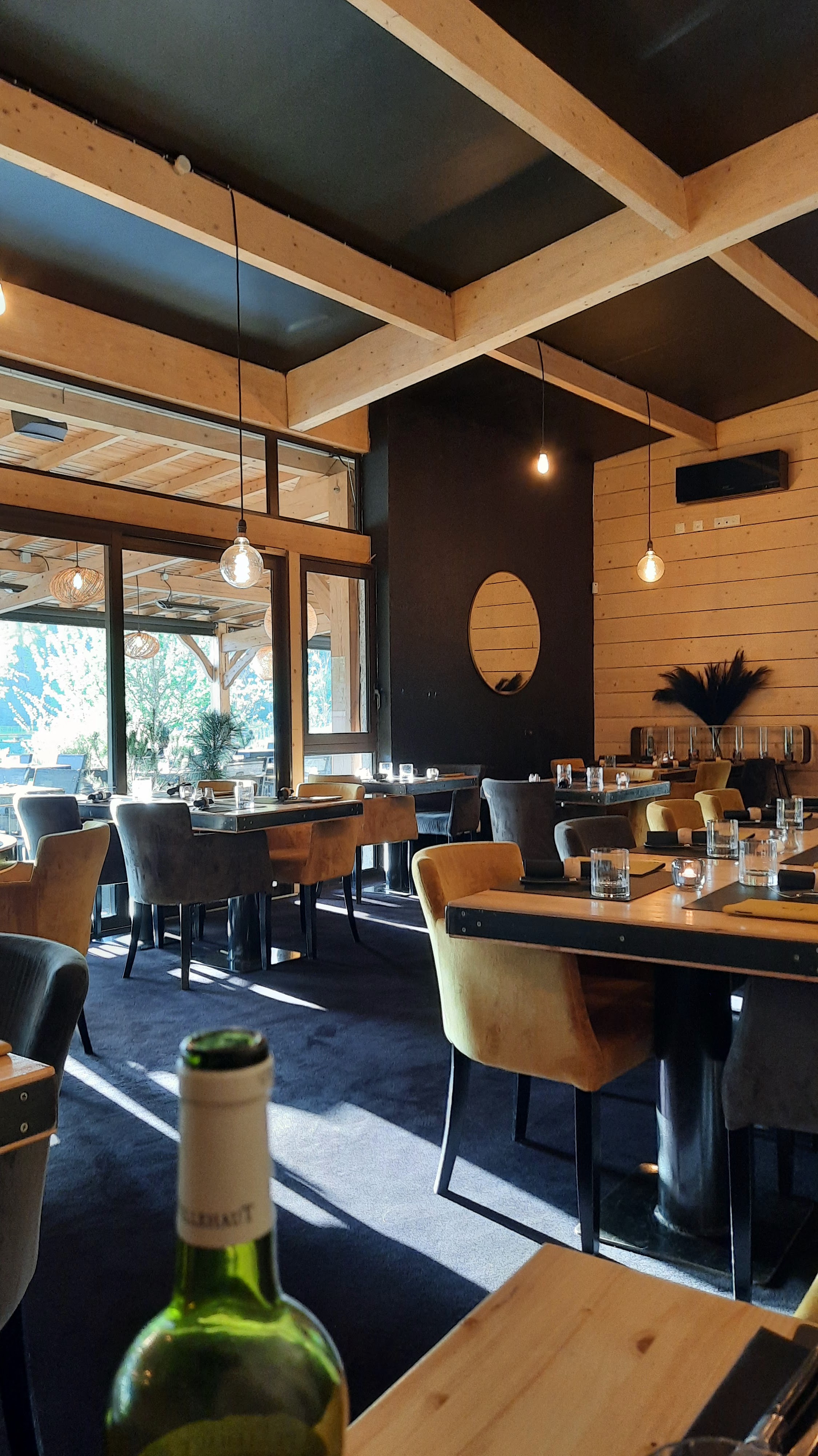 Nous ne sommes pas allés dans le restaurant même mais à la brasserie où l'ambiance est très cosy, chaleureuse, nous avons l'impression d'être dans un chalet à la montagne. Nous avions commandés un apéritif à partager entre potes (galettes à raclette) très bon et suffisant. Dommage qu'il y a eu un quiproquo sur les services en simultané de l'apéritif et les plats Et du coup lors des services des burgers les 3 étaient froids. Après réchauffement ils étaient très bons, la salade commandée également Les crêpes sucrés très bonnes dommage qu'il n'y avait plus de glaces car avec la chaleur de la pièce un petit rafraîchissement serait venu clôturer cette très belle soirée Tres bon moment, le service était tout de même à l'image du décor, chaleureux Comme le restaurant, la brasserie est un restaurant plus que recommandable