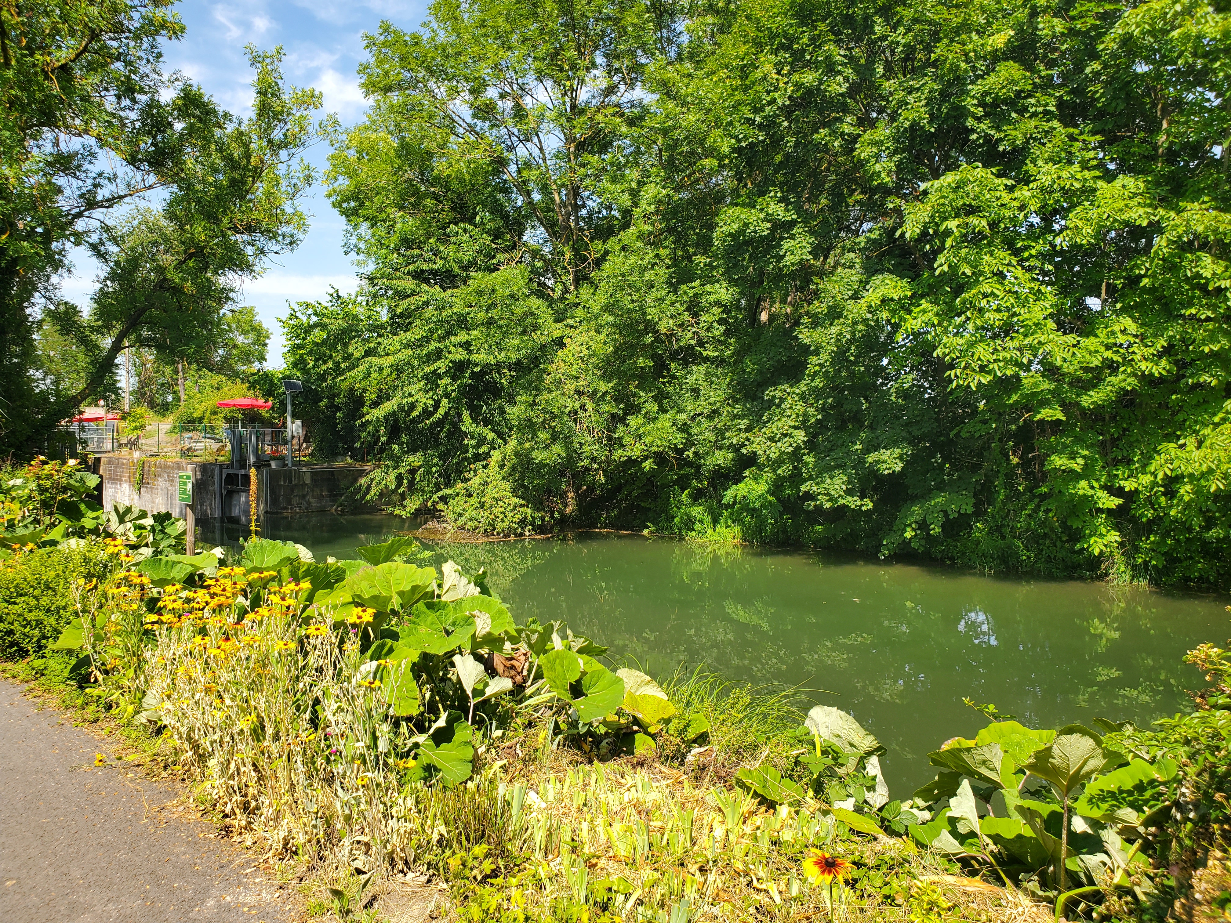 Paisible endroit sur les chemins le long du canal pour s'arrêter et prendre une petite pause repas où une délicieuse glace. Verdure et soleil dans un havre de paix.