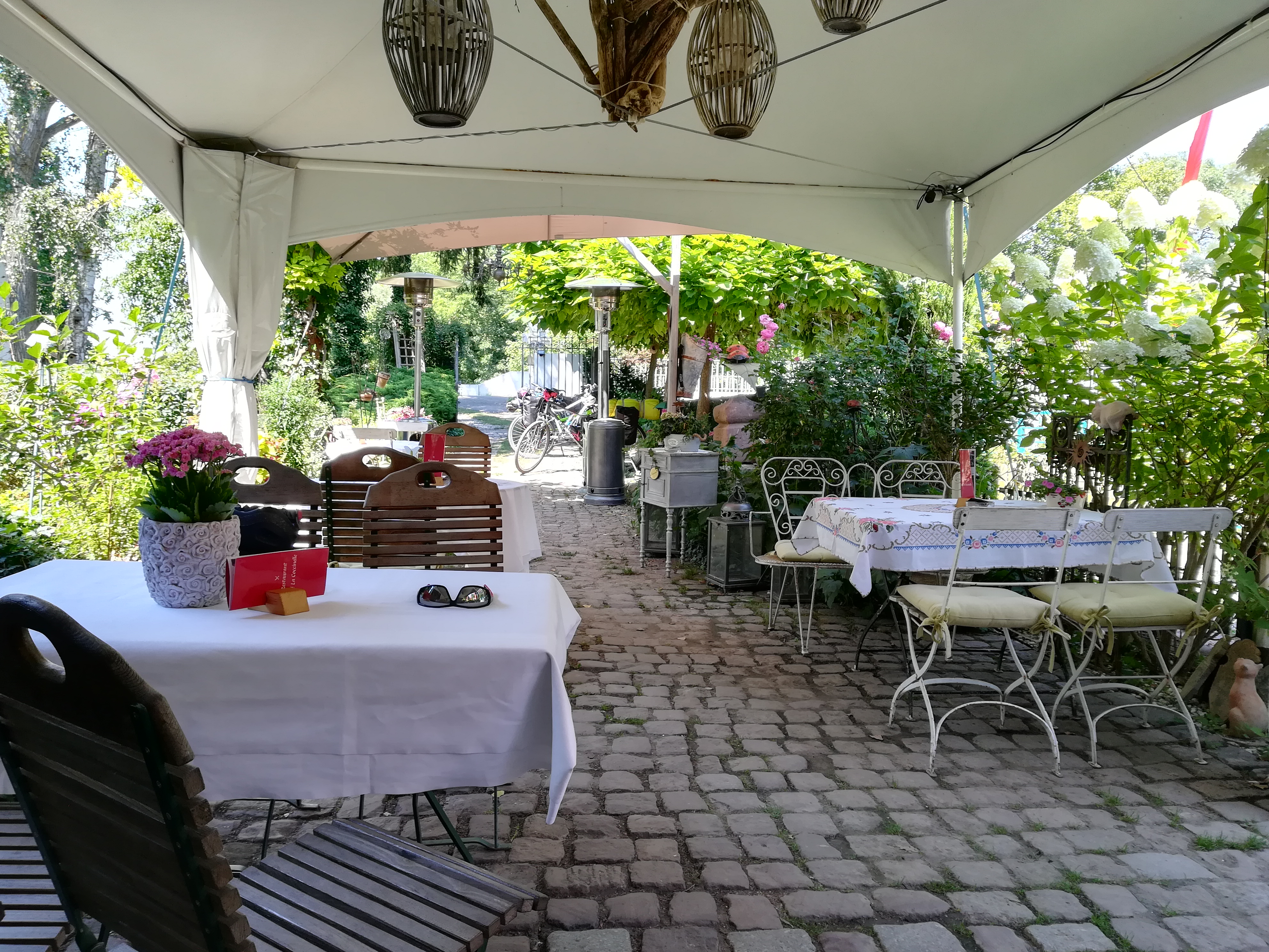 Restaurant dans la nature à proximité du canal à Artzenheim. Terrasse équipée de brumisateurs : quel delice. Entendre l'écoulement de l'eau est tout aussi reposant que la présence de végétation florale.