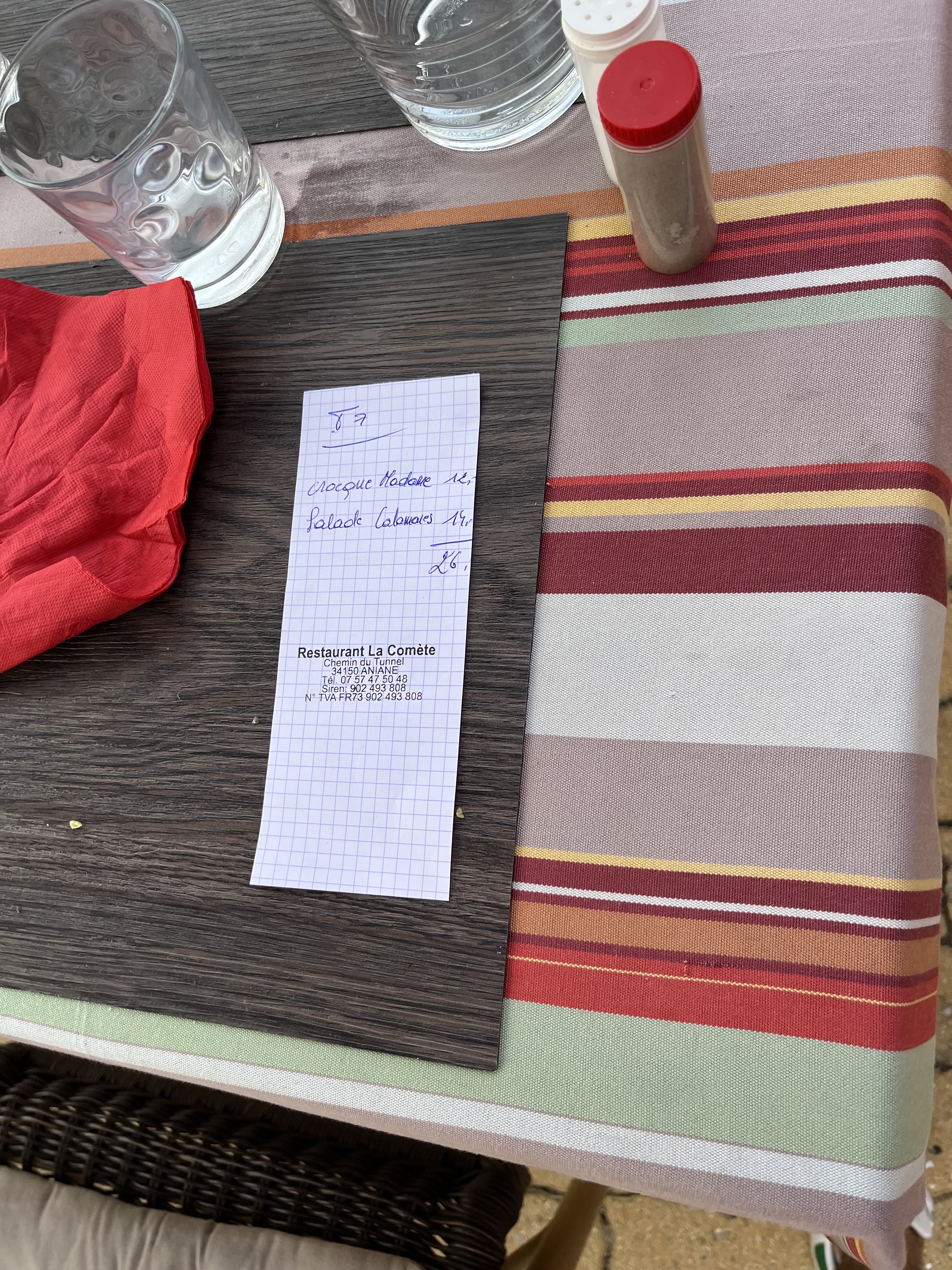 Tenu par un couple qui ne sont pas faits pour être restaurateurs. Assiettes de calamars congelés vendus pour 14€, croque madame simplisme et sans béchamel (un panini avec un œuf). Les frites ne sont même pas faites maison, un comble quand on sait que le couple est belge d’origine. Ils profitent sans doute des logement insolites qui sont à côté car c’est le seul restaurant dans les environs. Mais si vous logez au bulles, allez voir ailleurs ! Le bouquet final est cette note écrite à la main, je n’avais jamais vu ça.