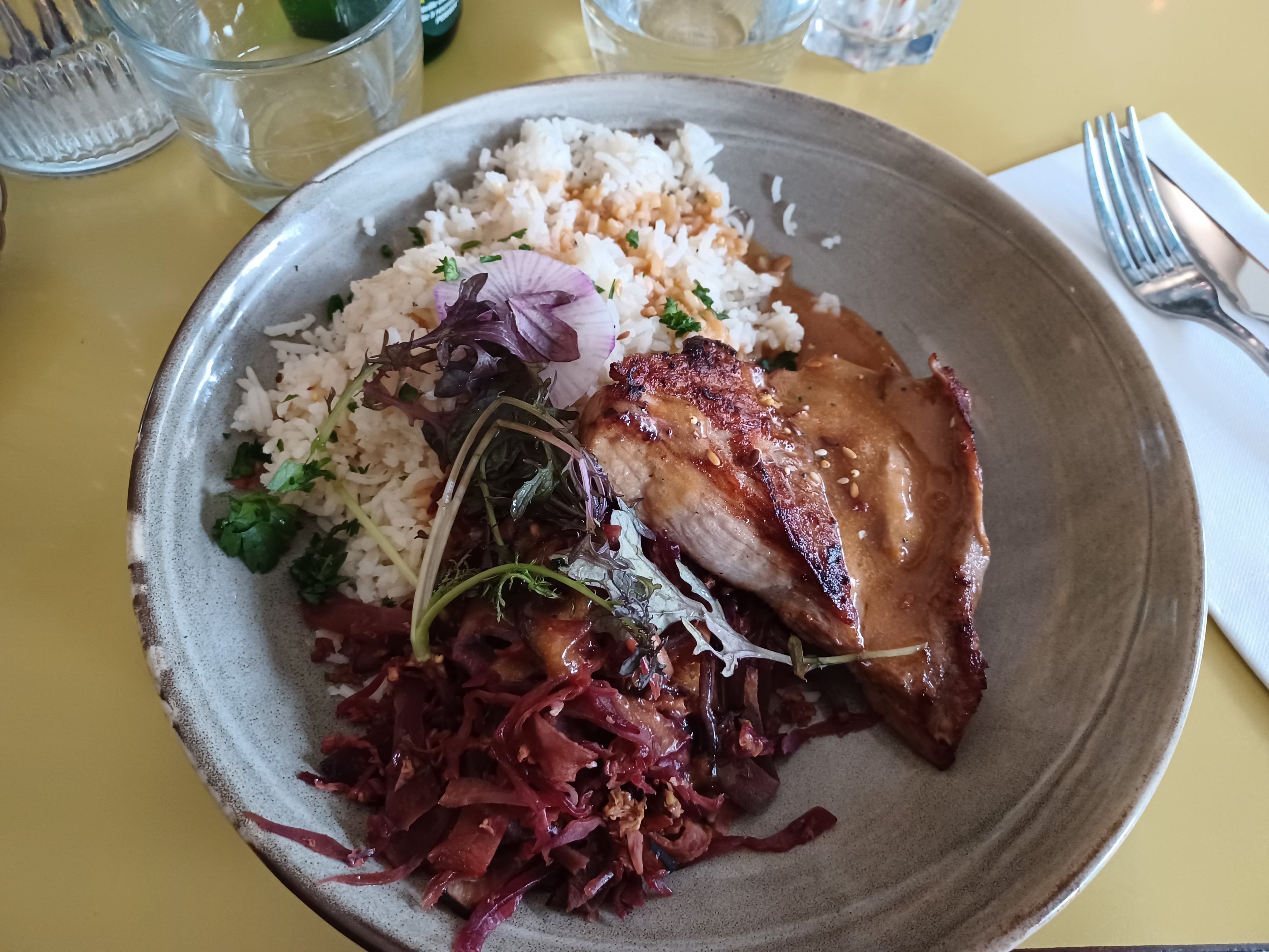 Parfait nous avons passé une excellente soirée ! Notre chienne a pu venir sans aucun souci et une chaise enfant à été prévu pour mon fils de deux ans (c’est pas grand chose mais pas tout le monde y pense) nous avons commandé des wok au poulet qui était vraiment excellent avec des produits frais et du poulet sûrement du marché. Le plat copieux et le service très efficace et rapide. Service impeccable et agréable ! Je recommande sans hésitation et nous reviendrons sûrement