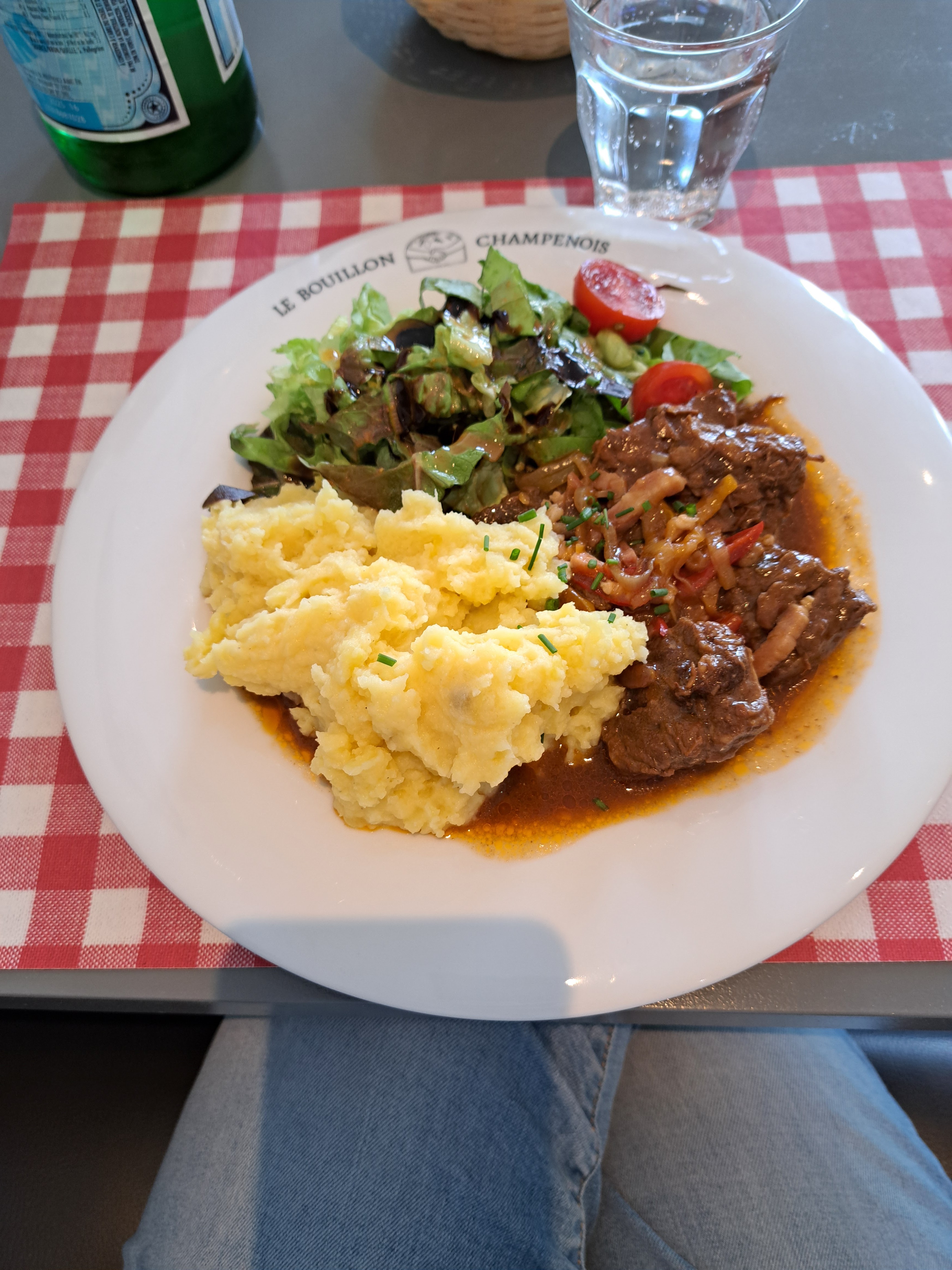Après avoir parcouru 90 miles ce matin en moto sur de belles routes françaises sinueuses et désertes, j'ai trouvé l'arrêt déjeuner parfait. Une jolie petite ville avec un parfait petit bistro sur la place. Le ragoût de dinde était recommandé (je pense que c'était tout ce qu'il leur restait) et c'était aussi parfait. Assis dehors avec le son du français discuté tout autour de moi, c'est exactement ce que j'espérais de ce voyage.
