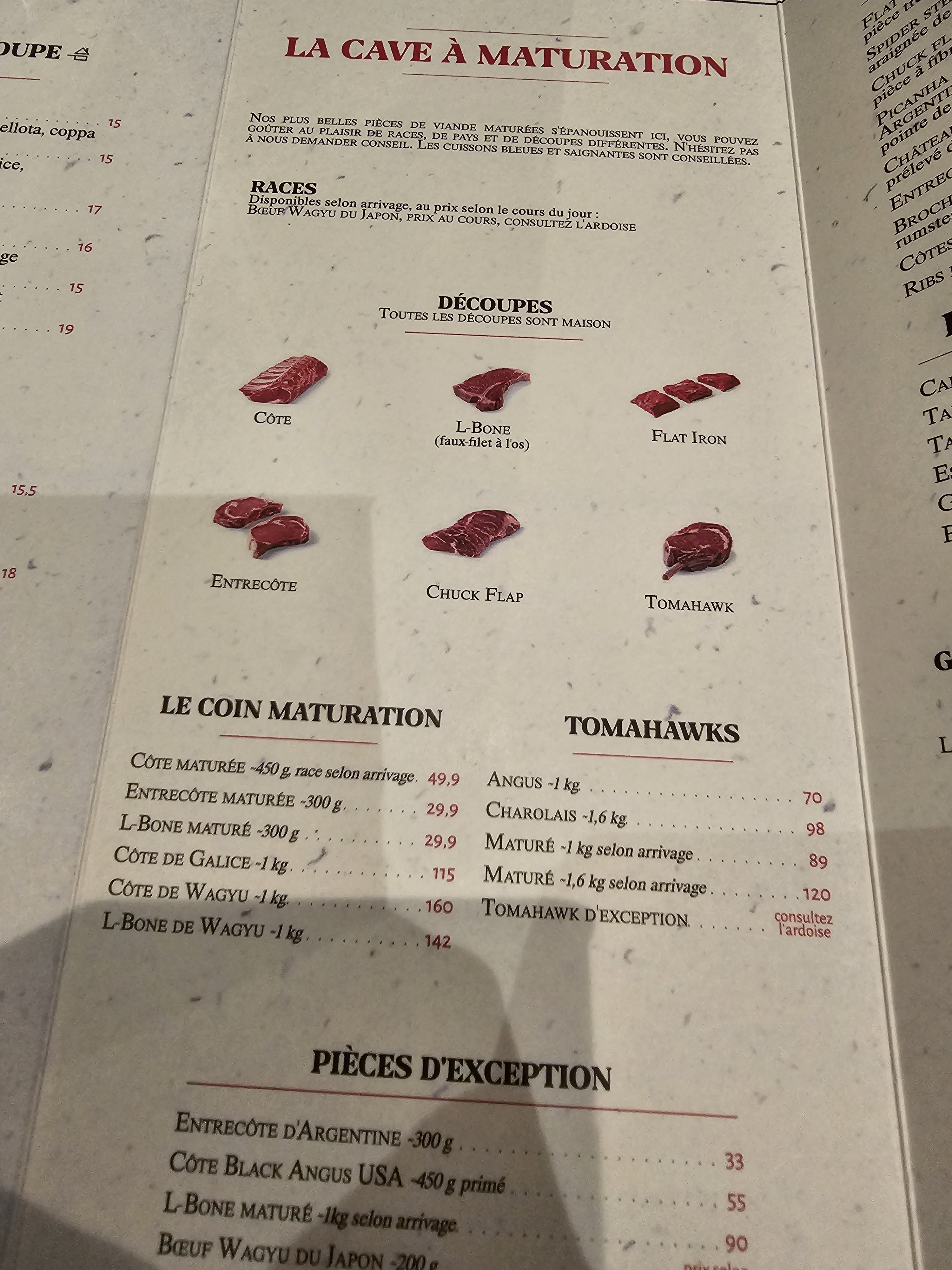 1ere visite pour moi. Je suis amatrice de viande de bœuf et particulièrement de viande maturée. Nous étions 4 à adorer la cuisson bleue, avons donc commandé une côte de bœuf tomahawk pour 4. Grosse déception. Elle avait été coupée avant cuisson et grillée unitairement, ce qui équivaut à servir 4 steaks et non une côte de bœuf. En outre la cuisson n'était pas bleue mais à point ( à peine rosée au centre). Concernant la maturation, je n'ai pas perçu la différence gustativehabituzllz pour ce genre de viande. Une morceau de bœuf assez banal pour moi. Donc pas convaincue du tout. Pour le reste, service correct, une des sauces est très bonne (j'ai oublié son nom). Les frites sont sans surprise ( annoncées maison mais est ce le cas ???) Desserts bons, mais très chers.