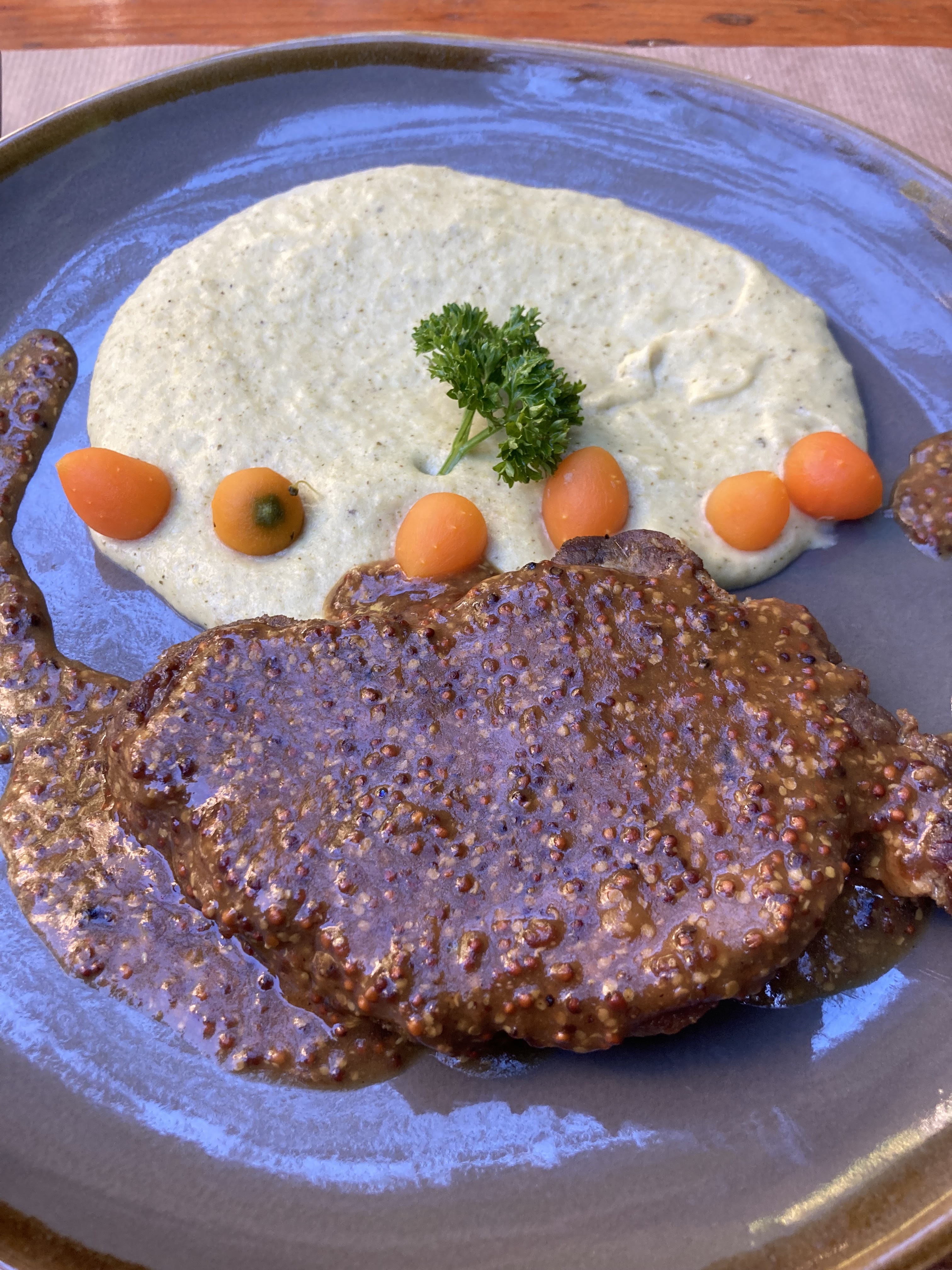 cuisine sans aucune saveur. La noix d'entrecôte était un morceau de gras et les frites maison étaient tout simplement des frites congelées. Nos 2 plats étaient noyés sous une épaisse couche de sauce. Nous pensions féter nos 20 ans de mariage dans un endroit remarquable...le cadre l'est, mais absolument pas la cuisine....digne d'une cantine...et en plus c'est cher pour ce que c'est.