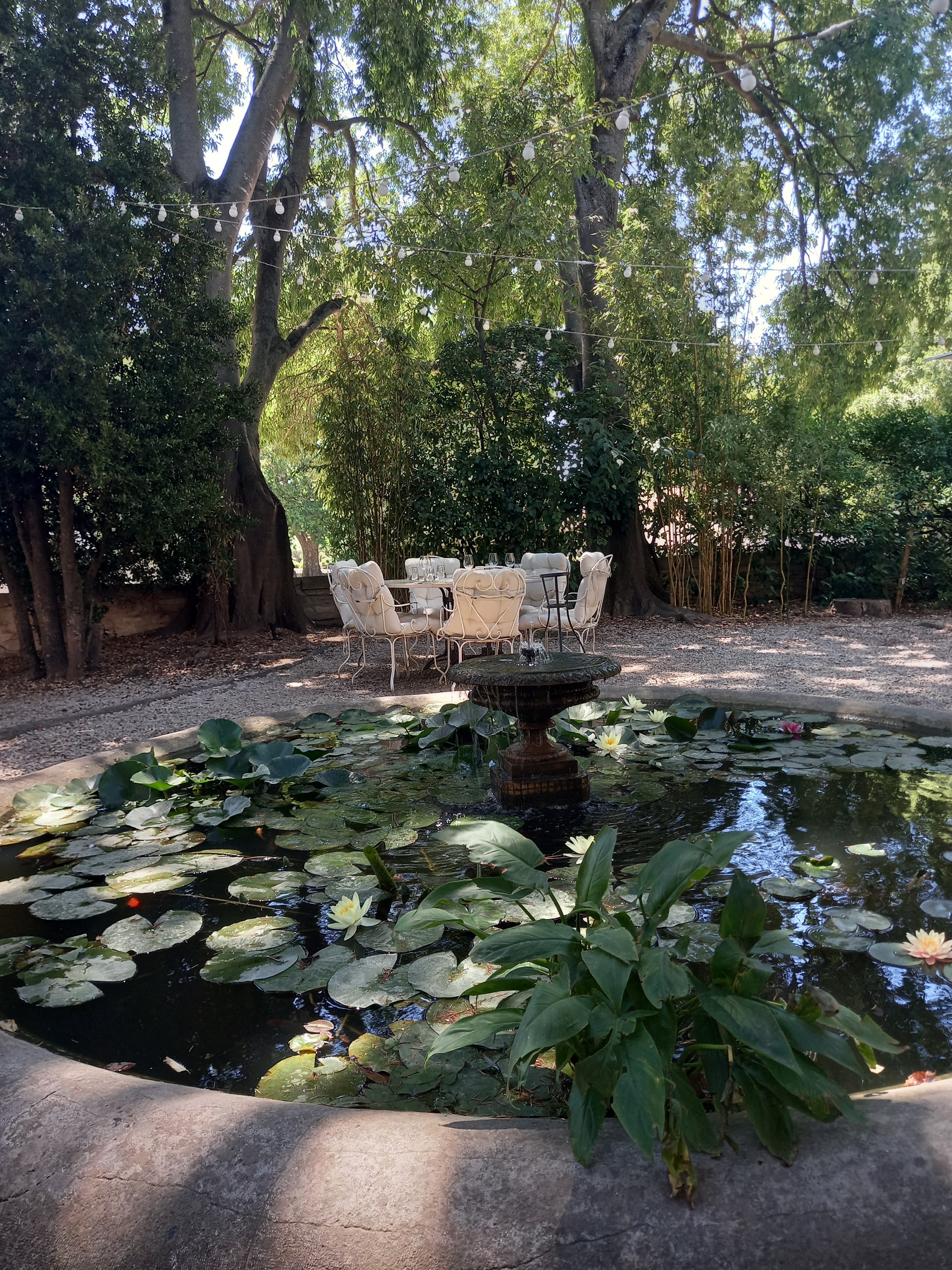 Le lieu en été, un vaste jardin sous un cèdre, orné d'un beau bassin fleuri de nénuphars, est plein de charme. Les 4 plats que nous avons commandés étaient tous excellents, et le service est sympathique. Je regrette seulement, dans ce pays de vignobles, que le vin rouge au verre (et qui n'est pas donné) soit si âpre, une sorte de kiravi, peut-être bio ? Mais il y a une vaste cave pour les vrais buveurs. Une excellente adresse, donc.
