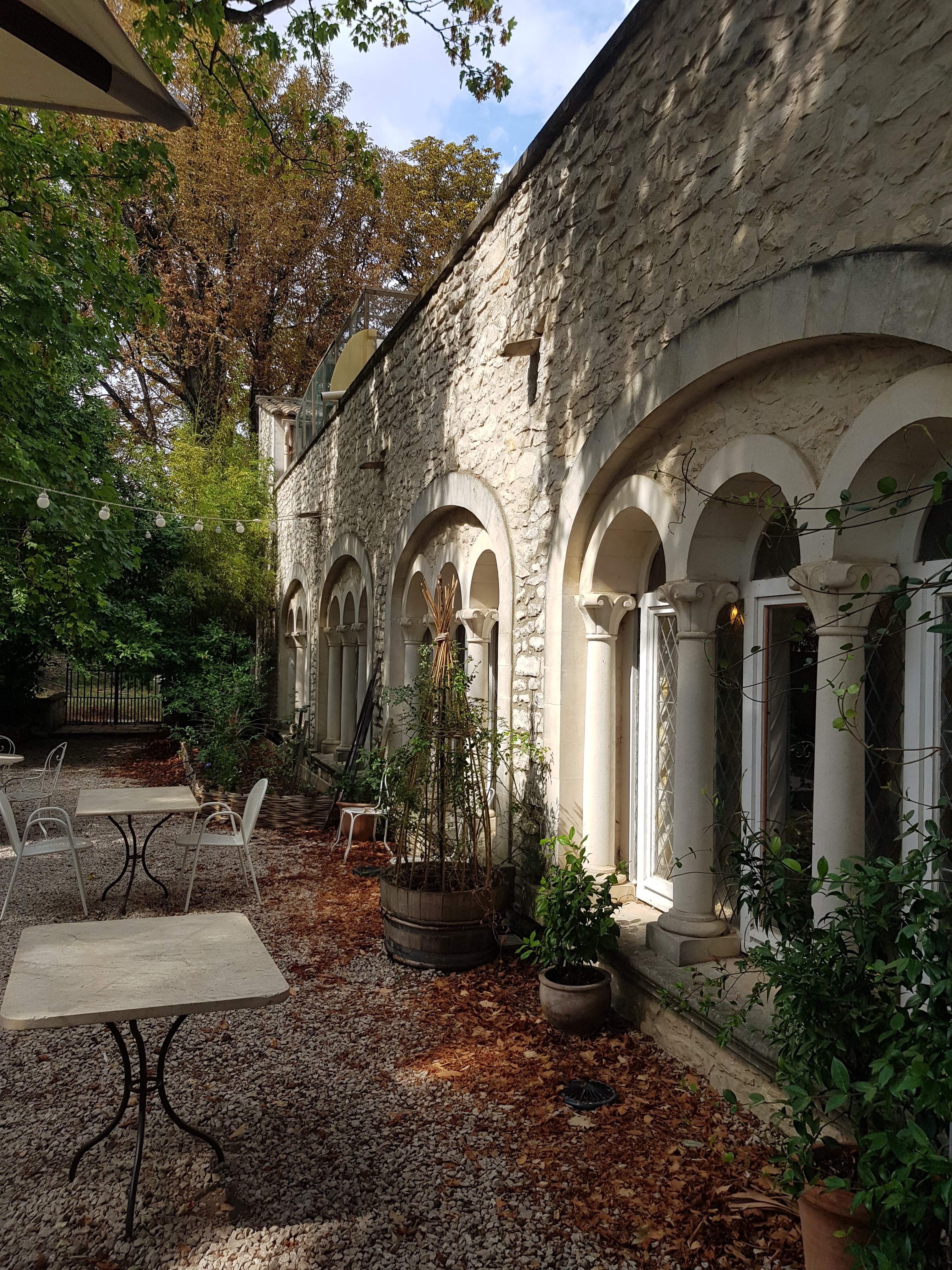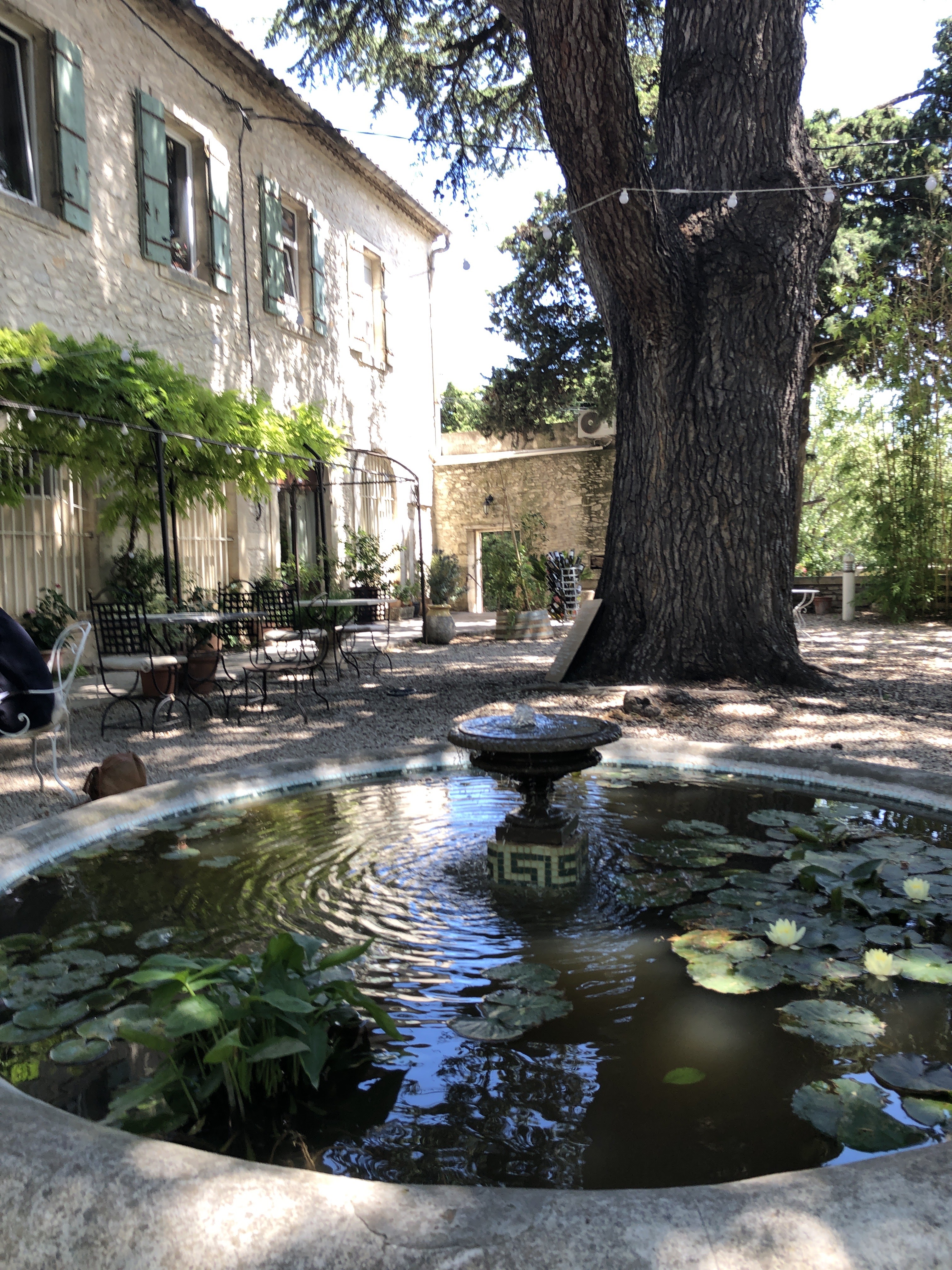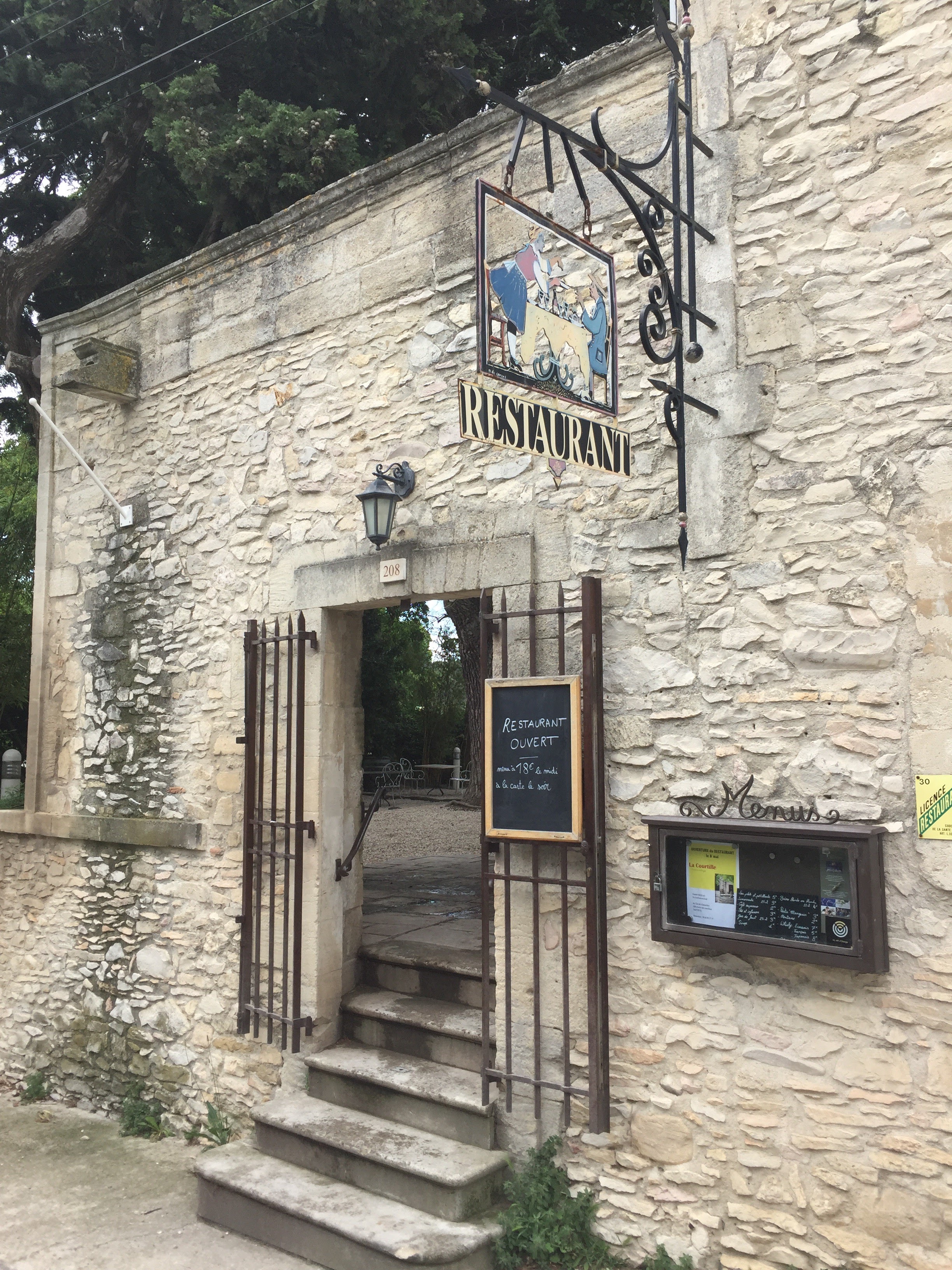 Grande cour ombragée et très bonne cuisine. Je recommande de faire une petite balade à pieds avant ou après le repas, le village de Tavel et ses jardins sont très jolis.