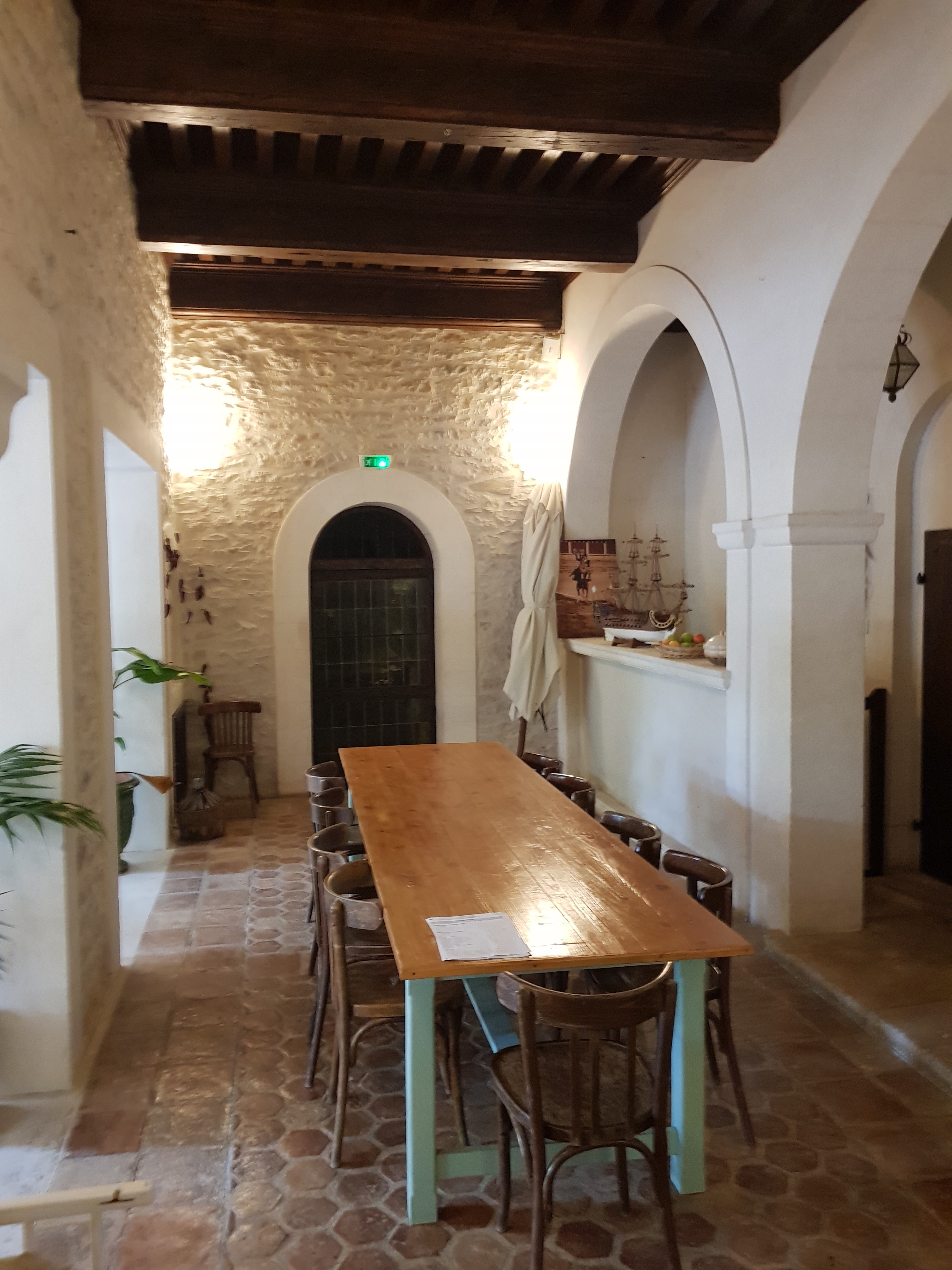 Belle cour ombragée et boisée avec une fontaine. Magnifique extérieur. Intérieur somptueux également mais résonnant. Cuisine aléatoire : peut être très fine et goûteuse comme plutôt classique voire décevante mais prix stables. Carte des vins de la région. Personnels agréables, service plutôt rapide. Comptez 35€ par personne environ pour entrée, plat, dessert : petite quantité.