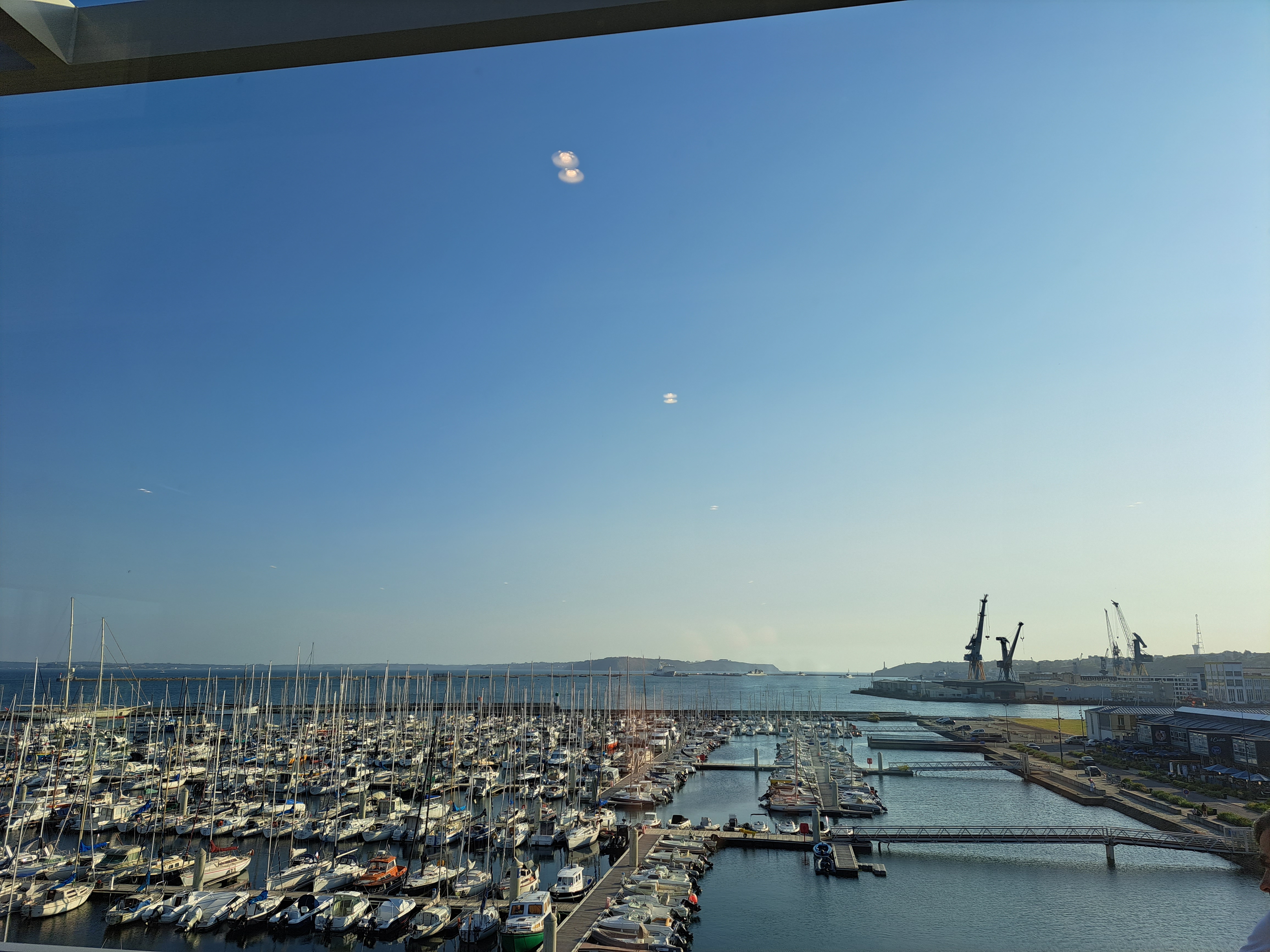 Bar-Terrasse avec une nouvelle vue sur Brest et le port de plaisance. Nous avons dégusté un verre de vin. Service aimable. Nous reviendrons pour le restaurant et passer une nuit avec une chambre vue sur le port de plaisance. Et pourquoi pas un massage...