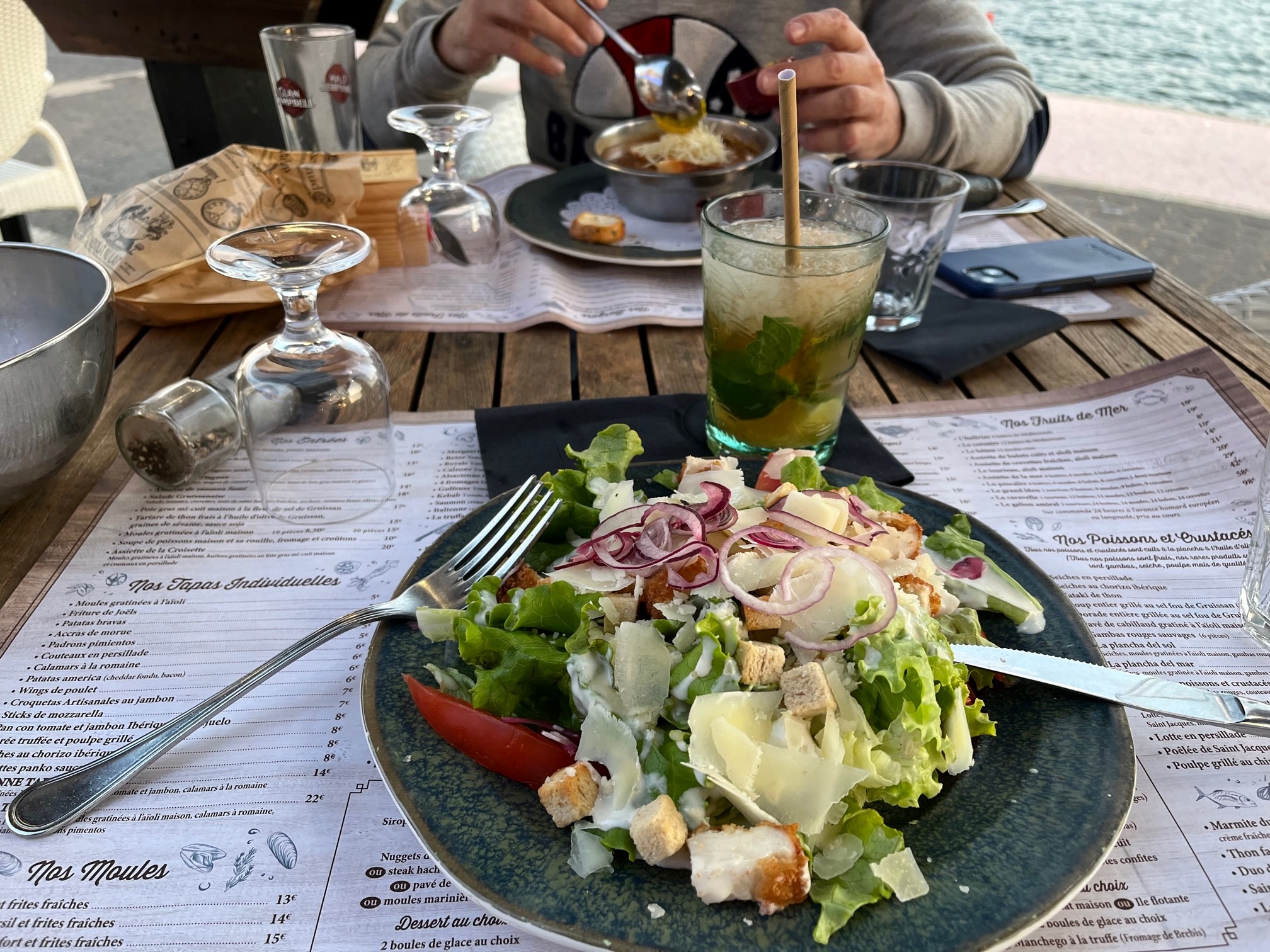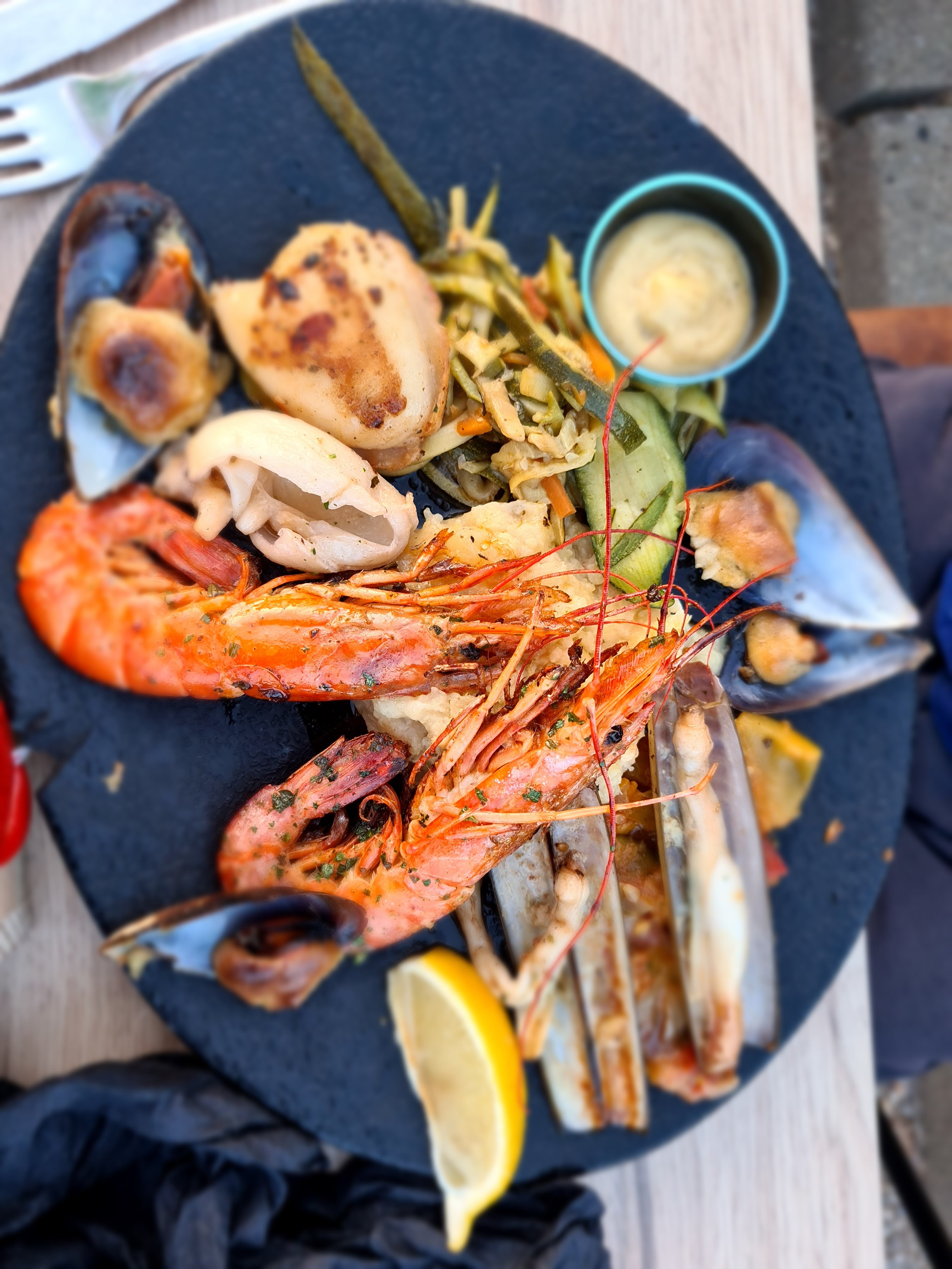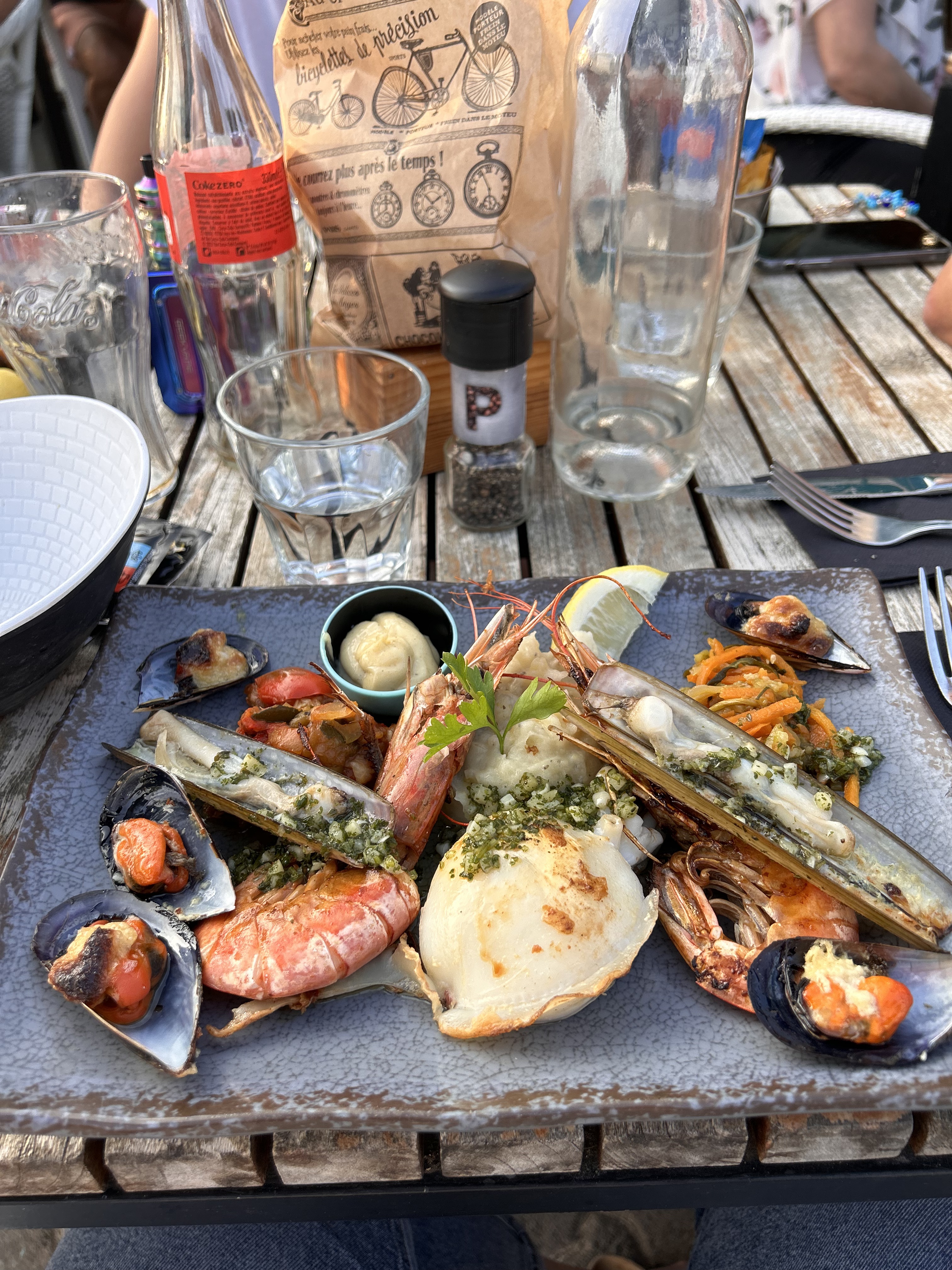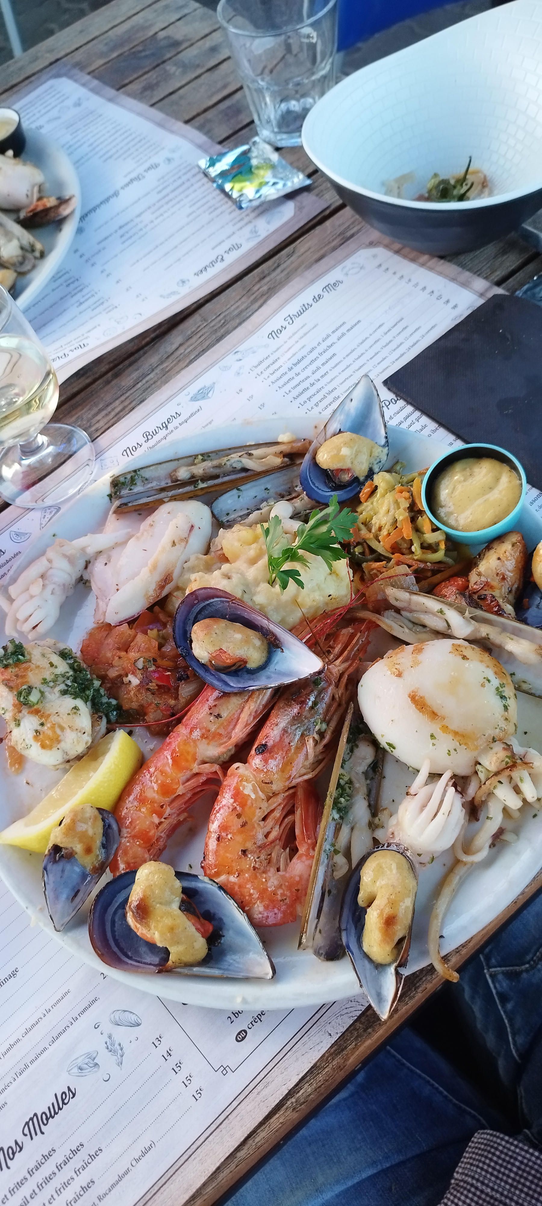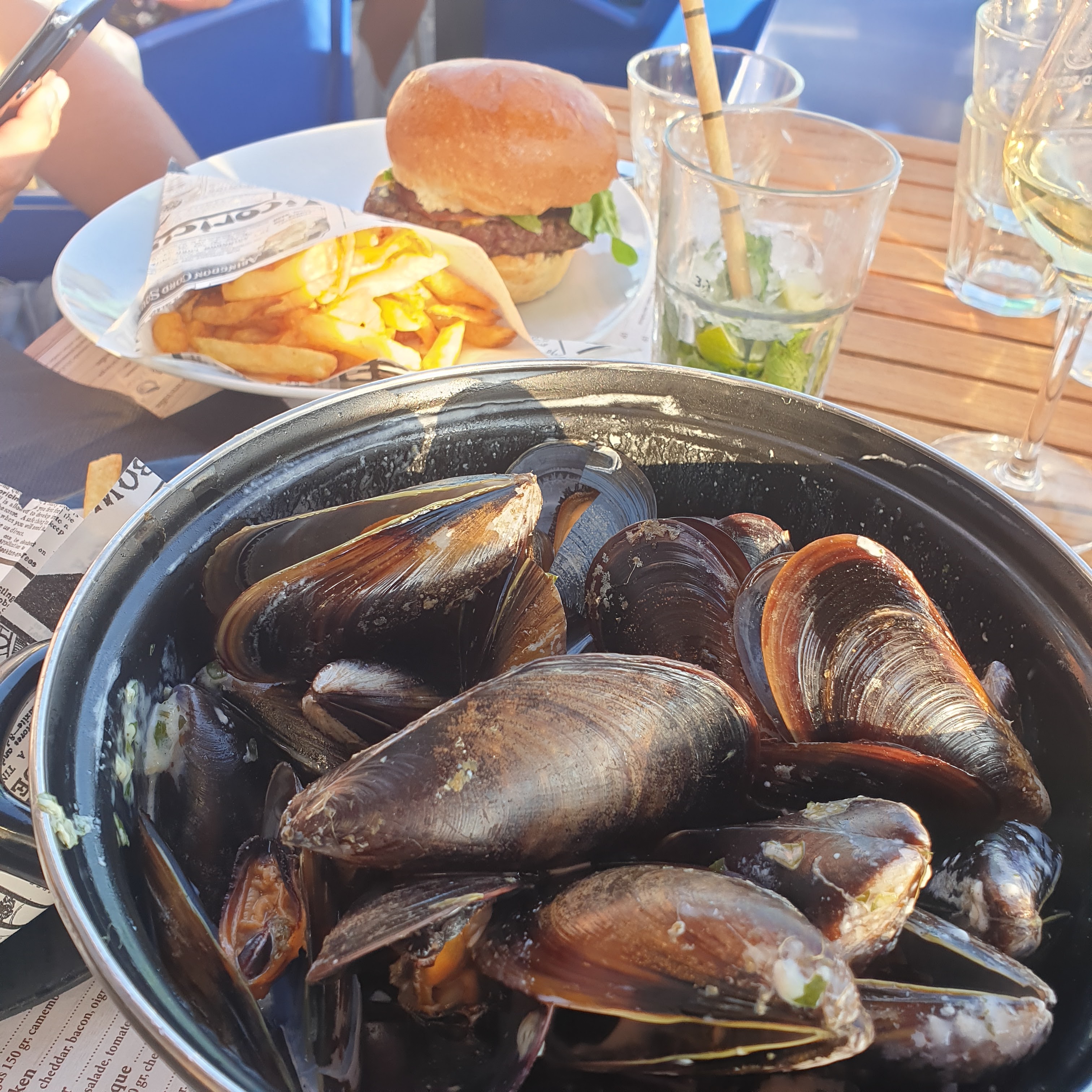 Des cocktails de folie, j avoue je reviens à chaque fois pour les déguster, surtout le mojito royal j en suis fan😅😆mais les plats ne sont pas en reste! En entrée huitres, Moules à l aïoli, plancha de la mer et en dessert boules de glace, fromage et île flottante ! !un régal . Je recommande vivement.