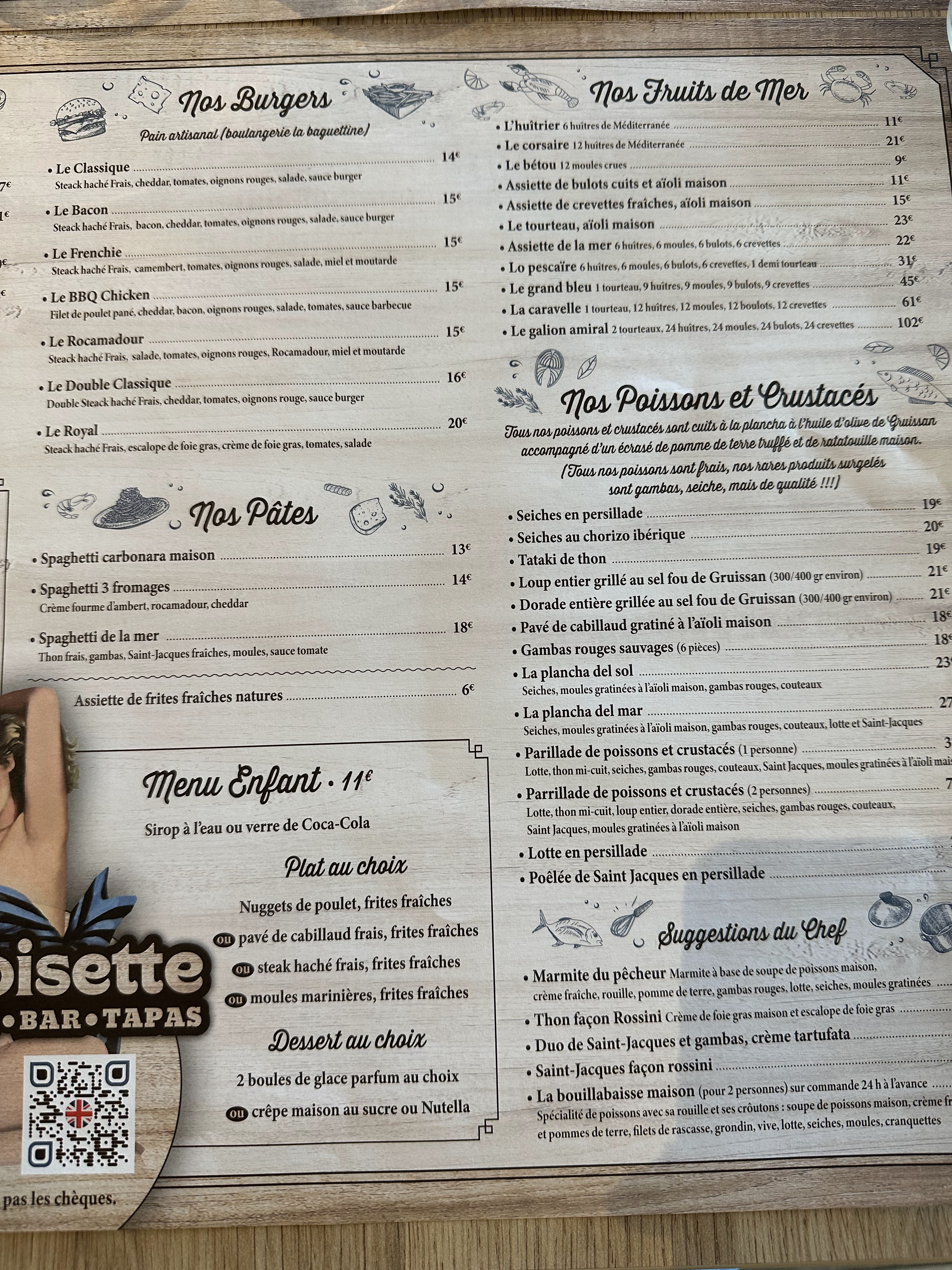 Un super restaurant des plats excellent que ce soit le menu enfant qui est varié et très bon que les tapas ou même le poisson. Les produits sont de grande qualités avec du goût pour ma part les moules au roquefort étaient délicieuses avec une crème exquise pour mon mari la plancha del mar très copieuse et excellente aussi avec un écrasé de pomme de terre et une ratatouille très bonne les frites sont faites maison. Les serveurs et serveuses sont très agréables souriants serviables et sa aussi c est rare. Je recommande ce restaurant pour tout de la réservation l accueil le service le goût .... Et même l addition qui n est pas excessive.