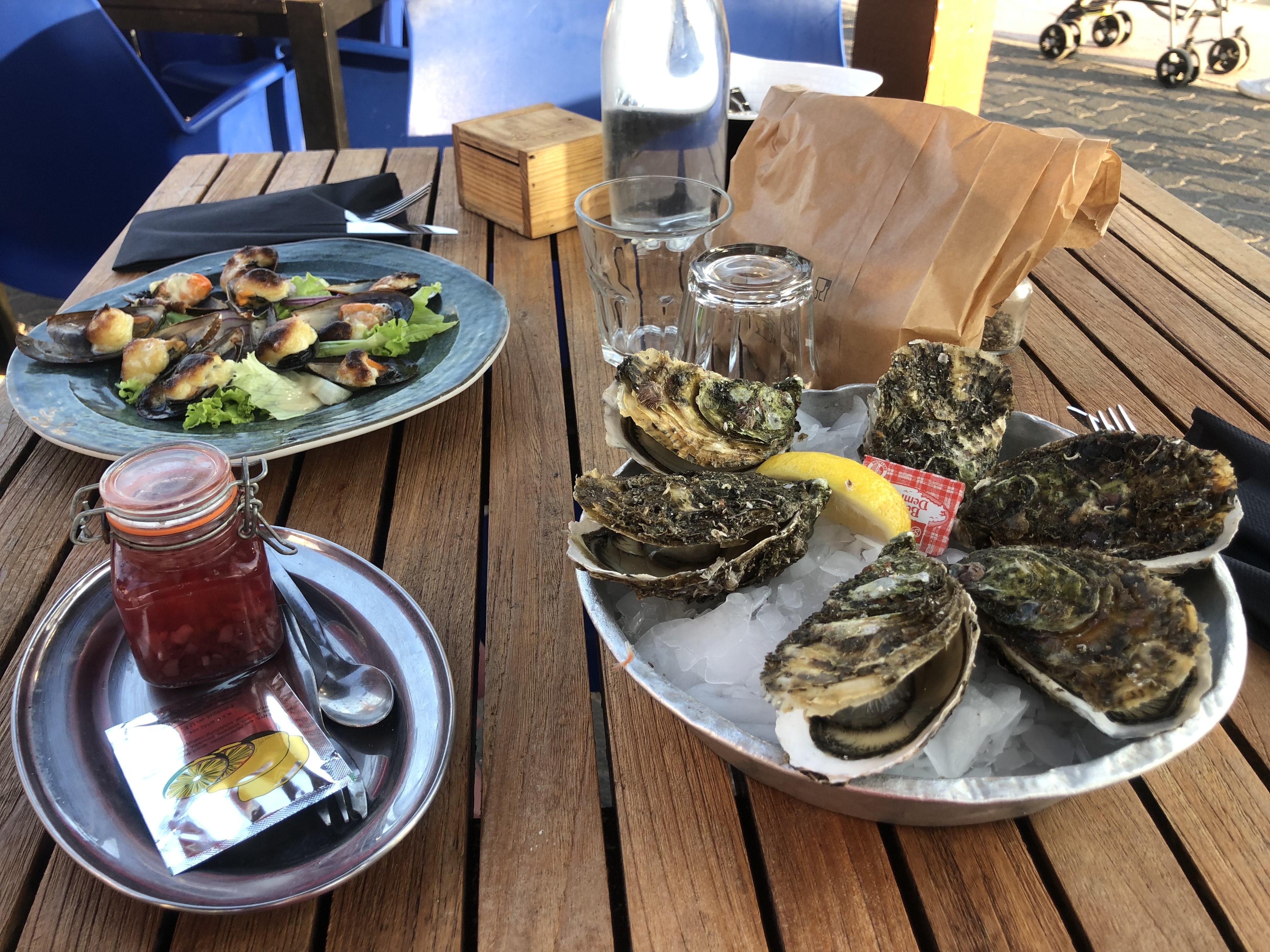 Rapport qualité/prix très raisonnable, un menu avec 6 huîtres à l’entrée pour 21€ ou des moules gratinées une tuerie, il faut le faire, plats: plancha del sol si c’était garnie avec quelques anchois ça aurait été parfait pour moi, plus cette vue sur la Marina. Le service était bien et rapide.