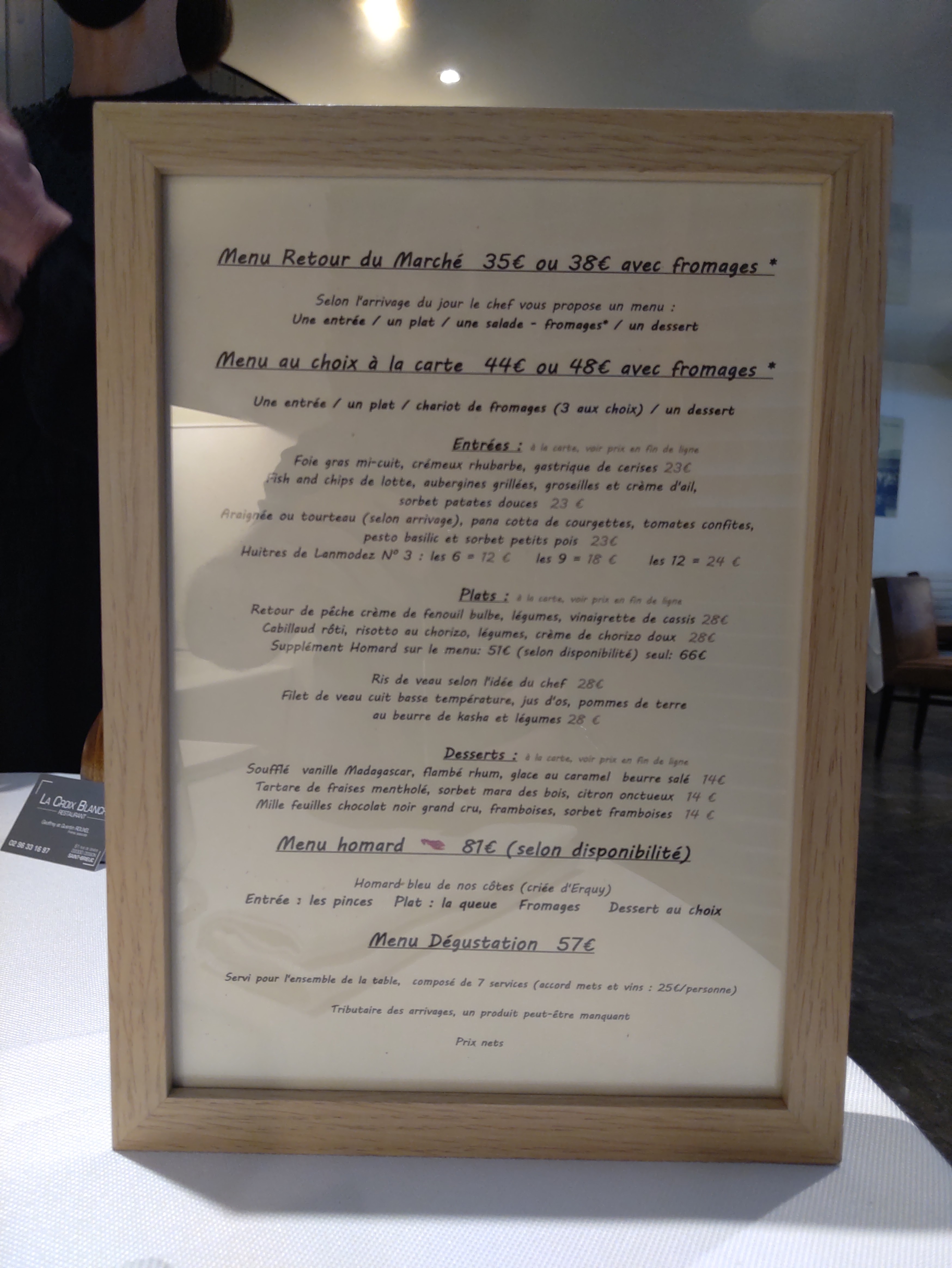 Excellent repas au restaurant de La Croix blanche à St Brieuc, nous avons apprécié le raffinement, la présentation, l’accueil et le professionnalisme des serveurs. Christine et moi le conseillons aux fins gourmets qui désirent passer un bon moment.