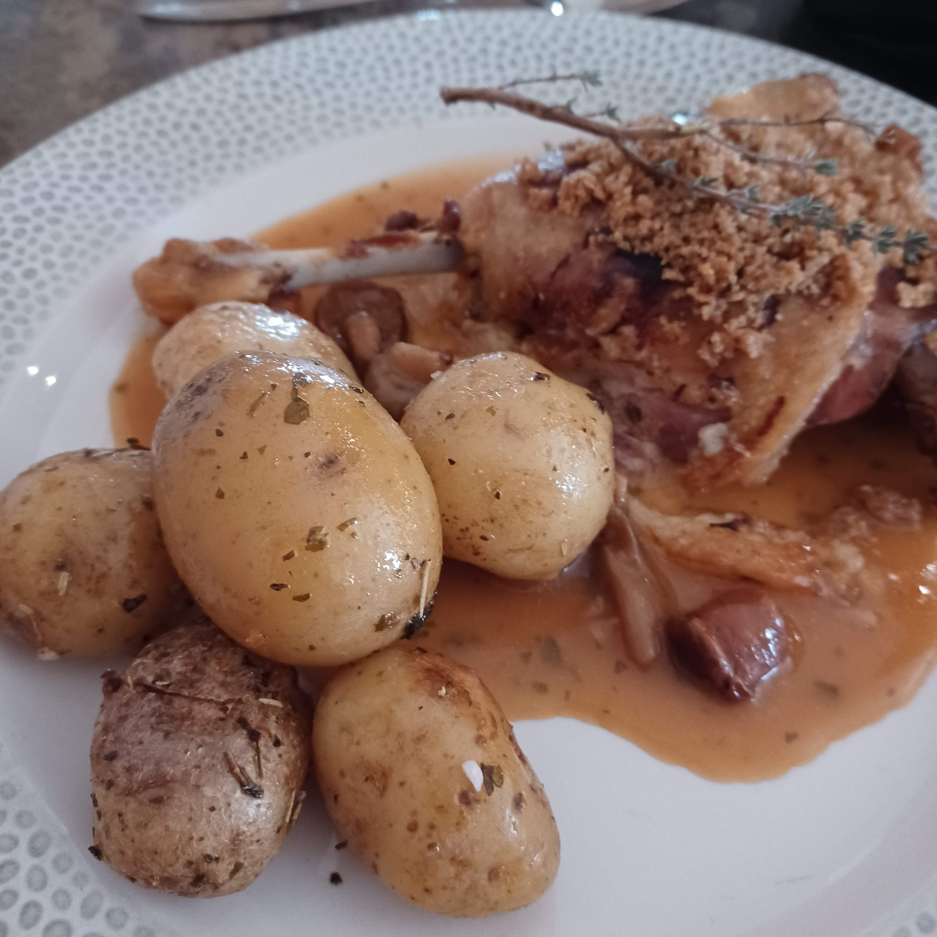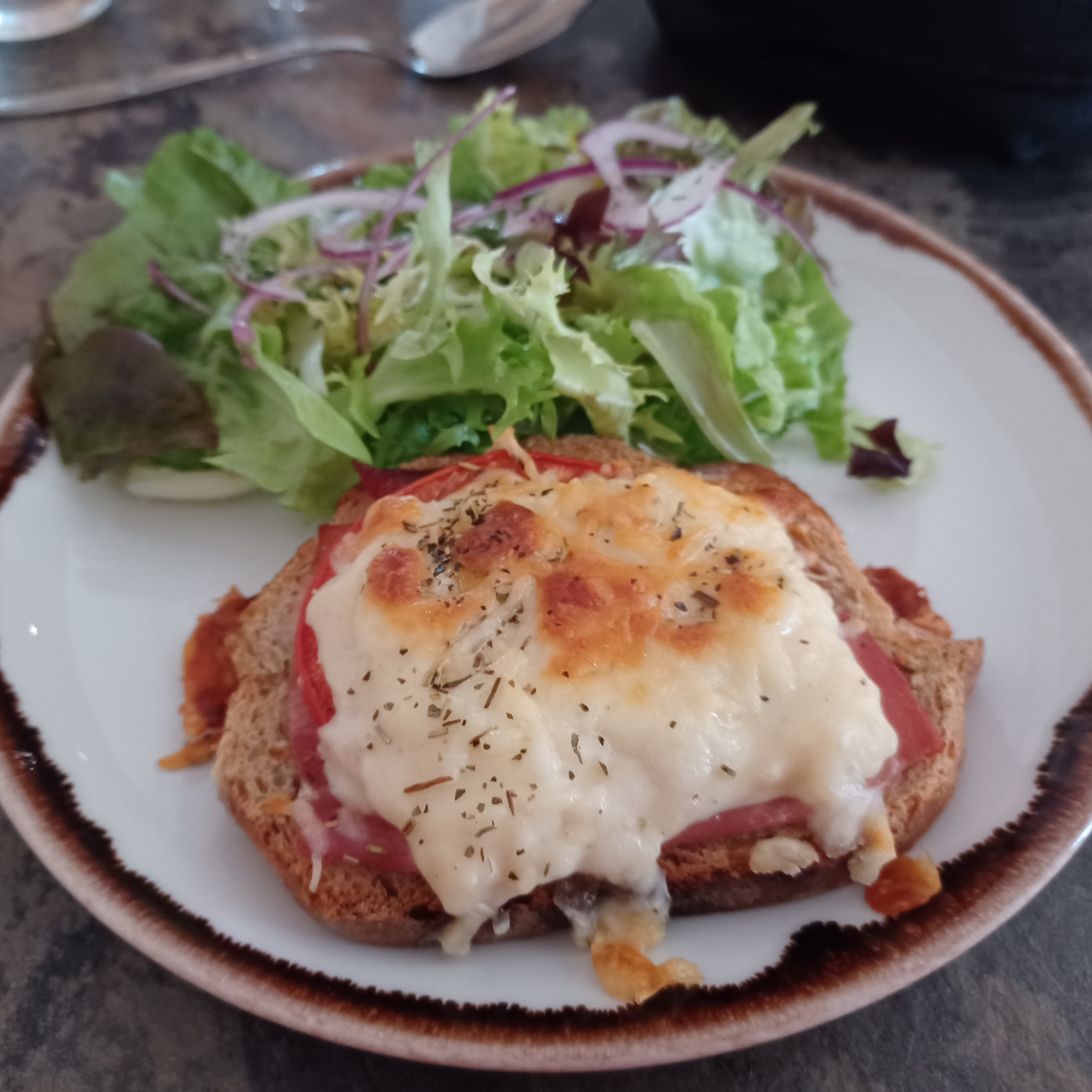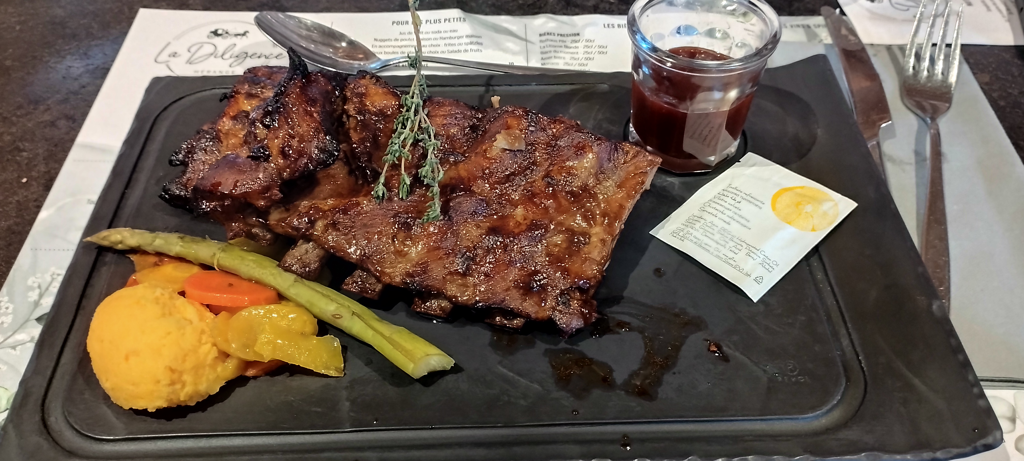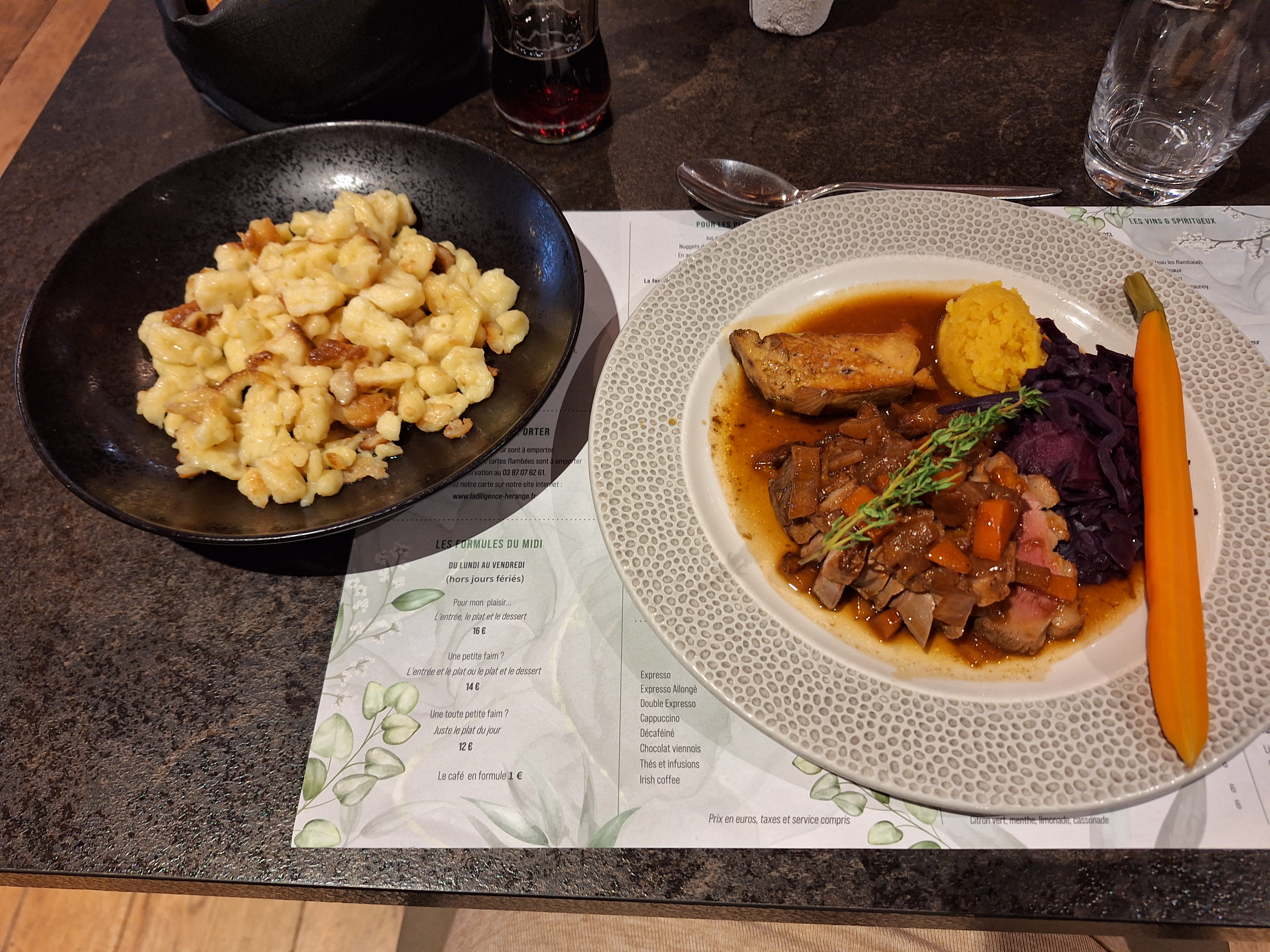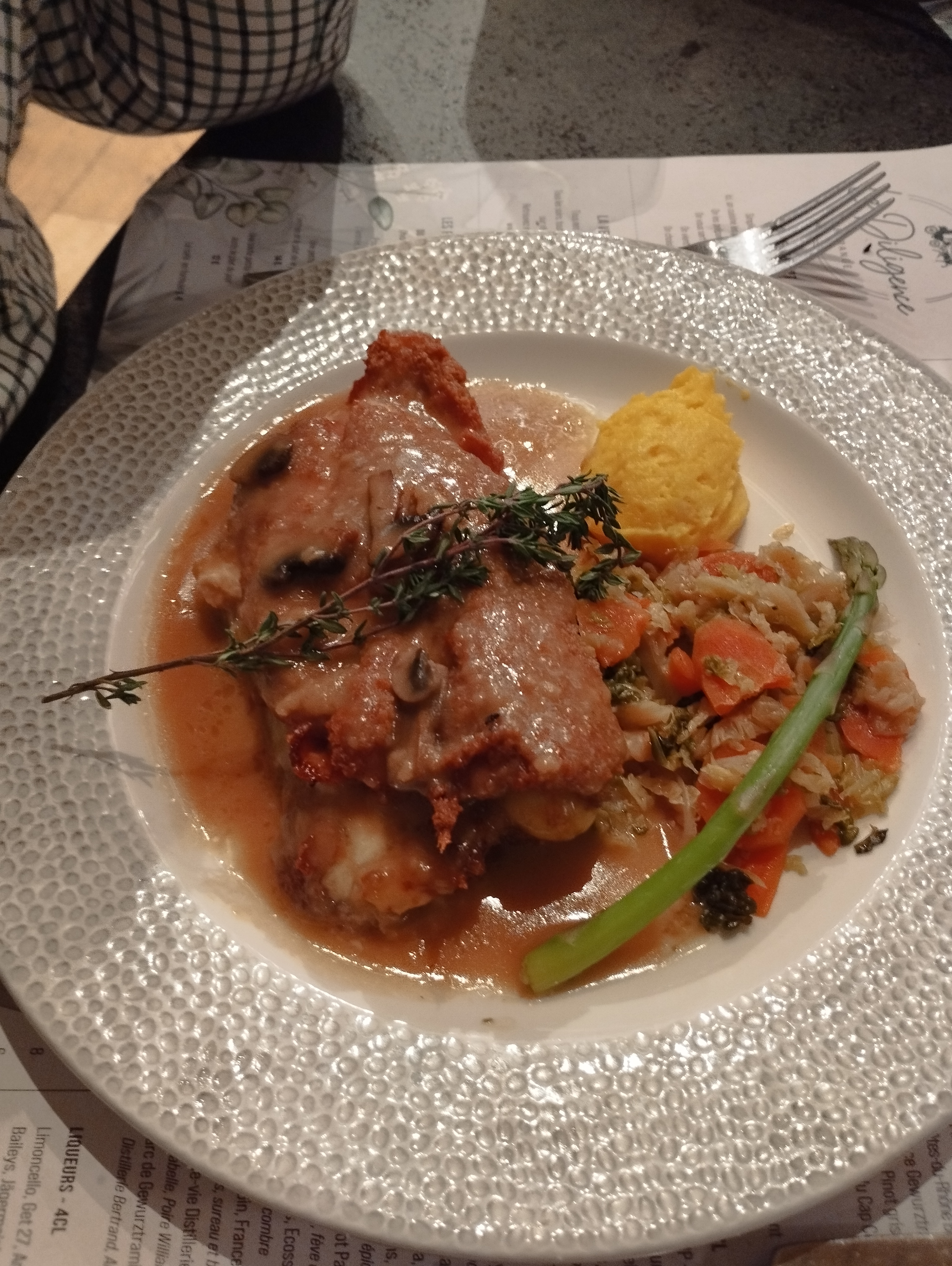 Croque-madame en entrée, Cuisse de canard avec des pommes grenailles. Pomme au four en dessert C'était délicieux ! Personnel sympathique et service rapide. Je recommande.