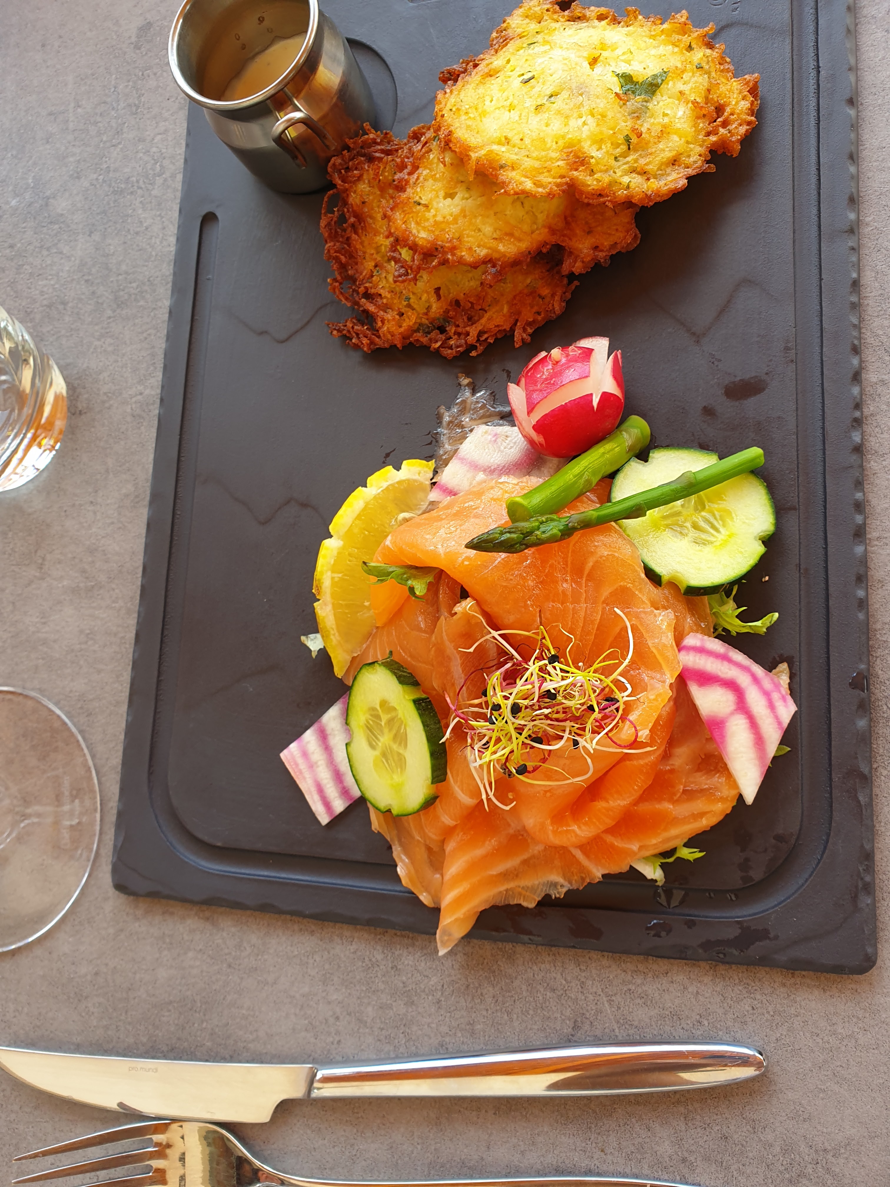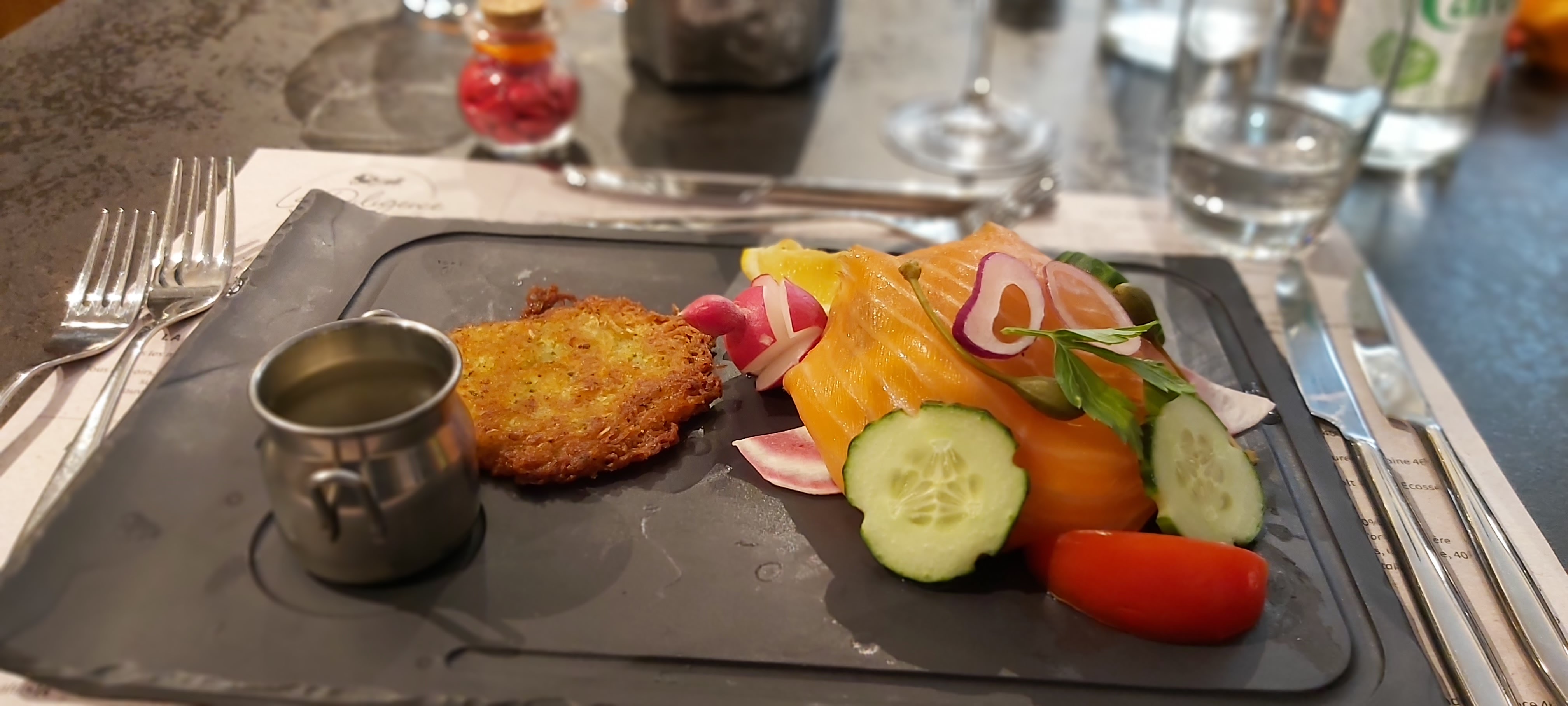 Accueil gracial, on a aussi eu le droit à un pffffff lorsque l'on nous a emmené à notre table. Cuisine bonne, même très bonne, on aurait aimé sur les plats à la carte une quantité un poil plus importante (je pense au Gravelax pour ma part qui était par ailleurs fort bon). Cabillaud impeccable, rien à redire. Desserts décevants. Service souriant et agréable, rien à redire de ce côté. Musique full années 70/80, je n'ai rien contre mais un peu de variation de style et de genre serait appréciable. Musique trop forte à mon goût également. Note dans la moyenne des environs, que je trouve plutôt dans la tendance haute dans la région. Un bon bilan, je ne suis pas convaincu au moment où j'écris si j'y retournerai ou non. Le temps fera son affaire. Il ne manque pas grand chose à parfaire pour en faire un succès plein. Je vous invite à faire votre propre expérience car on y mange bien.