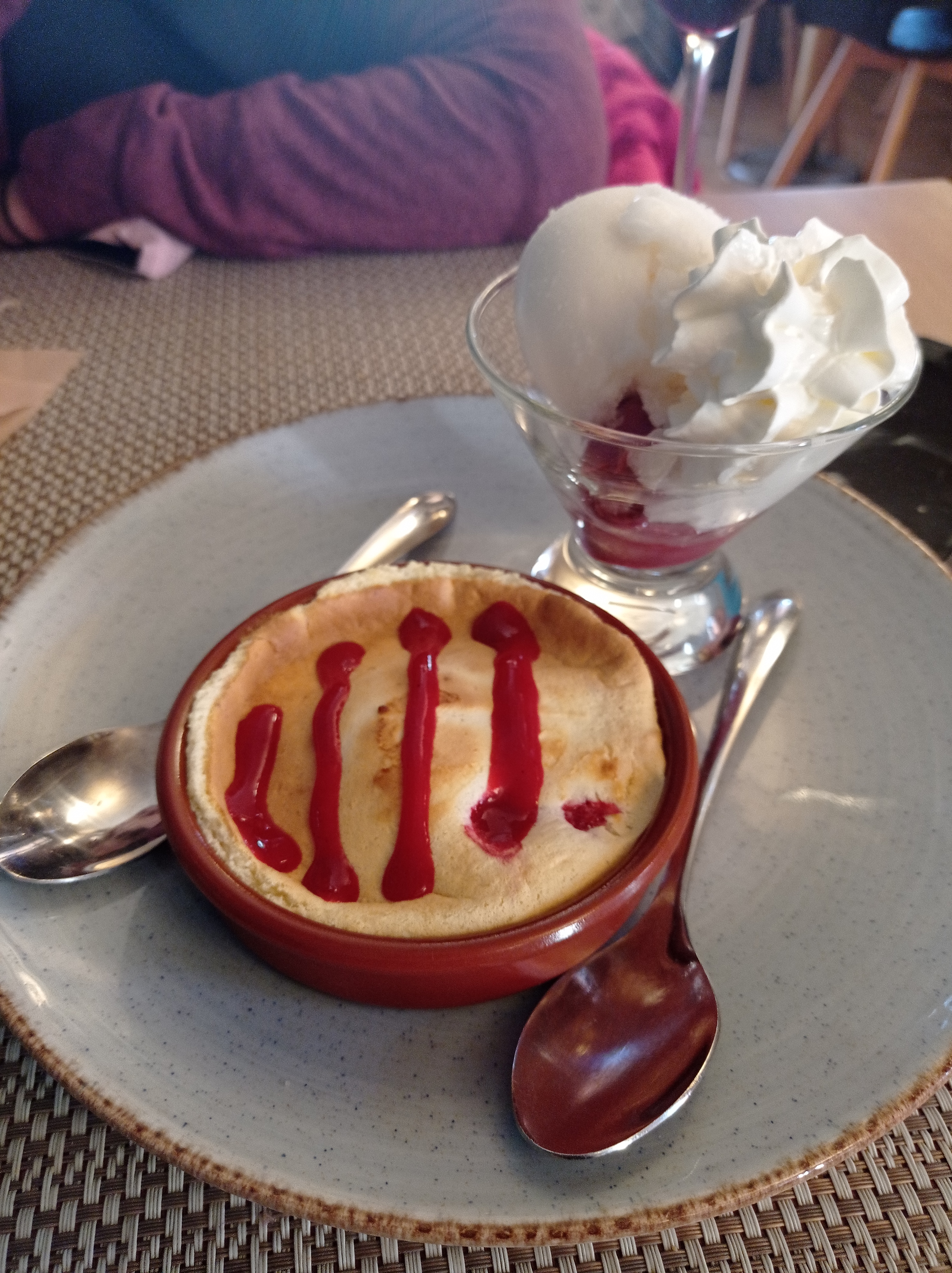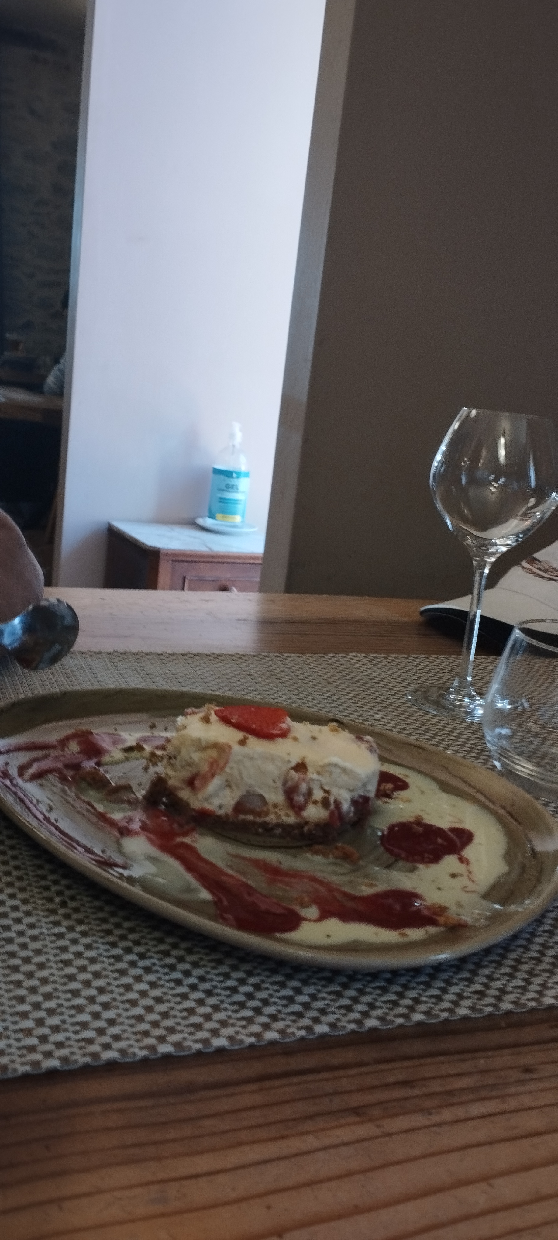 petite portion le suprême de pintade farci au fromage de chevre se transforme en une cuisse de pintade coupé en 3 (non désossé ) avec un peu de fromage dessus. le dessert roulé a la fraise , oui pas de S à fraises. une demi sur un roulé de génoise et l autre demi éparpillés dans la crème. pas le gout de fraises.. et avant tous ca un coca tranche( canette et non bouteilles verre) on a fini le repas au bout de 2h avec encore les verre de l apéritif et lez noyaux d Olive ( qui était tres bonne) dommage. le lieu est très sympa mais peut être que la reprise après ces long moi de fermeture est difficile. on retentera une autre fois