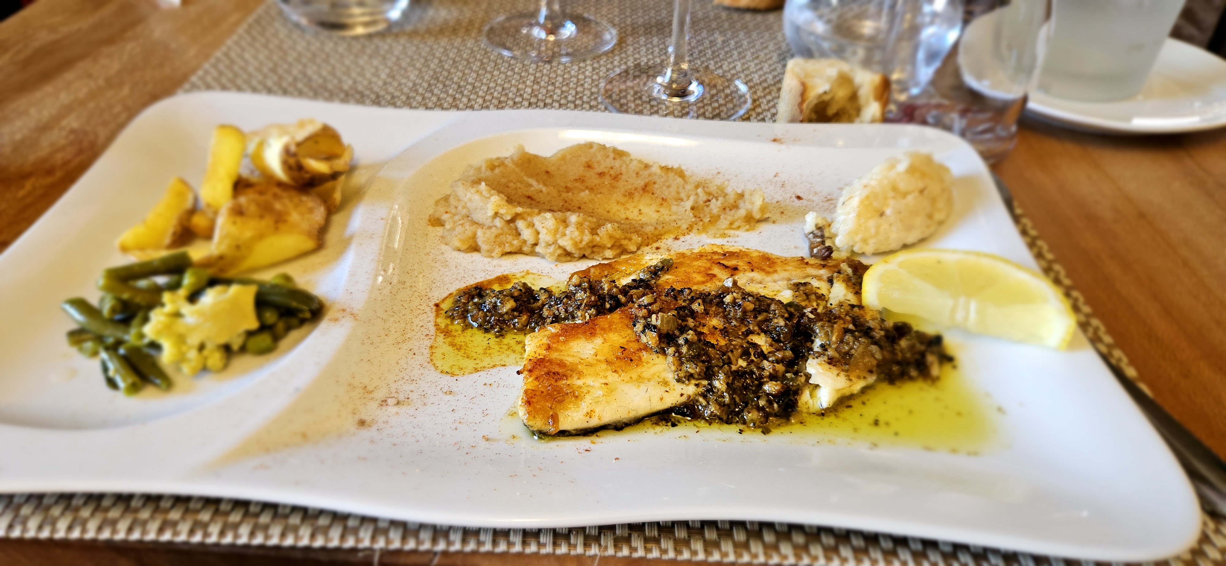 la table entre les toilettes et la cuisine est à déconseiller .... les clients de passage sont moins bien traités que les locaux... le verre de vin (de la même bouteille) est beaucoup mieux servi sur la table de locaux sur ma droite et mon dessert (profiteroles) au chocolat n'a pas de chocolat fondu contrairement à la table de gauche (locaux également)... deçu le feeling n'est pas passé expérience ratée à ne pas renouveler . La cuisine utilise de bons produits mais elle n'est pas d'une grande inspiration