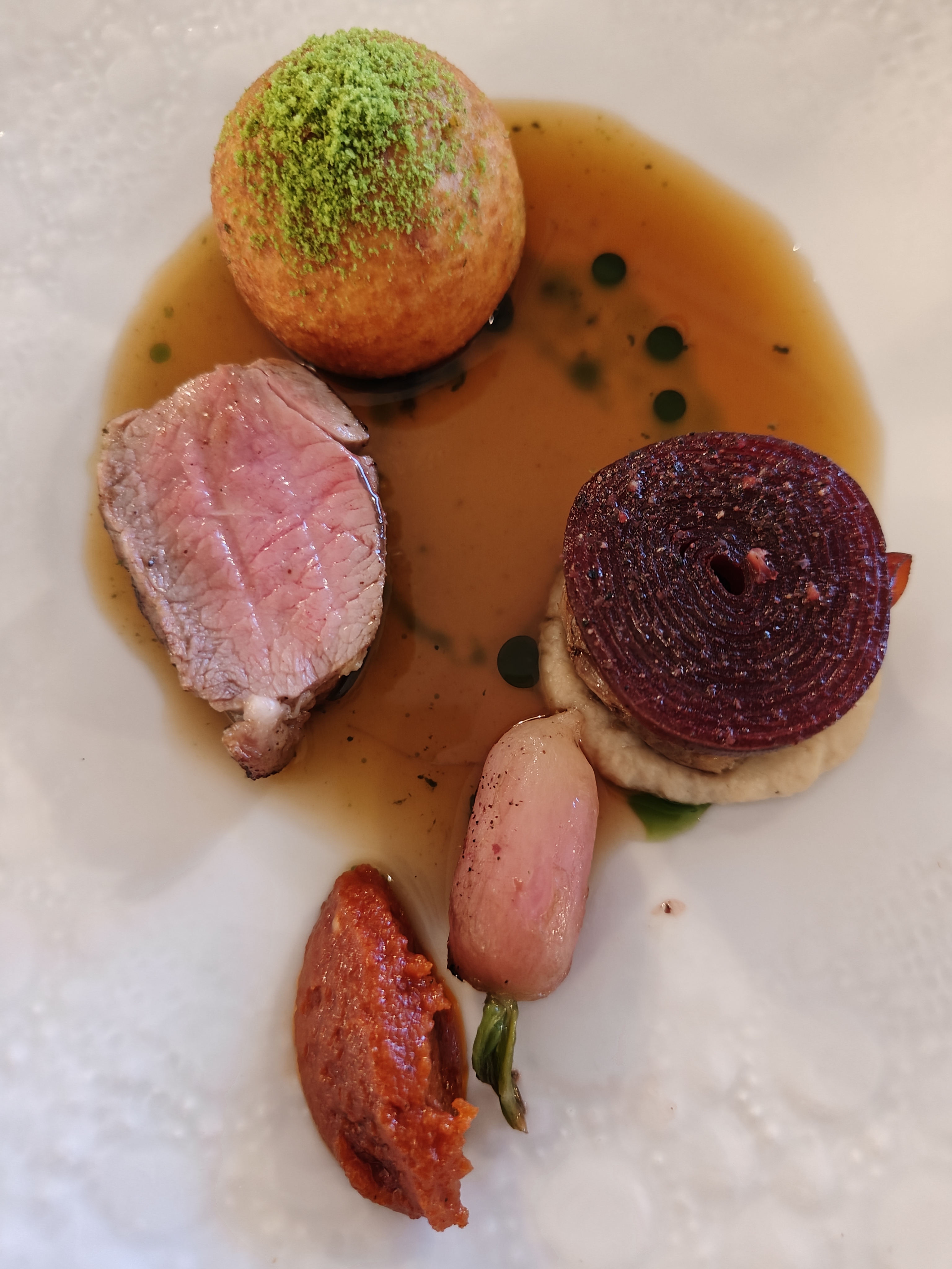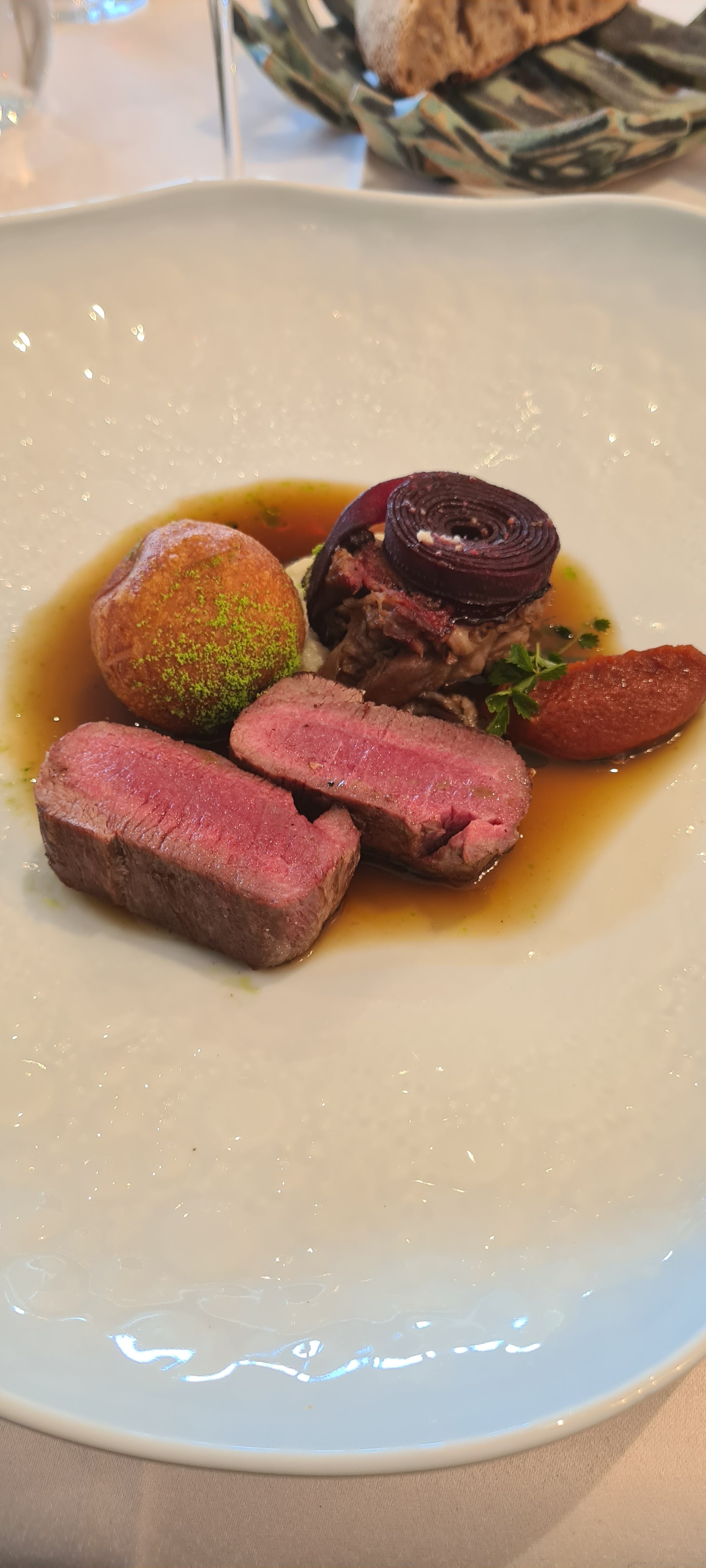 Une merveilleuse adresse ! Nous avons pris des plats à la carte : en entrée foie gras et saint Jacques bons puis cerf et veau absolument délicieux. La présentation des mets est originale avec un très beau design dans l’assiette. Le service est impeccable avec une maîtresse de maison pétillante et adorable. Conclusion, une très bonne table. Je recommande les yeux fermés. Respect des allergies.