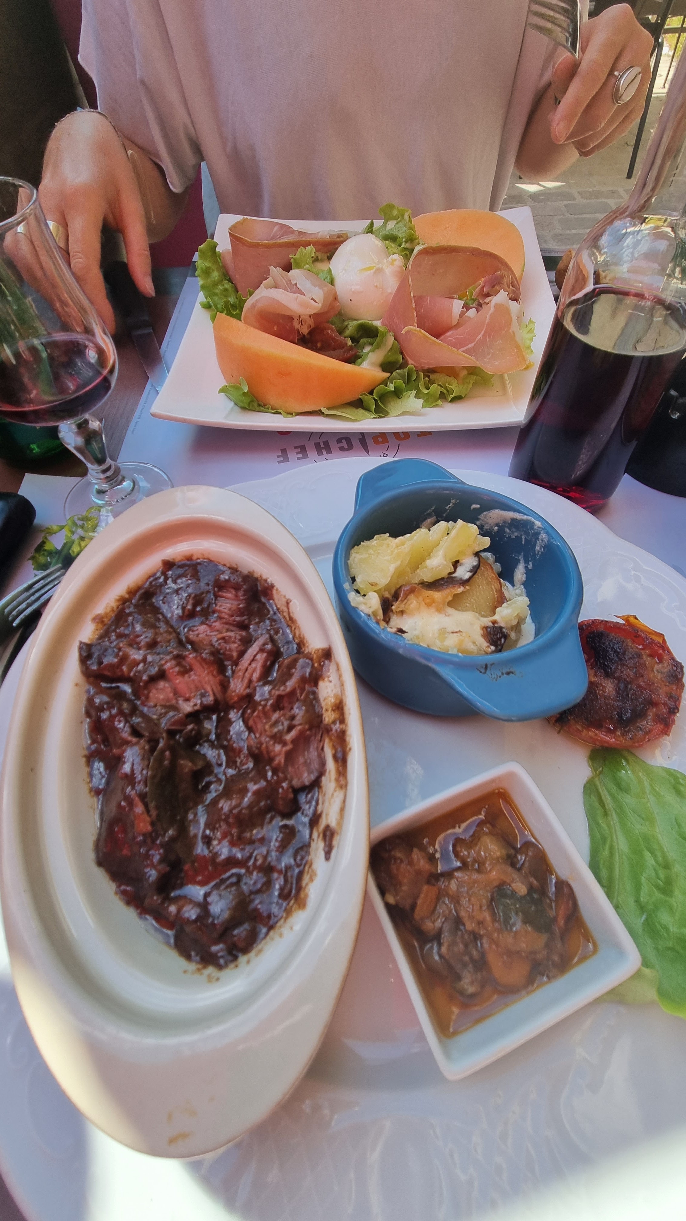 Très bon repas de fête des mères : jambon cru et melon, une belle assiette, un jarret d'agneau confite et ses légumes, un tiramisu. Le tout servi en terrasse avec vue sur le village de Lacoste et le Mont Ventoux. Coup de chapeau à la serveuse qui a servi seul et avec le sourire.