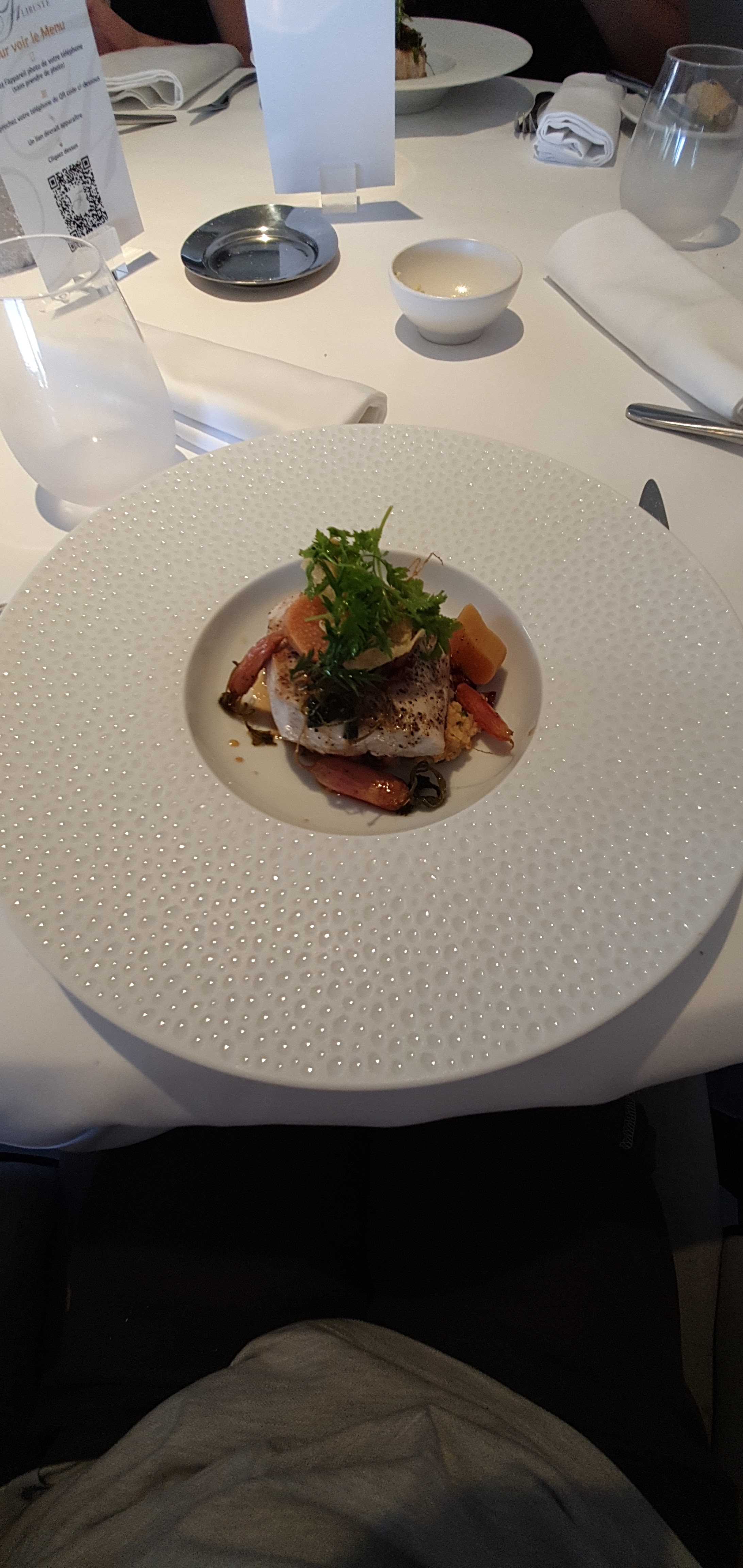 Un peu déçu du restaurant, nous sommes en voyage en Europe, grand fan de gastronomie, nous avons fais plus de 10 restaurant avec mention du Guide Michelin, celui ci étant mieux que coté que d'autre mais était beaucoup moins savoureux que les autres, aucun wow. Le restaurant est magnifique, les mets sont beau visuellement, mais les goûts son fade, peux gouteux et ne s'harmonisent pas d'un service à l'autre, quelque s'un était même mal exécuté (croute de poulet et poisson molasse, granité en gros morceau, on a du le réduire nous mêmes en plus petit morceau) l'expérience 6 services n'est pas a son top. Un sourire sur le visage des serveurs ne serait pas de trop non plus, service pour les consommations plus tôt lente, le service pour les repas était génial par contre (ce sont 2 personnes différentes qui font les services)