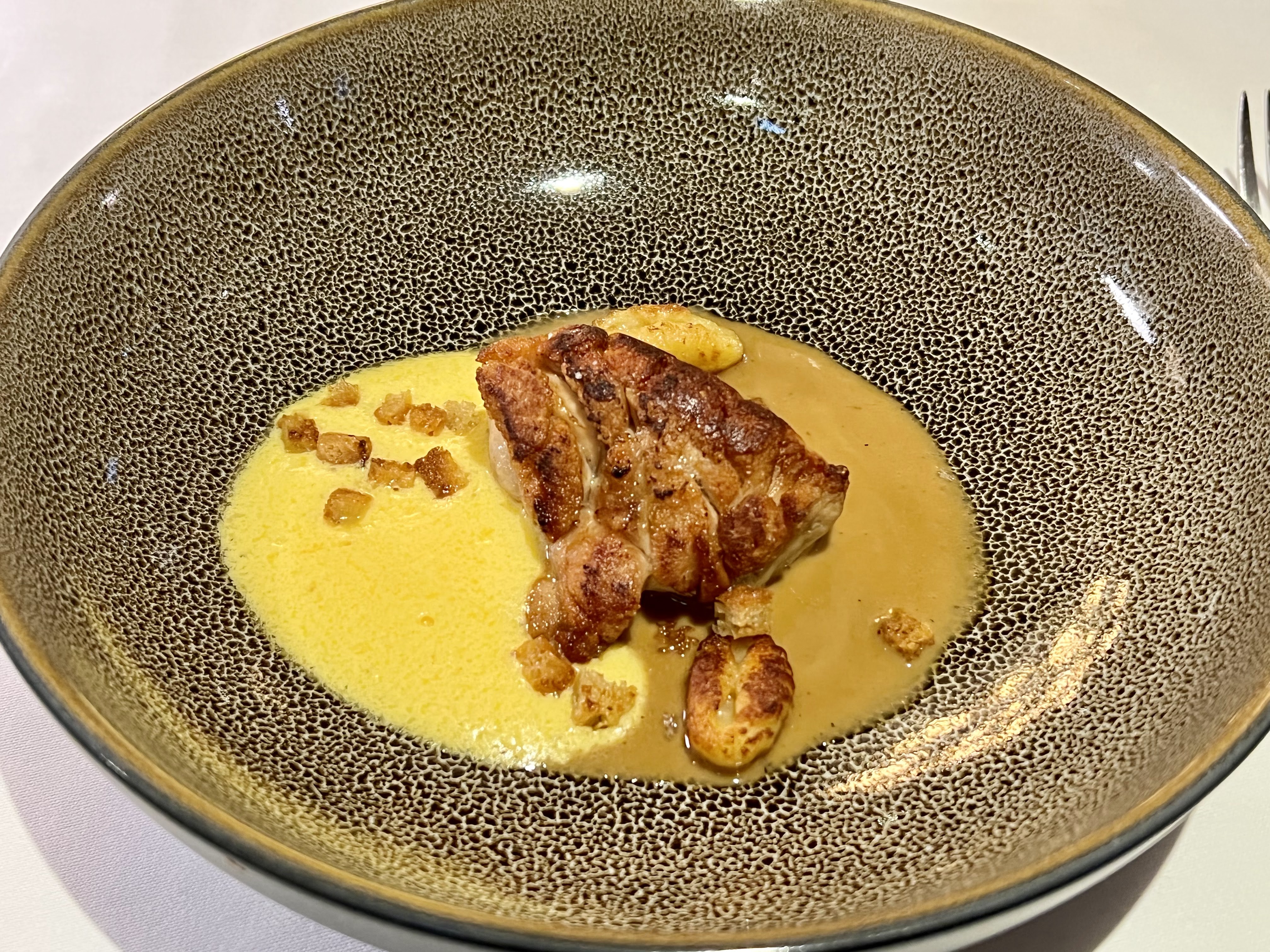 Une excellente soirée dans ce très bon bon restaurant, avec un service très professionnel. Les plats sont raffinés, avec des combinaisons de saveur parfois novatrices. Les cuissons, notamment du turbot sauvage, ou du pigeon, sont parfaitement maîtrisés. De l'entrée au dessert, dans un menu 6 plats à 88 euros, sur l'inspiration du moment du chef, tout est parfait. Et le chef est une femme. Bravo
