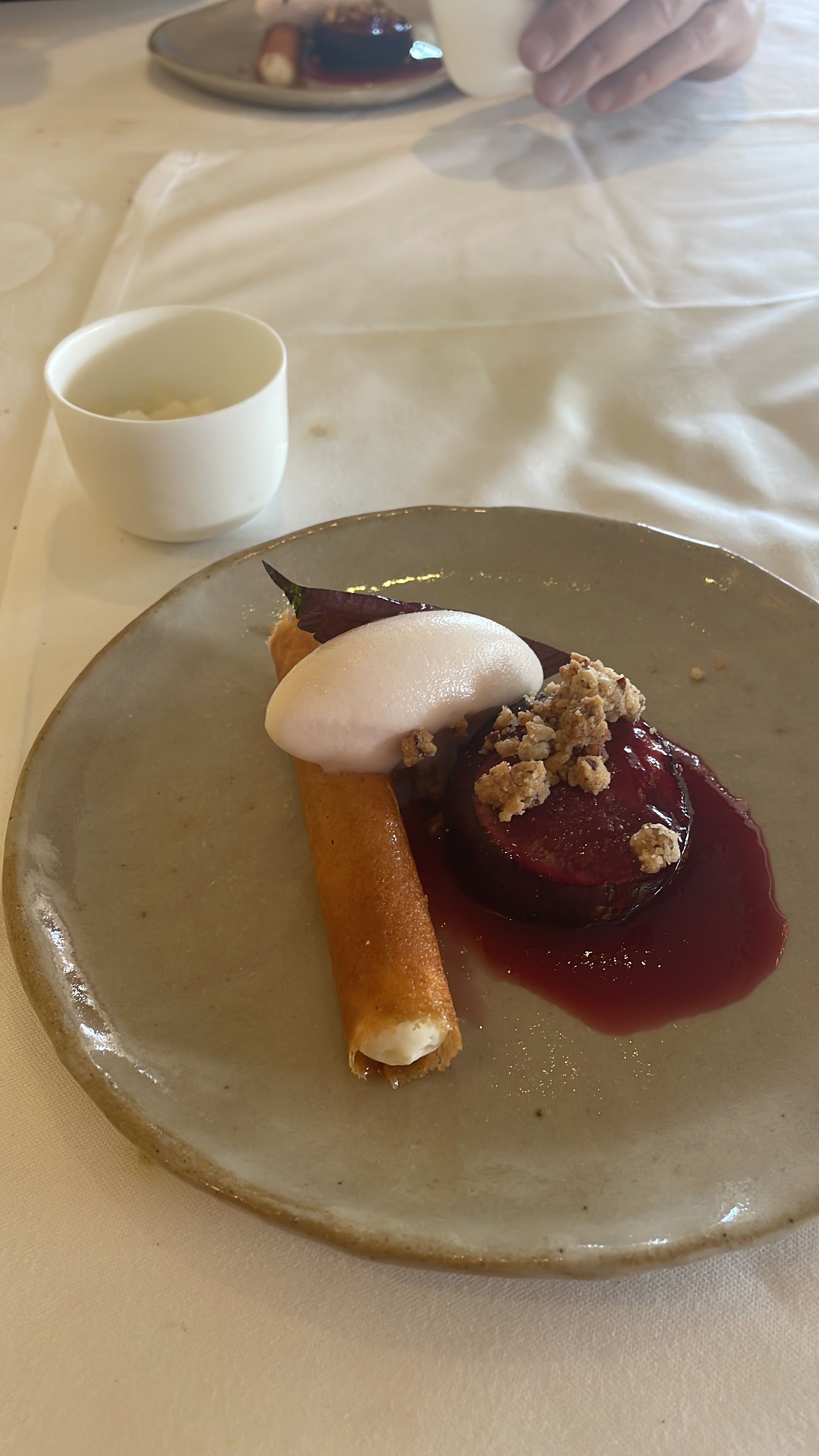 Pour nous remercier de notre fidélité, la Cheffe nous a fait l'honneur de nous cuisiner un plat de sa nouvelle carte d'autonome, en avant première : le ris de veau laqué avec un jus de betterave puis roulé dans une chapelure de cacao. Une surprise. Un délice. La betterave comme je l'ai jamais mangée. Une justesse dans l'accord des saveurs, toujours au rendez-vous. Ce nouveau plat confirme que ce restaurant sera sans aucun doute The Place to be dans un futur proche. Un accueil toujours aussi chaleureux et professionnel. Bravo à toute l'équipe.