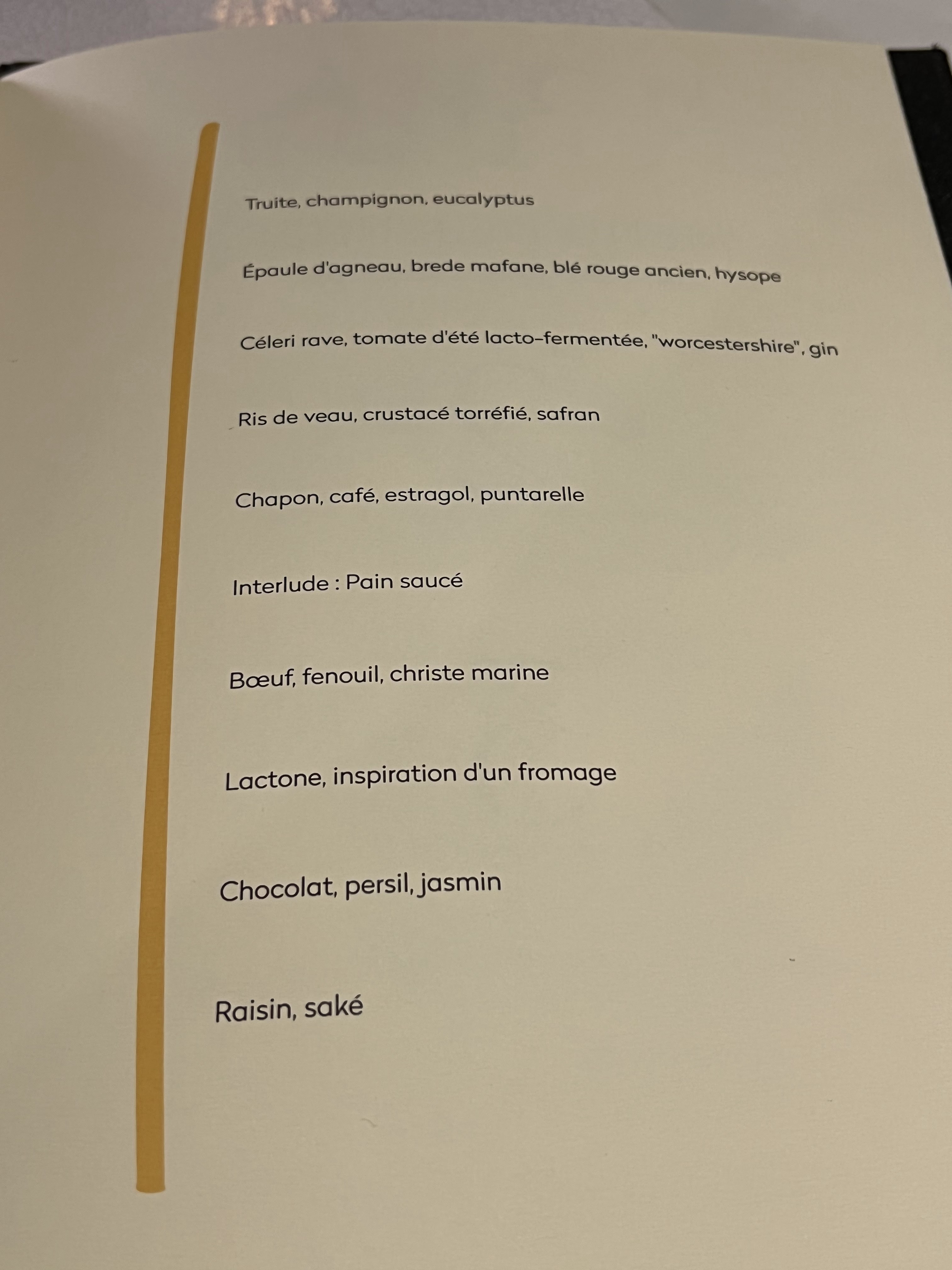 Excellente cuisine...mais déçu que le menu (caché) soit exactement le même qu'il y a un mois.Le concept vendu d'adaptation quotidienne aux fraicheurs du marché paraît farfelu...