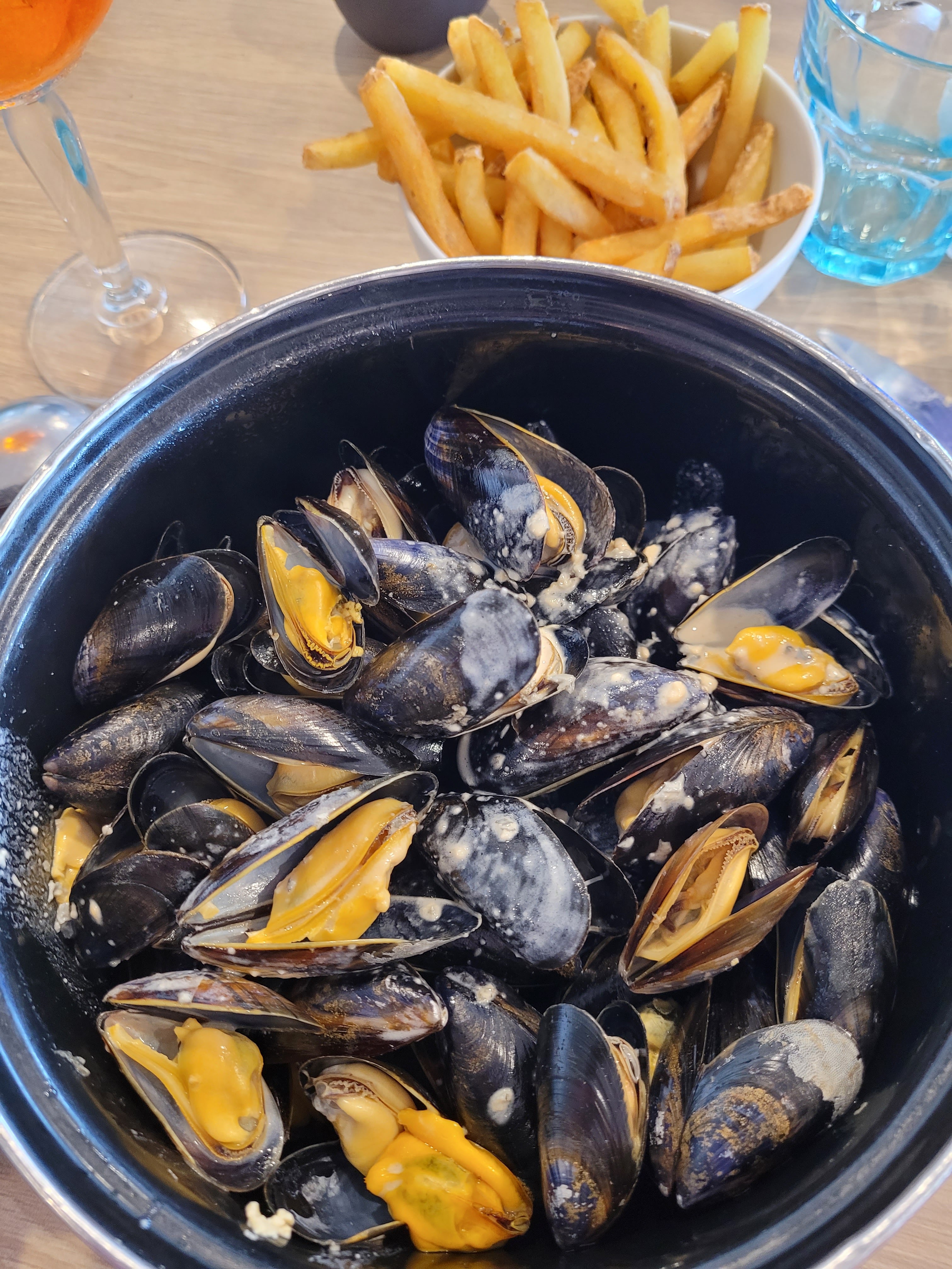 Four of us had moules-frites. So tasty! They have a plain version, moules-frites with cream and garlic, moules-frites with cream and bacon and moules-frites with blue cheese. We tried them all. Really high quality mussels and the price is good. We also ordered 9 oysters which were delicious. The potato fries were also amazing. I would definitely recommend this restaurant.. Quatre d'entre nous avaient des moules-frites. Si savoureux! Ils ont une version nature, des moules-frites à la crème et à l'ail, des moules-frites à la crème et au bacon et des moules-frites au bleu. Nous les avons tous essayés. Des moules de très haute qualité et le prix est bon. Nous avons également commandé 9 huîtres qui étaient délicieuses. Les frites de pommes de terre étaient également incroyables. Je recommanderai certainement ce restaurant..