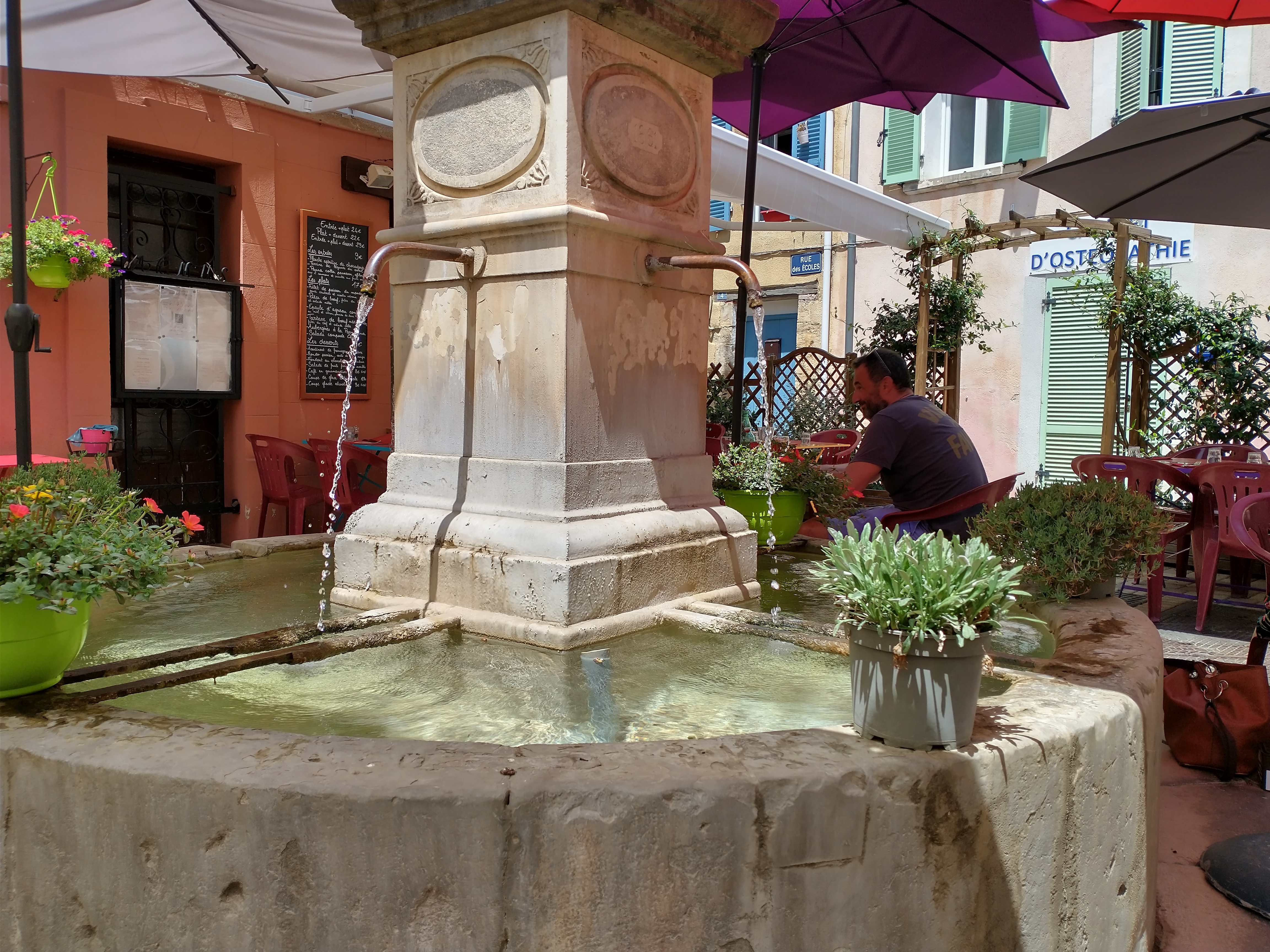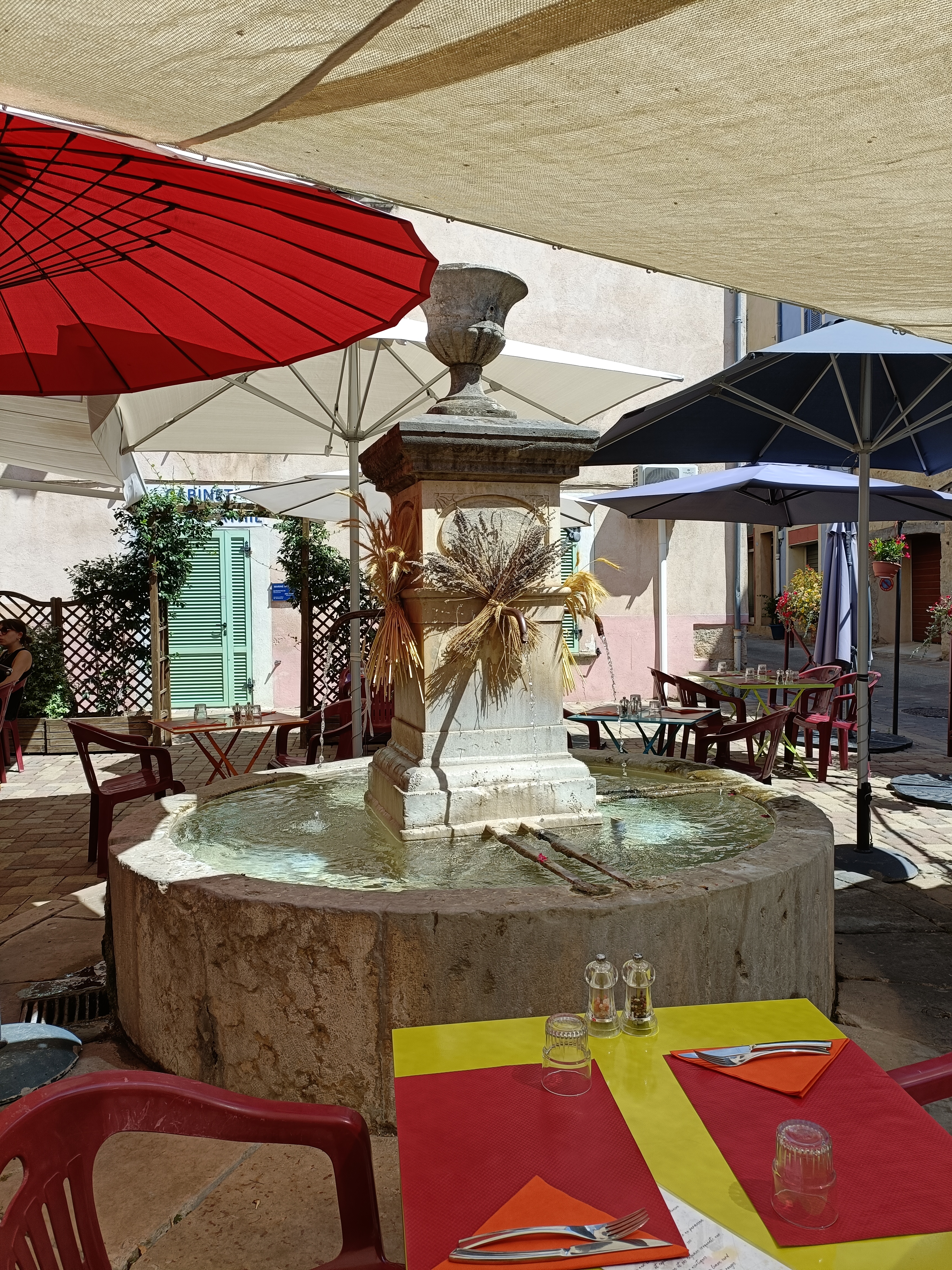 Emplacement idéal à côté d'une fontaine, bonne restauration, une vraie soirée en Provence.