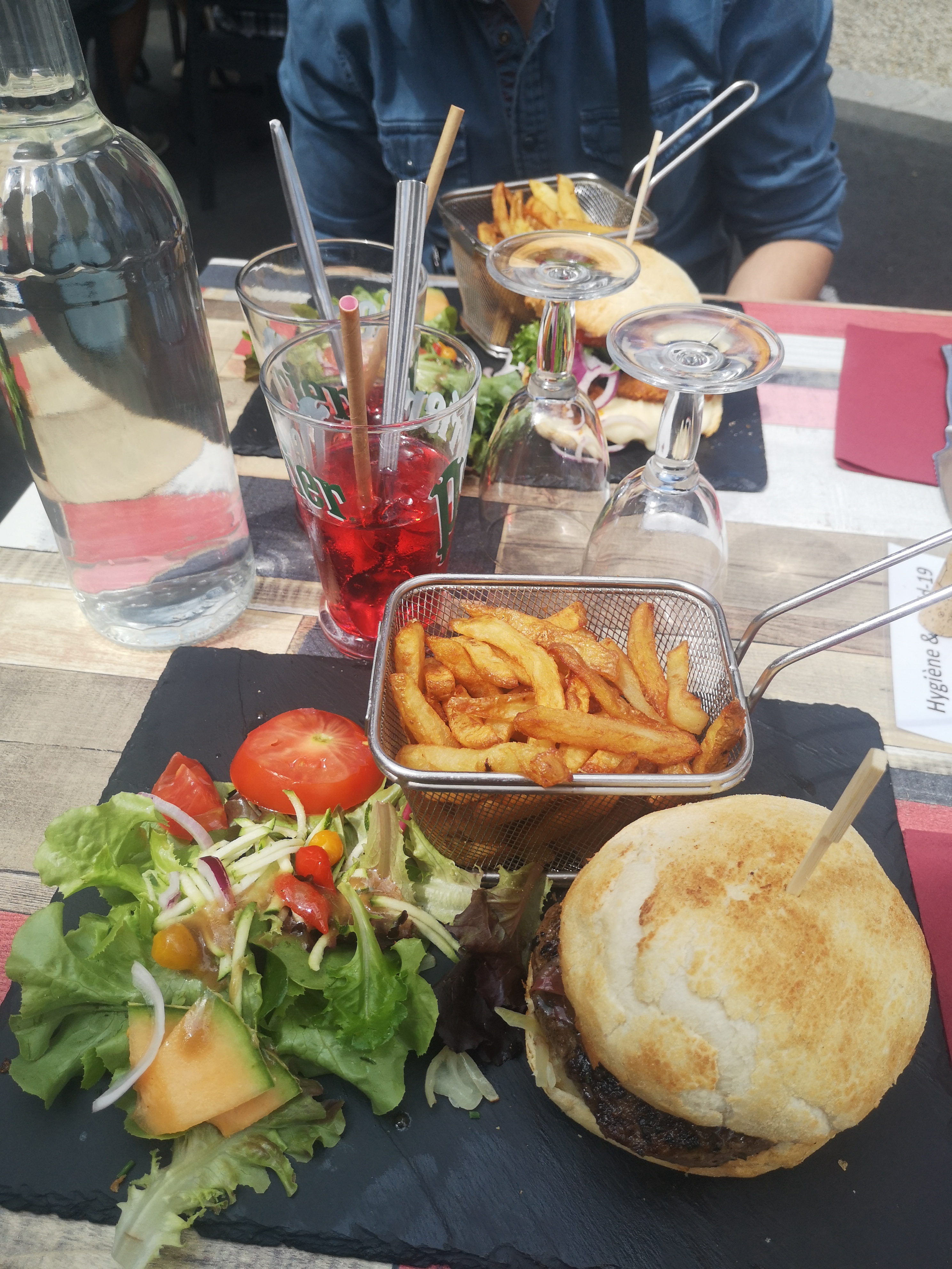 Bon décors, emplacement central sans l'inconvénient du passage des voitures, plats variés, Je n'ai pas goûté les pizza mais elles ont l'air bonnes. Le service est bon, rapide et agréable, les burgers sont très bon, le pain un peu trop classique à mon goût, un peu trop brioché, et les frites étaient exelentes. Le moment fût agréable et le prix raisonnable.